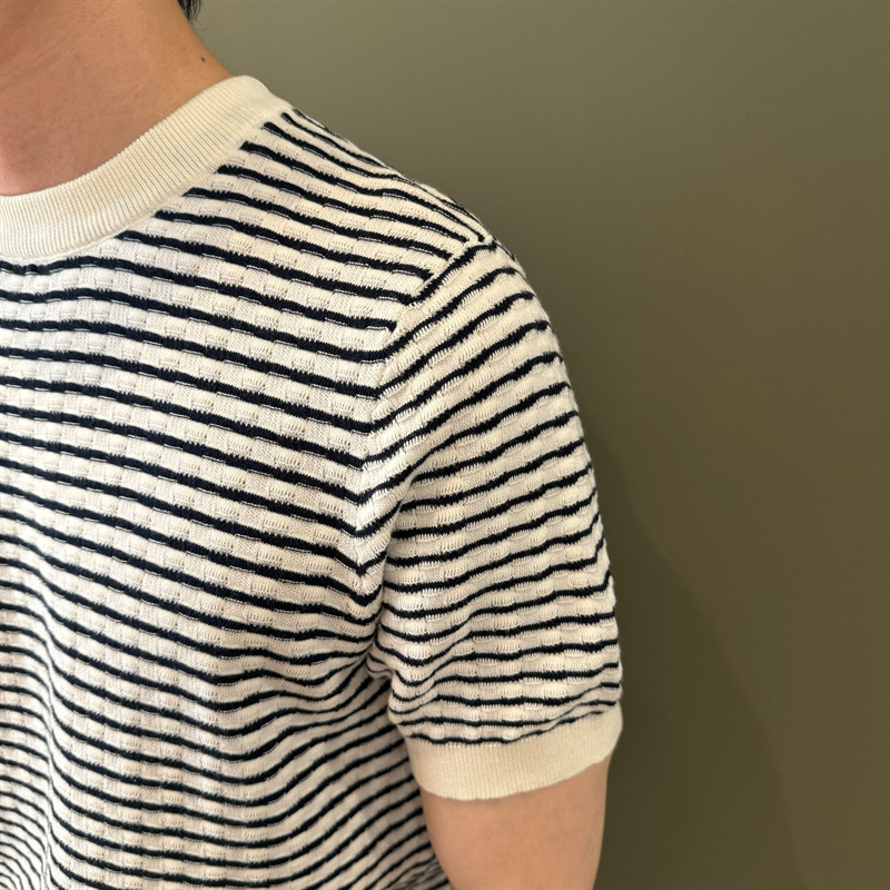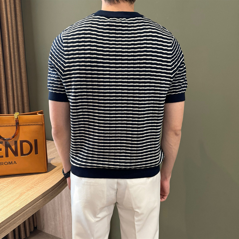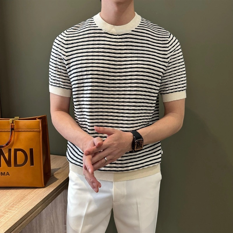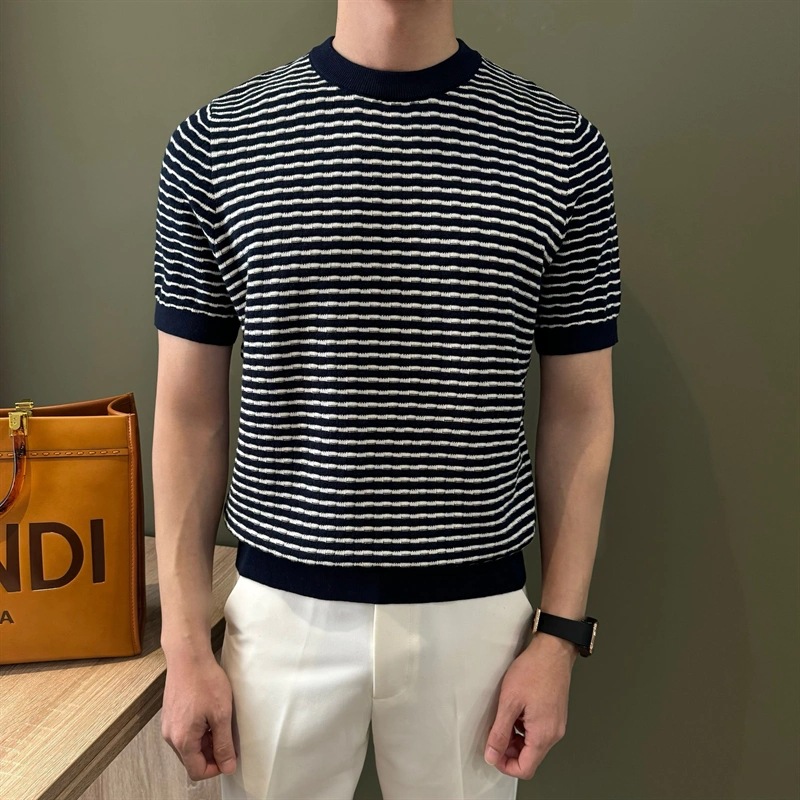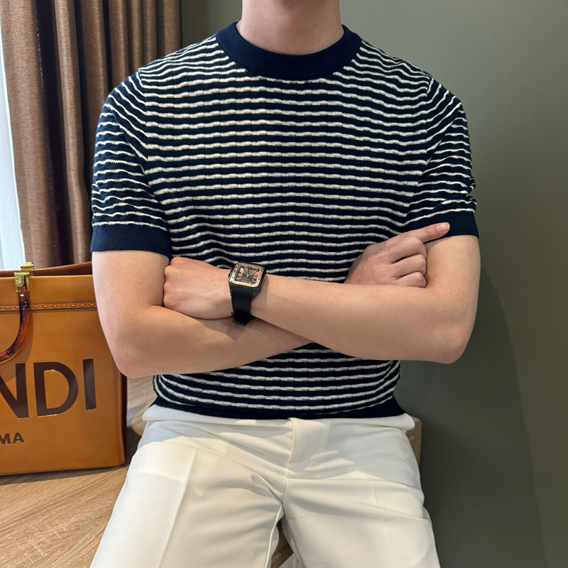 여름 반팔 라운드 넥 남성용 스웨터, 가벼운 럭셔리, 통기성, 피부 친화적인 자카드 스트라이프 대비 컬러 스웨터, 남성용 스웨터, 바닥 셔츠스토어 가기