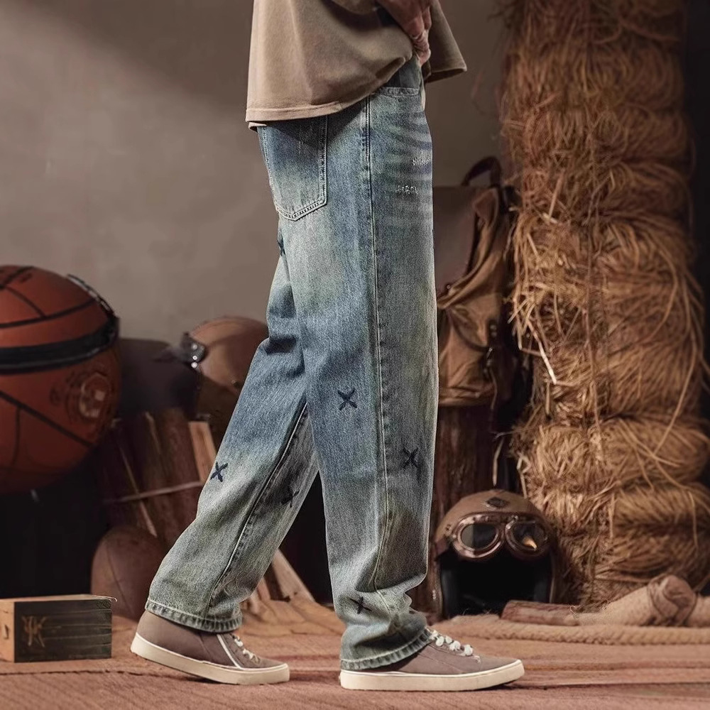 아메리칸 스타일 하이 스트리트 자수 스트레이트 팬츠 세탁 청바지 남성 하이 스트리트 트렌디 브랜드 레트로 루즈 캐주얼 바지
