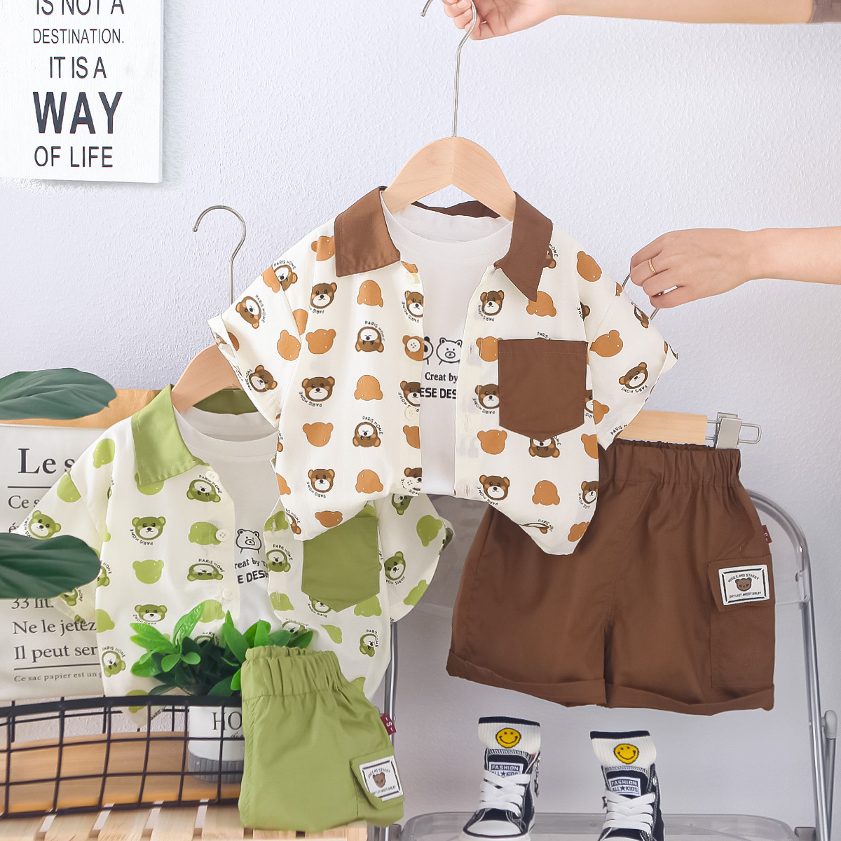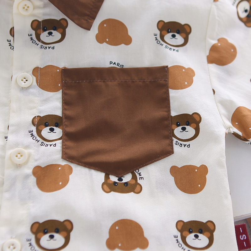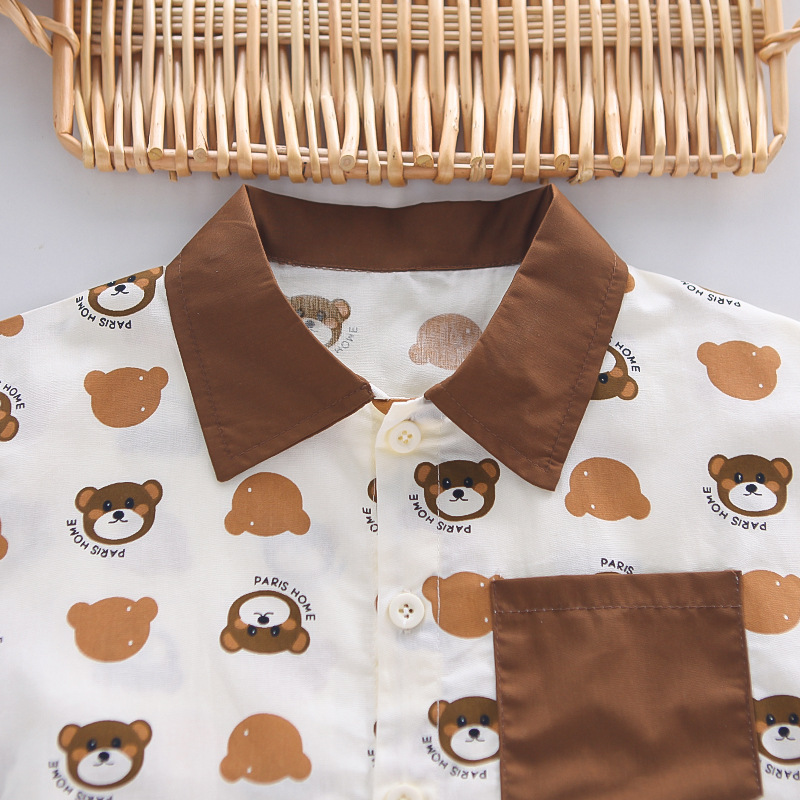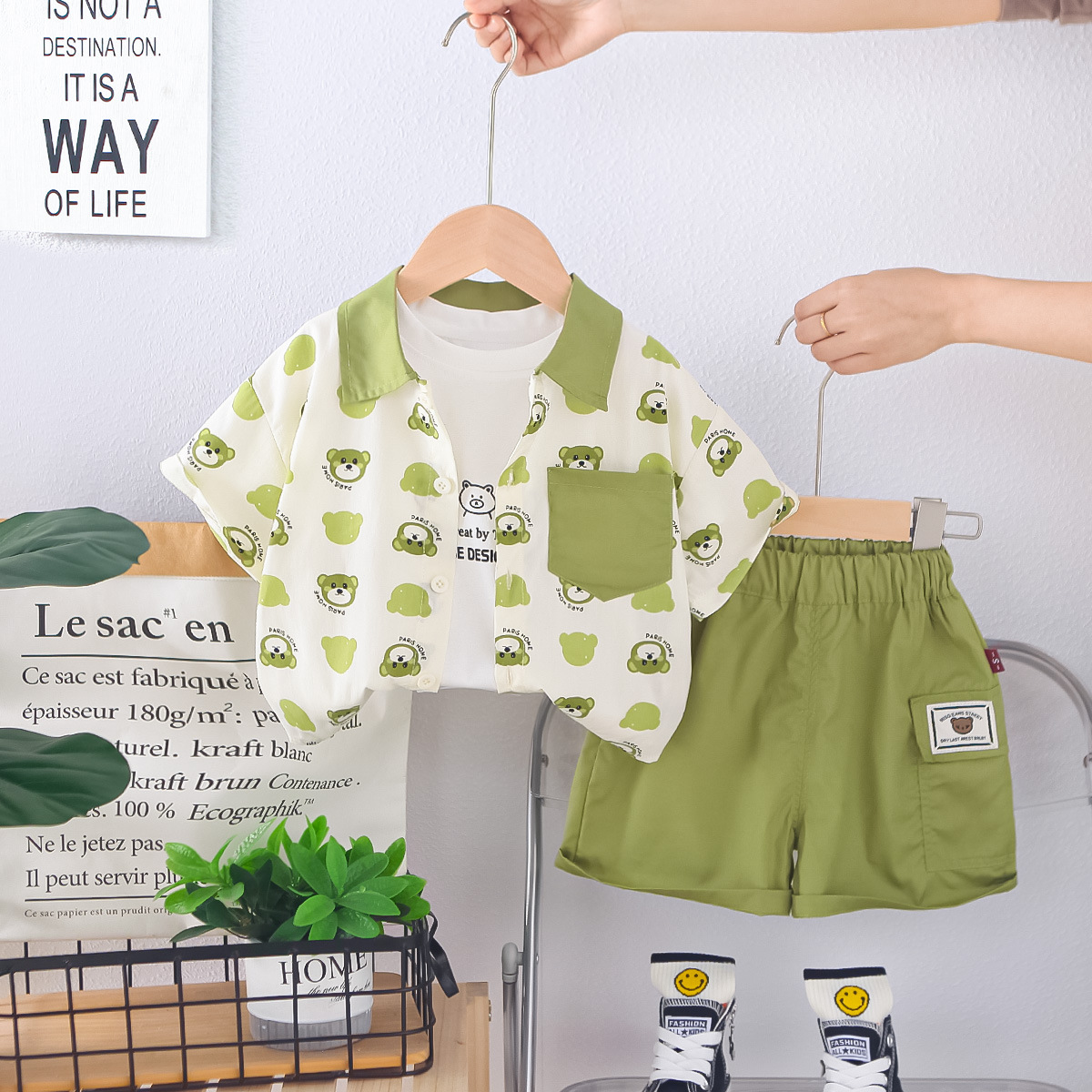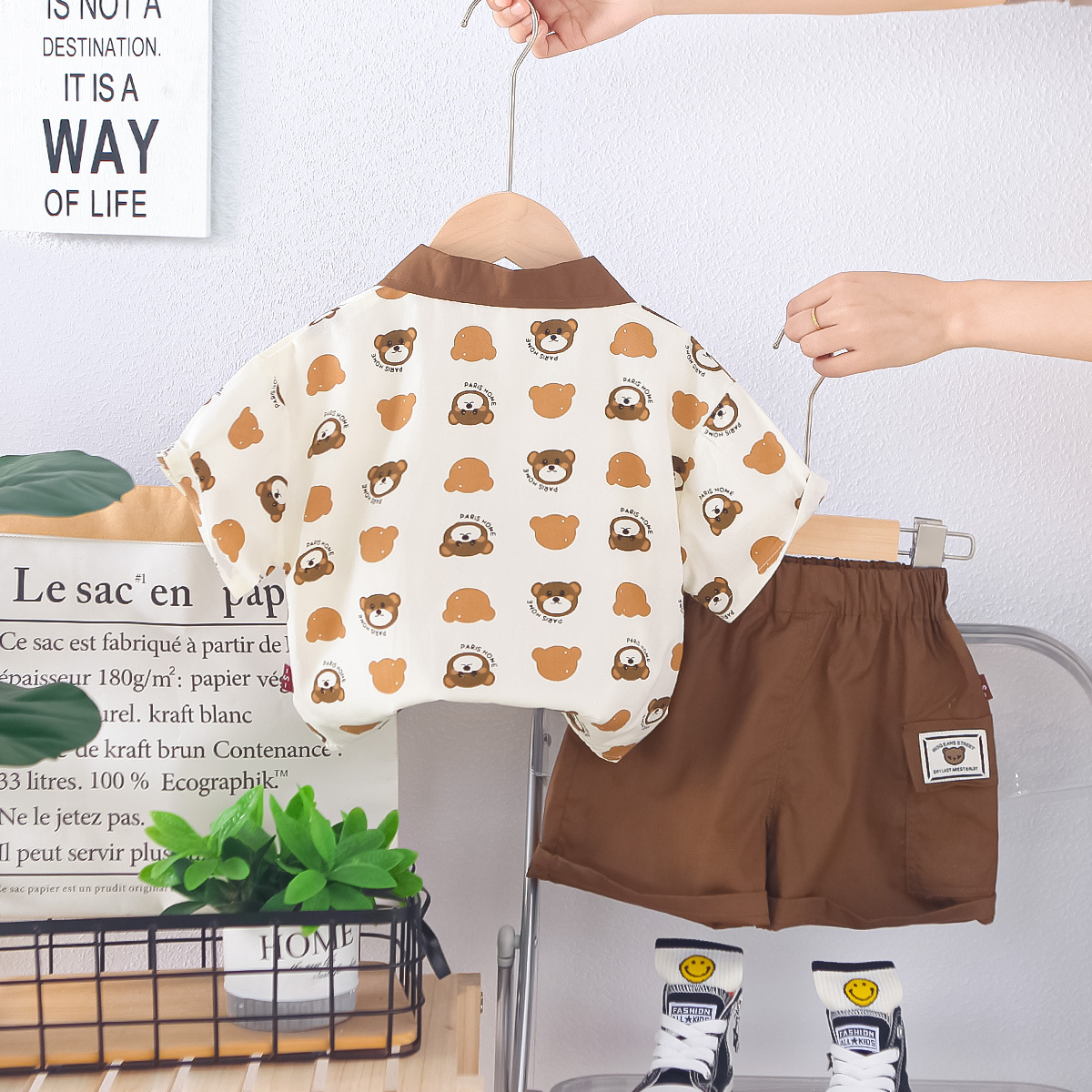 새로운 어린이 소년 여름 스타일 전체 인쇄 곰 머리 셔츠 반팔 3 피스 세트 유행 2025 소년 여름 정장