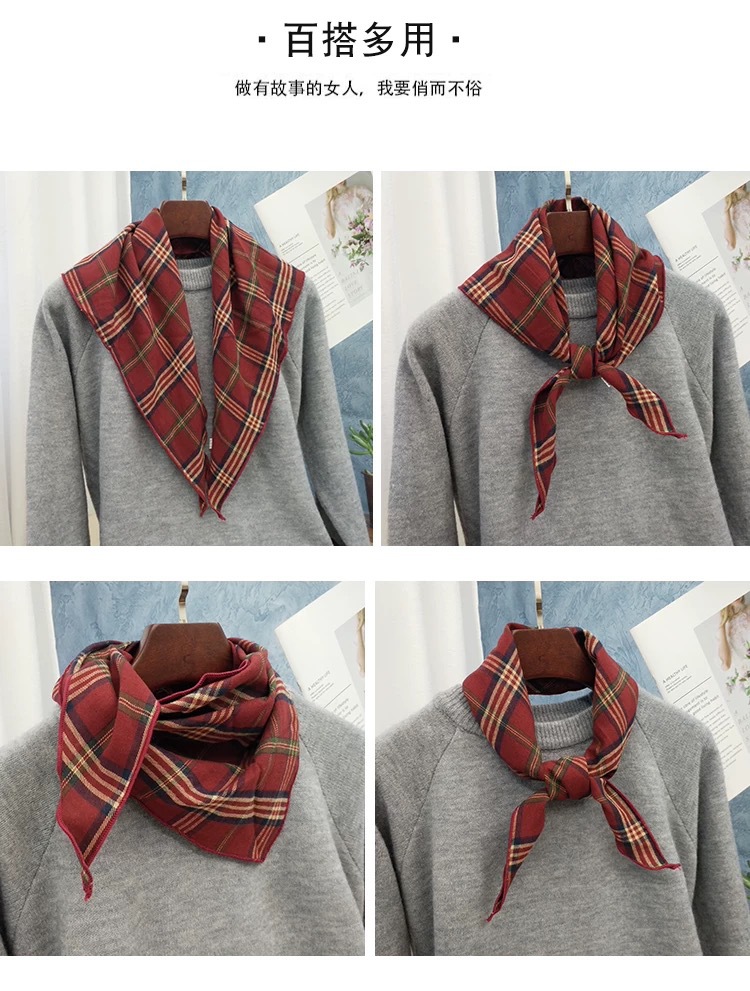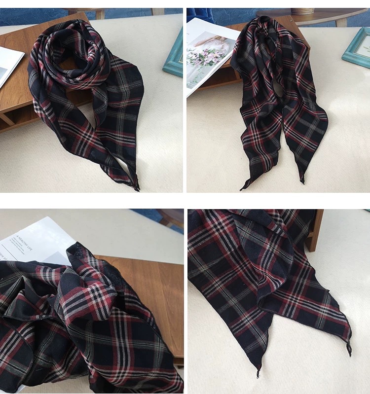 국경을 넘는 일본과 한국의 새로운 면화 및 리넨 플레이드 봄 및 가을 삼각형 스카프 여성의 목가적 스타일 스카프 다기능 액세서리