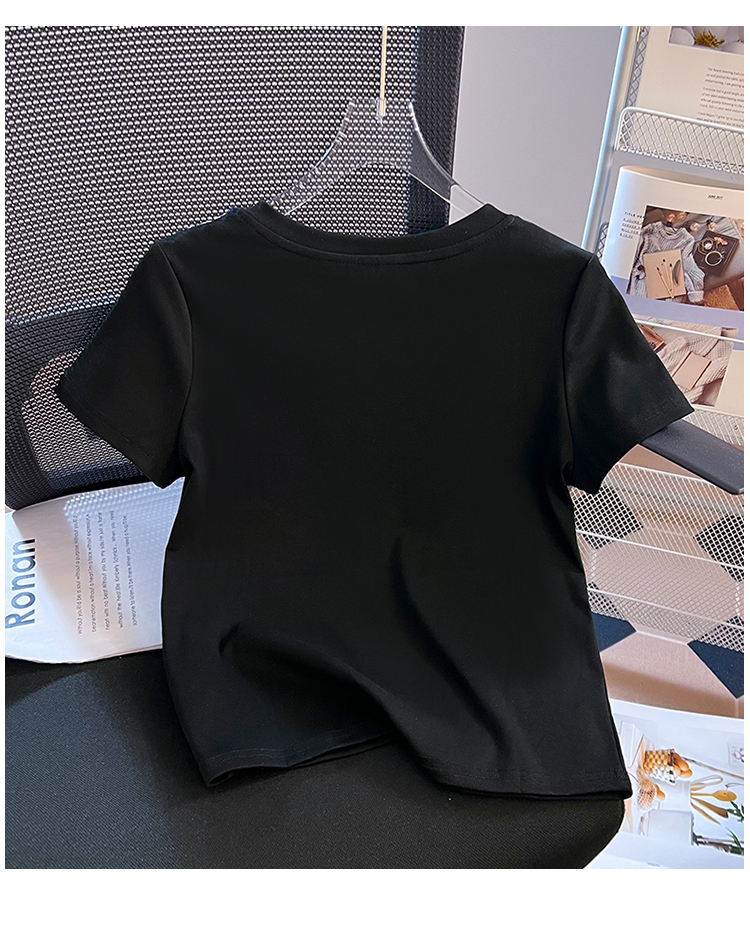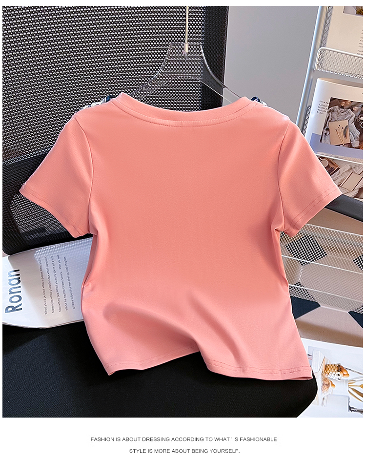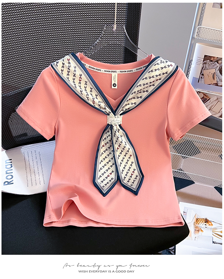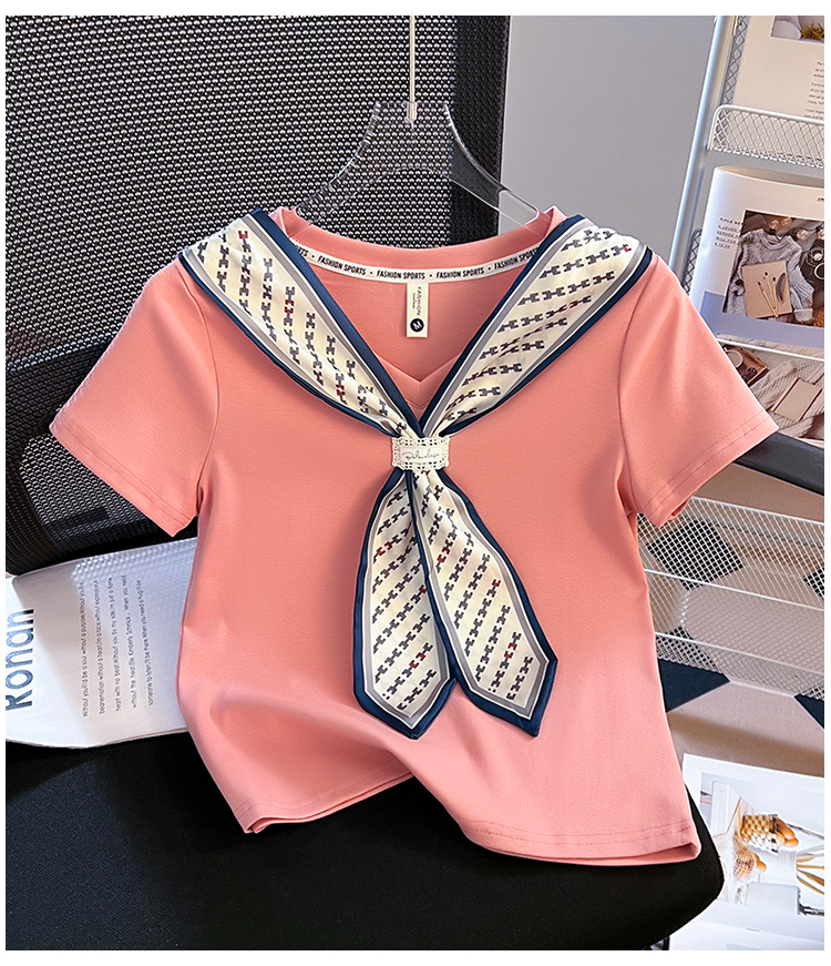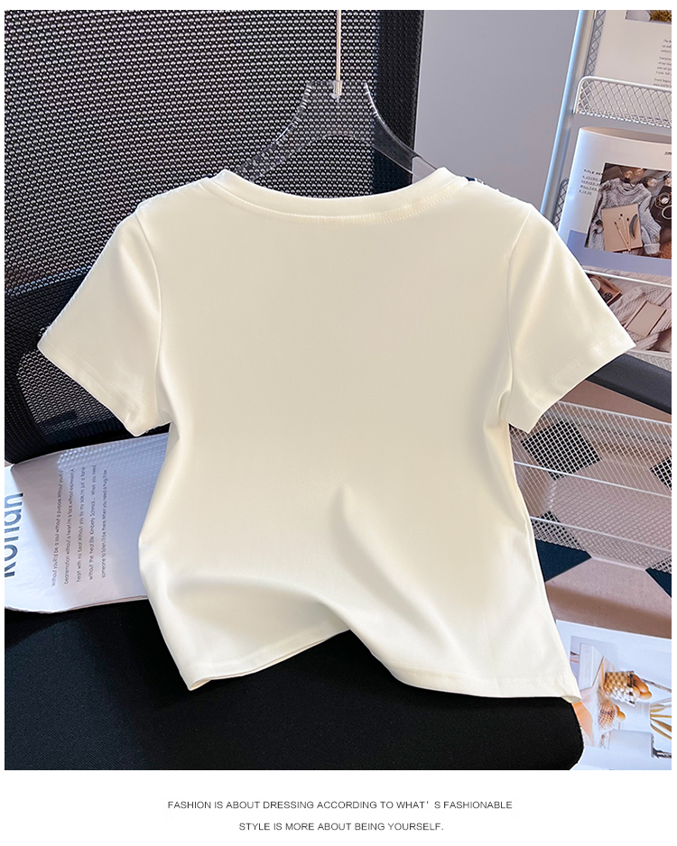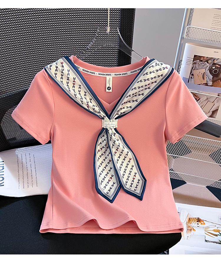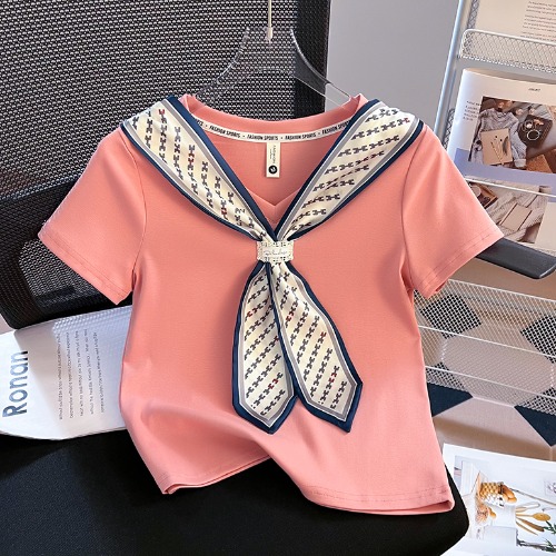 어깨 목도리 반팔 V 넥 티셔츠 여성용 2025 년 새 여름 틈새 세련된 코튼 화이트 슬림 핏 쇼트 탑
