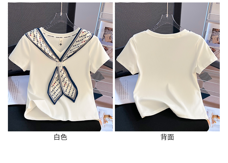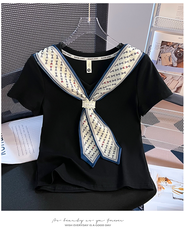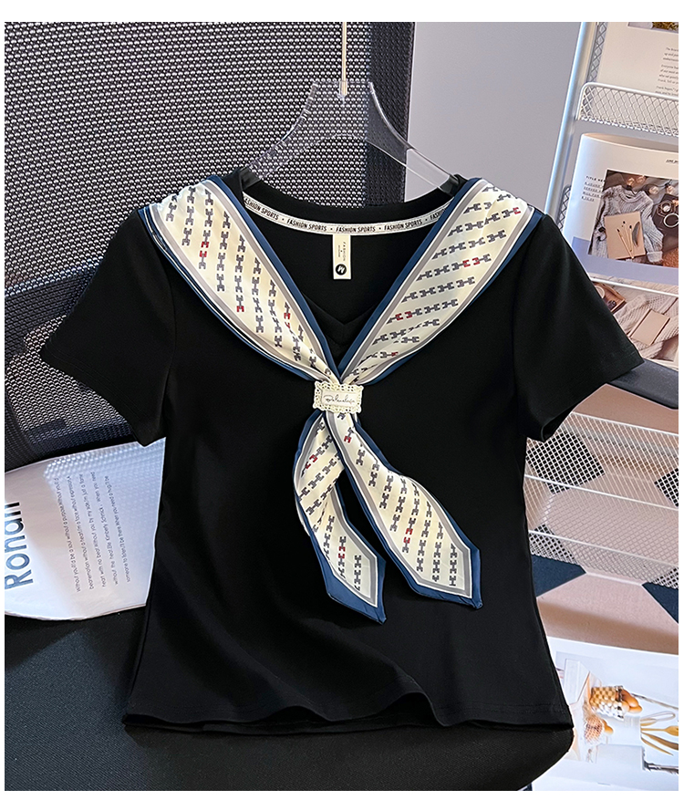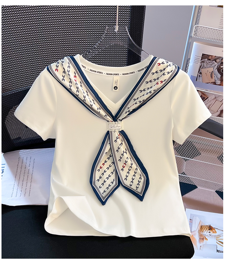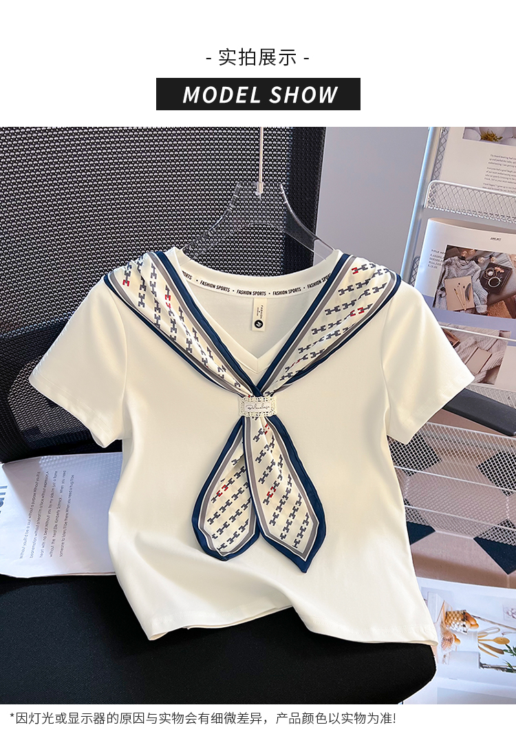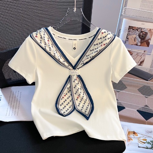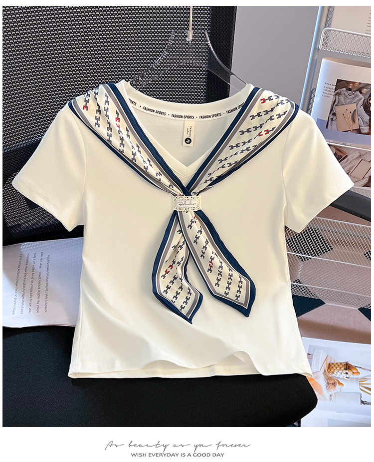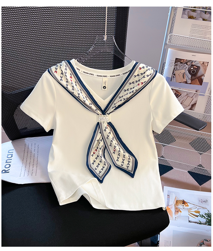 어깨 목도리 반팔 V 넥 티셔츠 여성용 2025 년 새 여름 틈새 세련된 코튼 화이트 슬림 핏 쇼트 탑스토어 가기