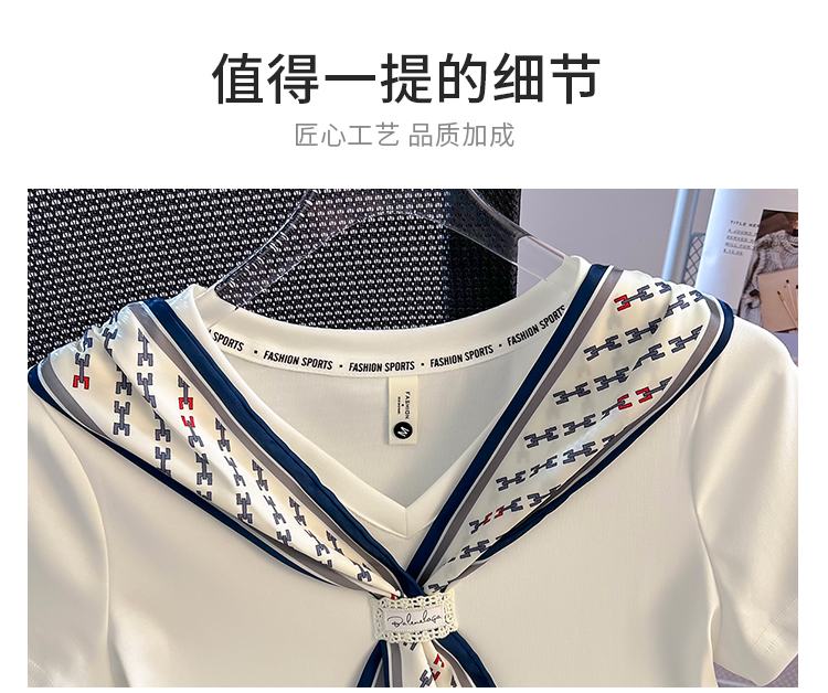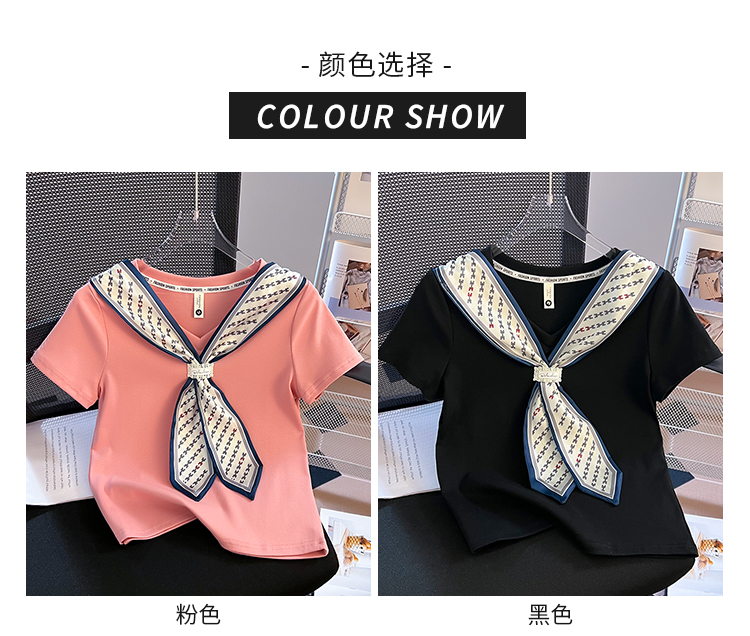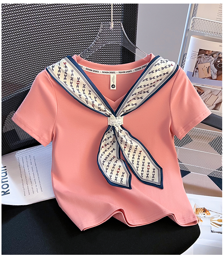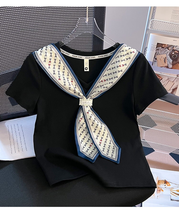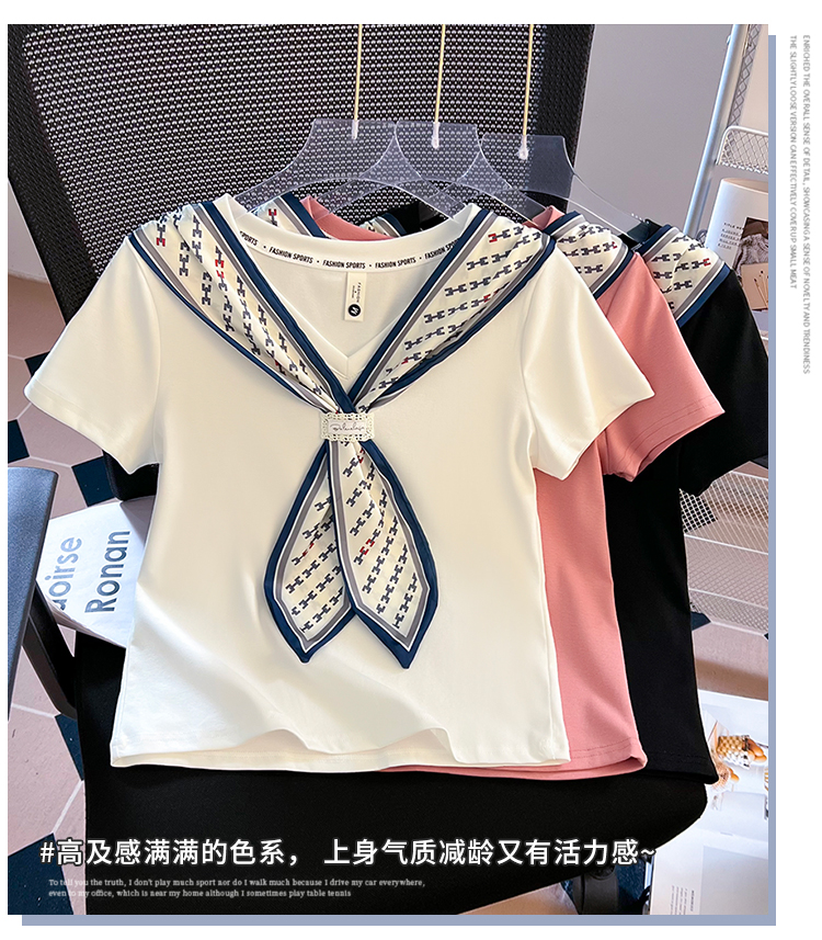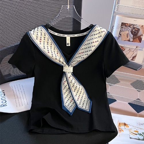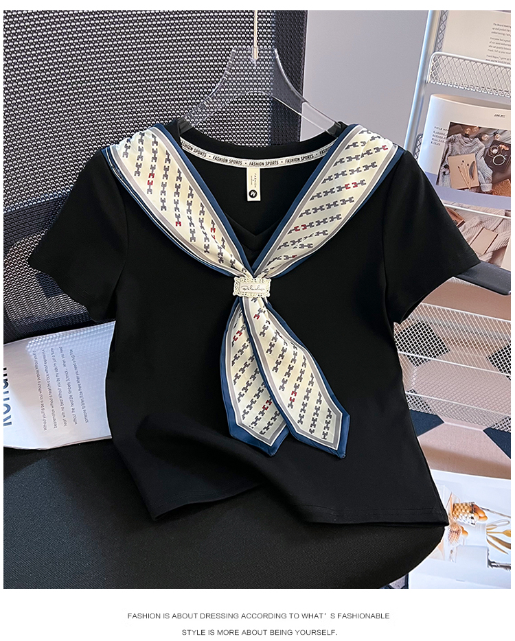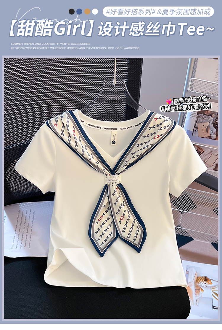 어깨 목도리 반팔 V 넥 티셔츠 여성용 2025 년 새 여름 틈새 세련된 코튼 화이트 슬림 핏 쇼트 탑스토어 가기