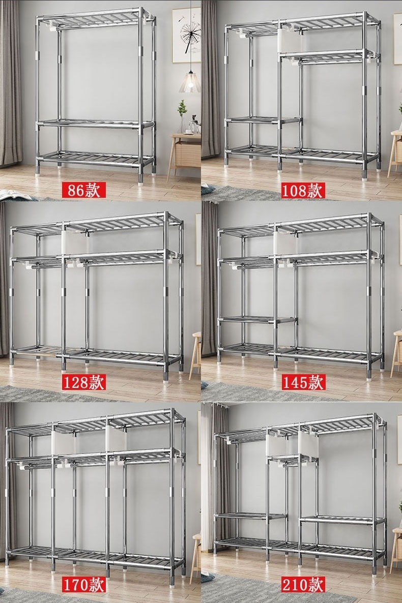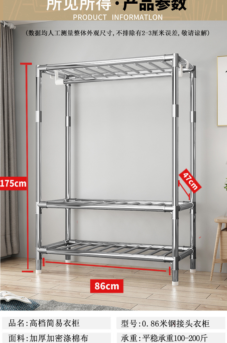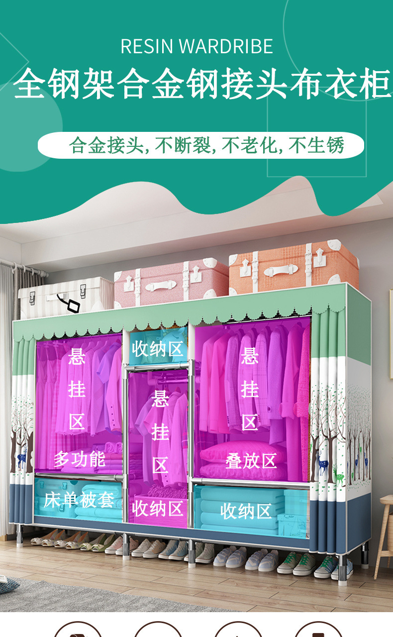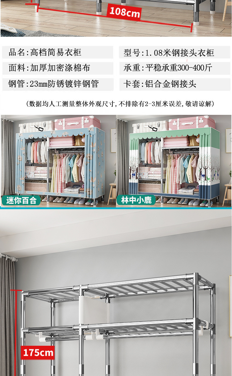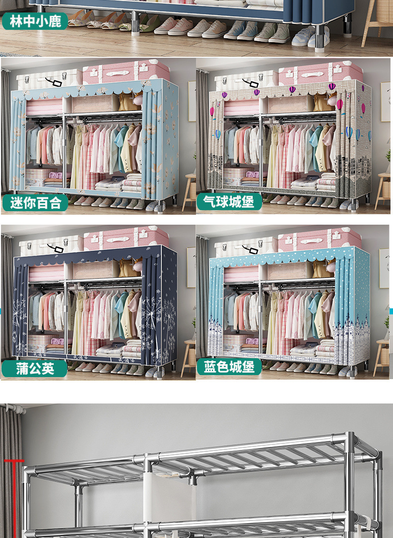 간단한 천 옷장 강철 파이프 두꺼운 천 원목 대형 및 중형 싱글 및 더블 수납 선반 렌탈 하우스용 걸이형스토어 가기