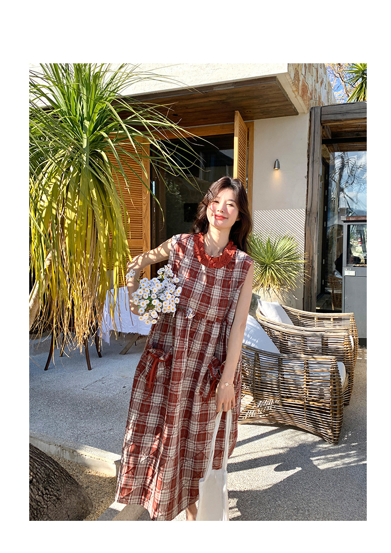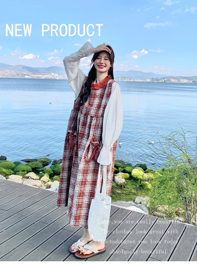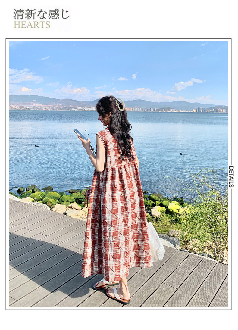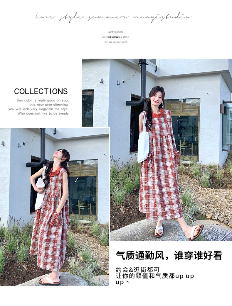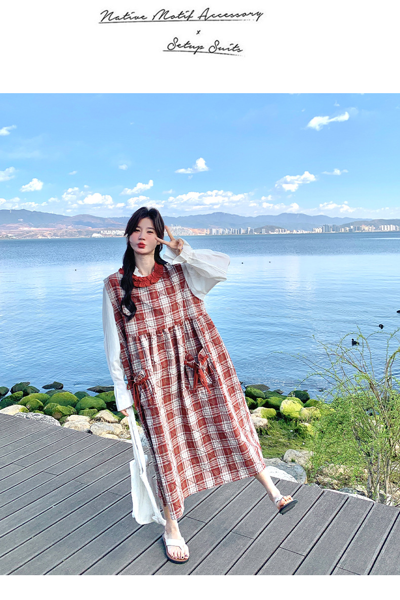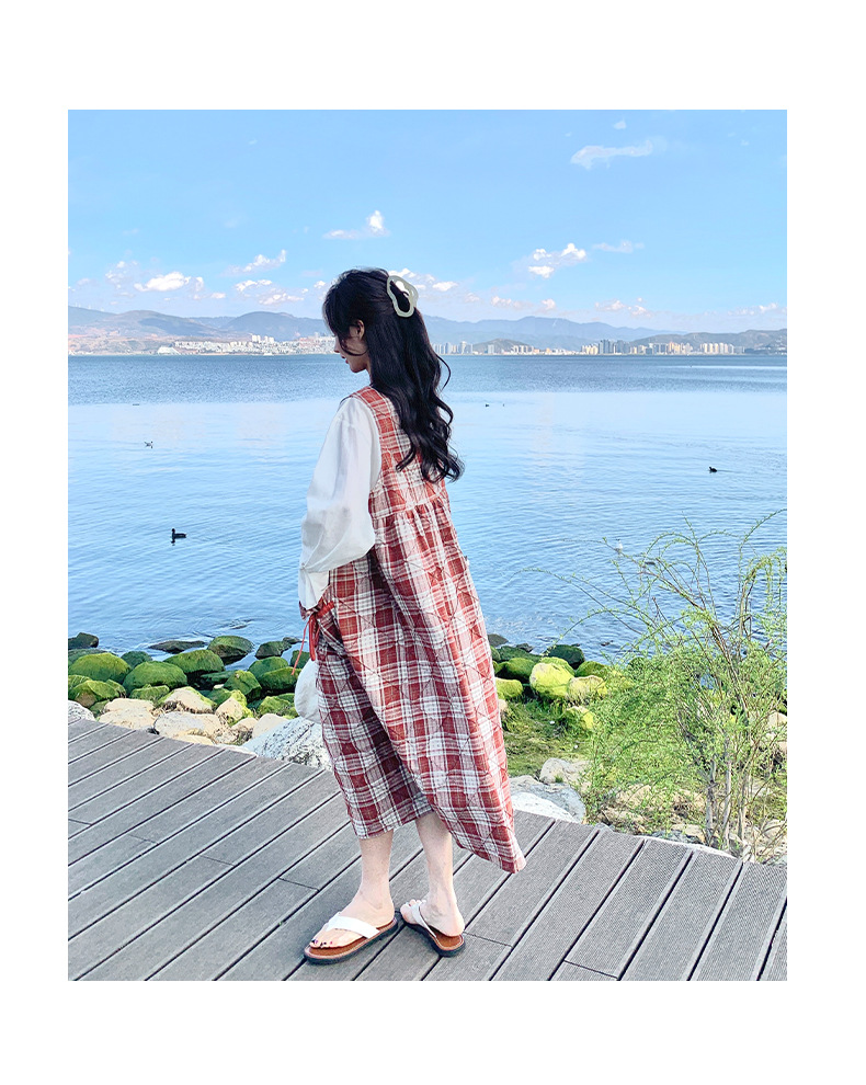 [멩메이] 25 여름 스타일 레트로 붉은 격자 무늬 조끼 원피스 여성 독특한 아름다운 한국 셔츠 세트스토어 가기