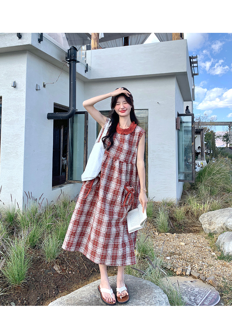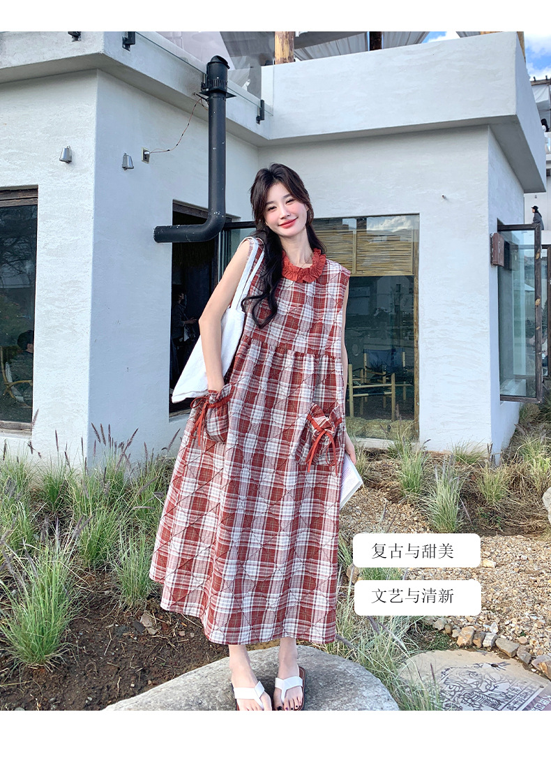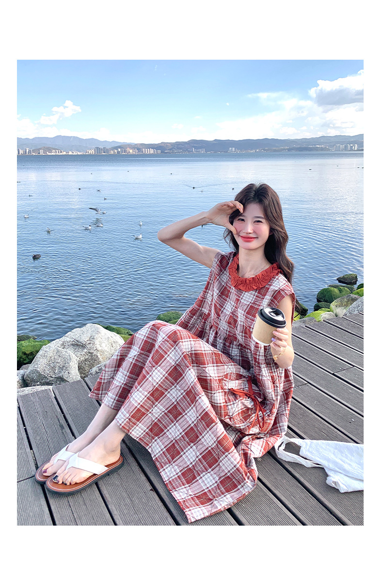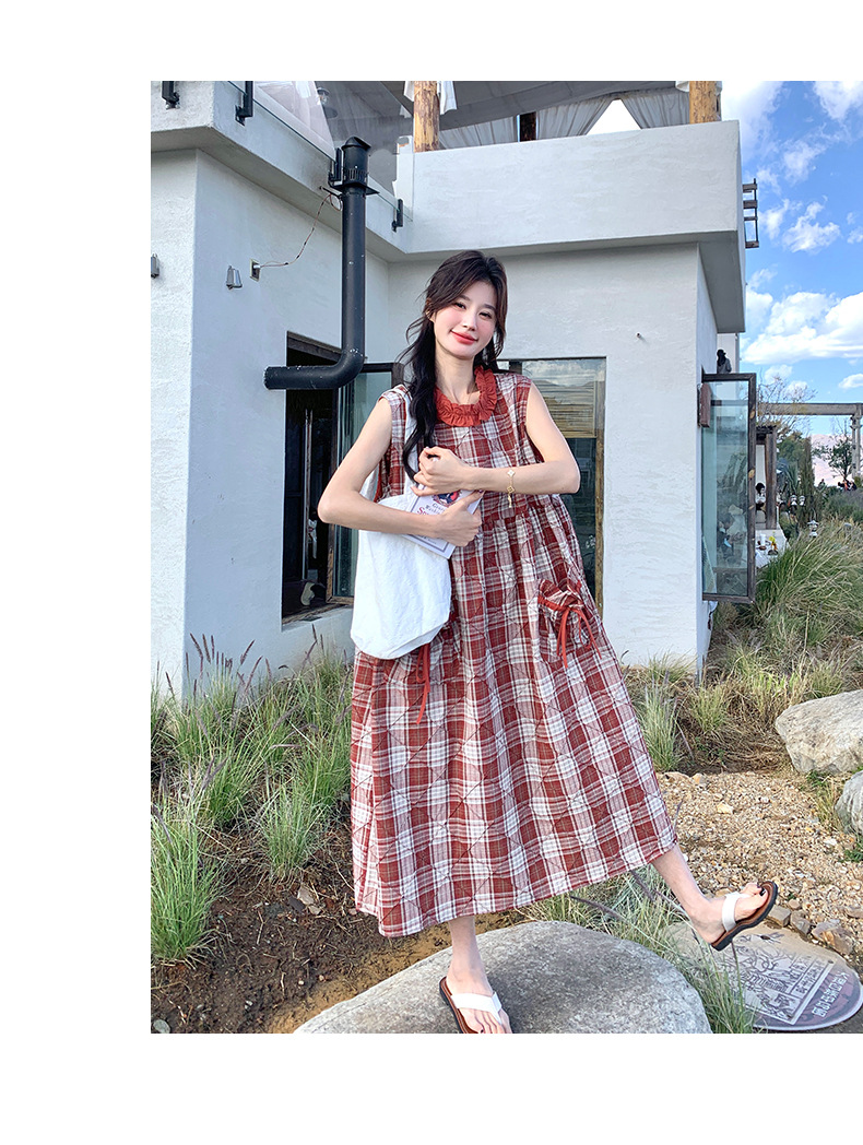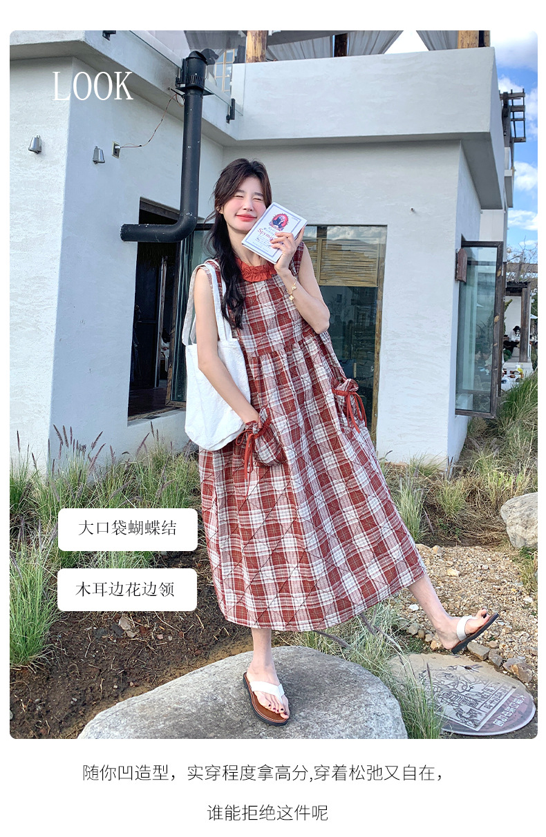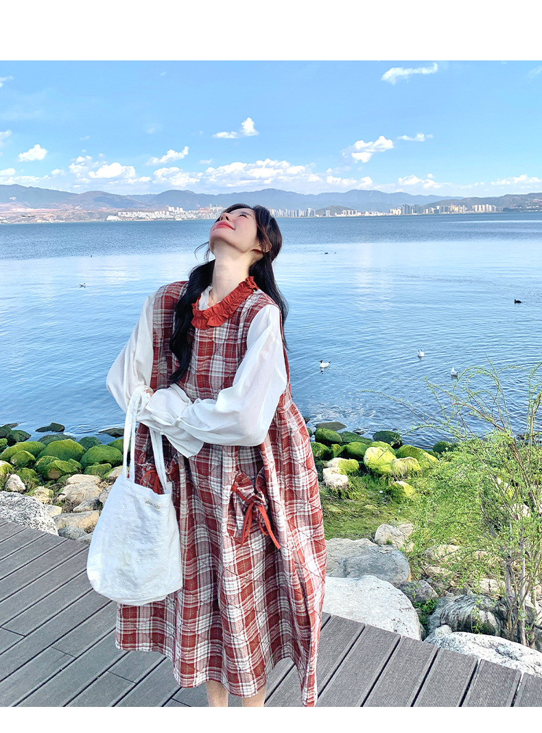 [멩메이] 25 여름 스타일 레트로 붉은 격자 무늬 조끼 원피스 여성 독특한 아름다운 한국 셔츠 세트스토어 가기