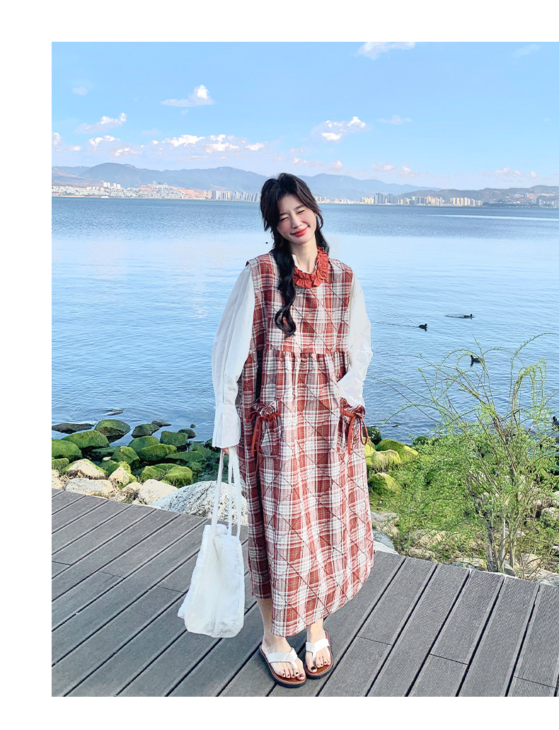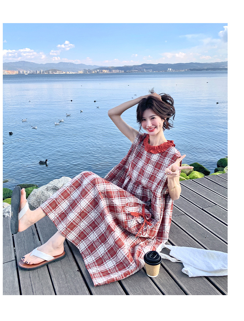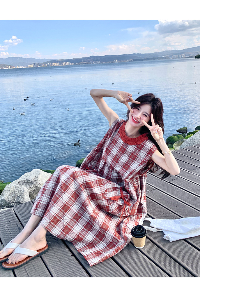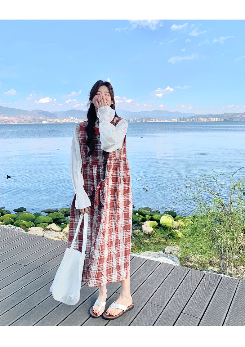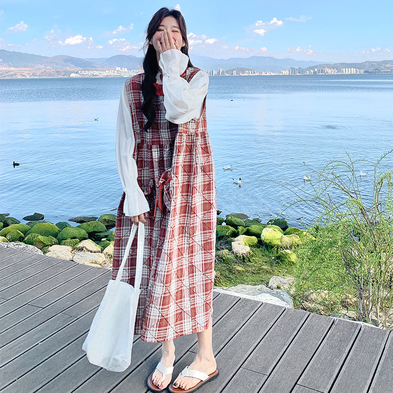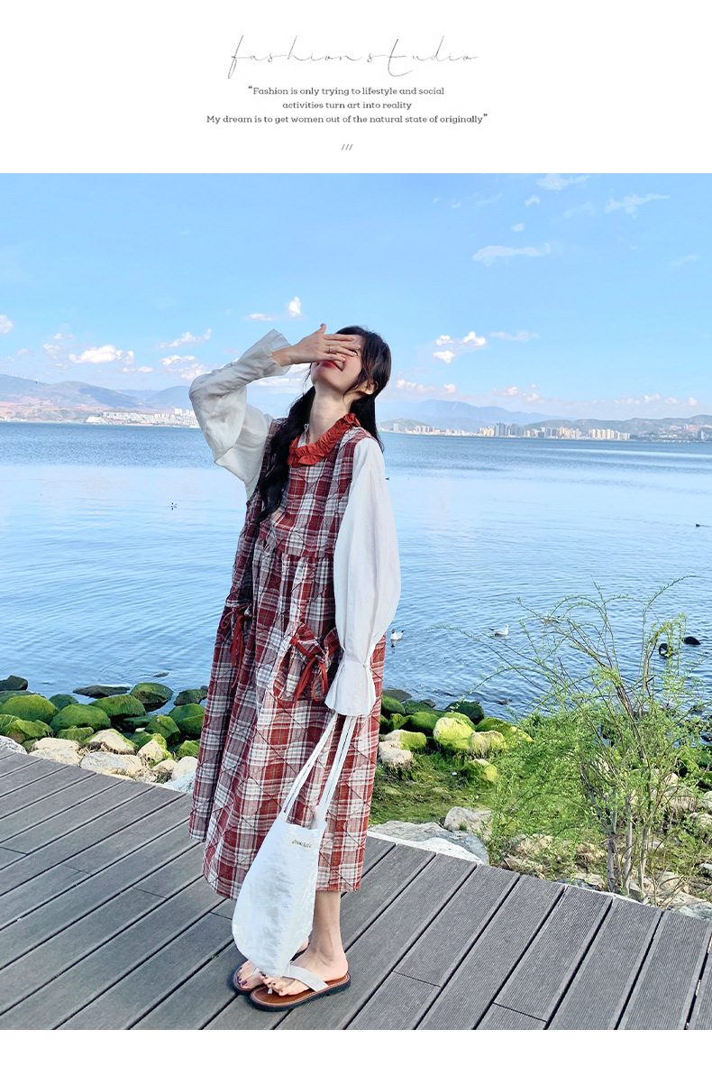 [멩메이] 25 여름 스타일 레트로 붉은 격자 무늬 조끼 원피스 여성 독특한 아름다운 한국 셔츠 세트스토어 가기