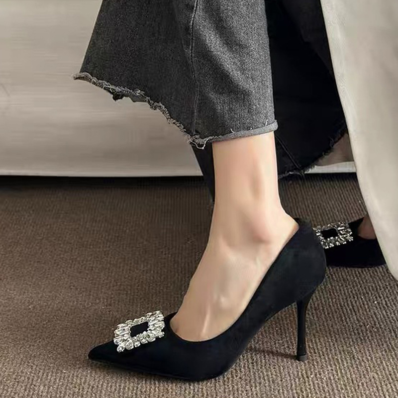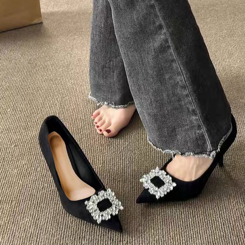 검은 순수한 욕망 하이힐 여성용 스틸레토 2025 새로운 라인스톤은 프랑스 전문 작업 신발 통근 여성 신발스토어 가기
