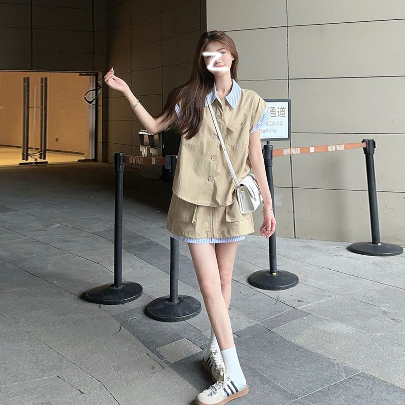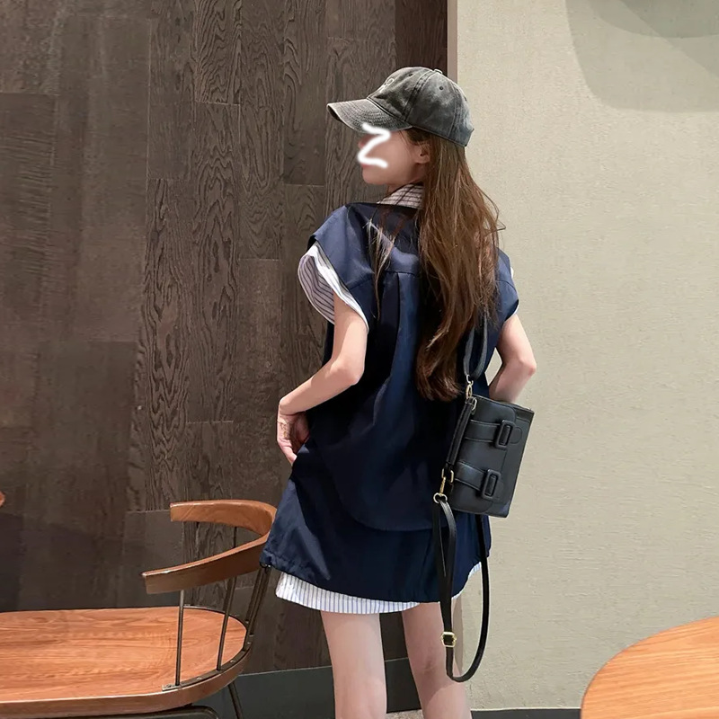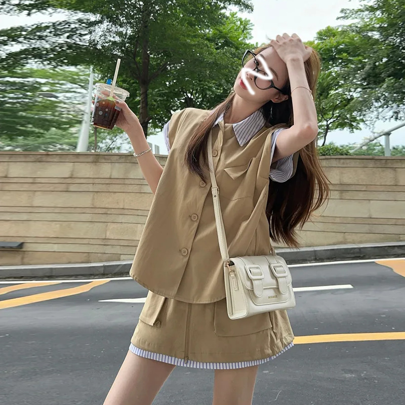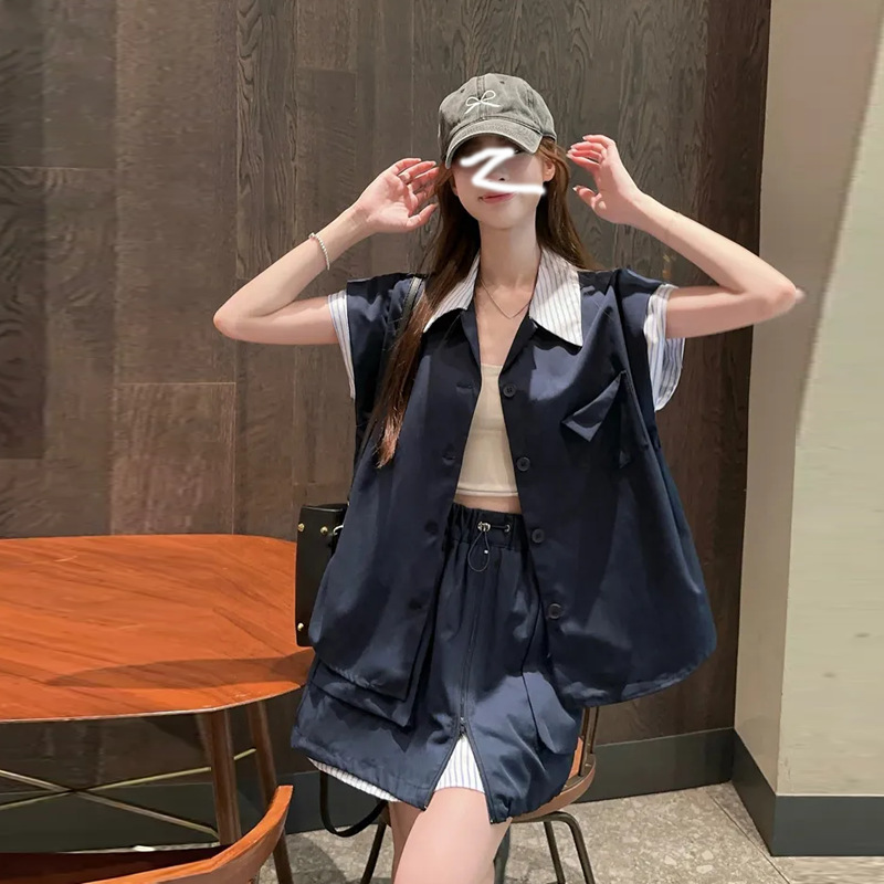 바느질 색상 대비 민소매 조끼 셔츠 최고 여성 여름 세트 작업복 캐주얼 A-라인 하프 스커트 2 피스 세트