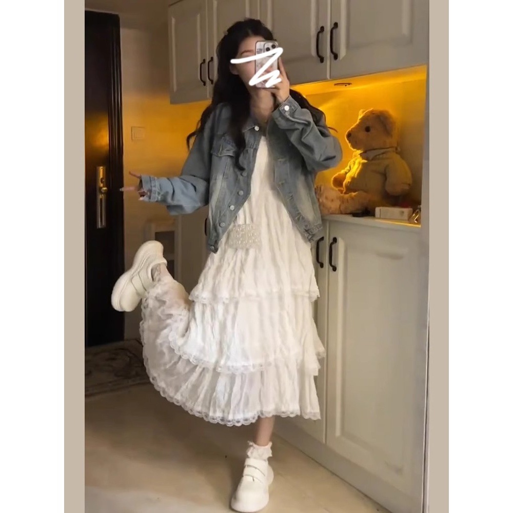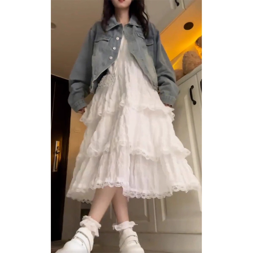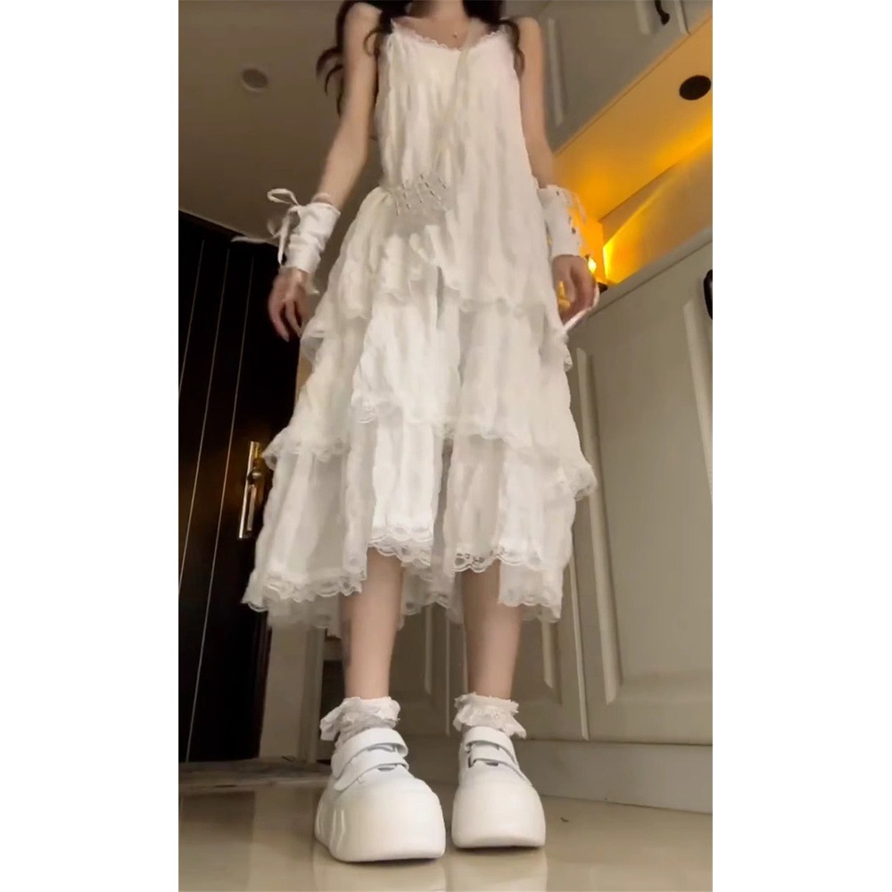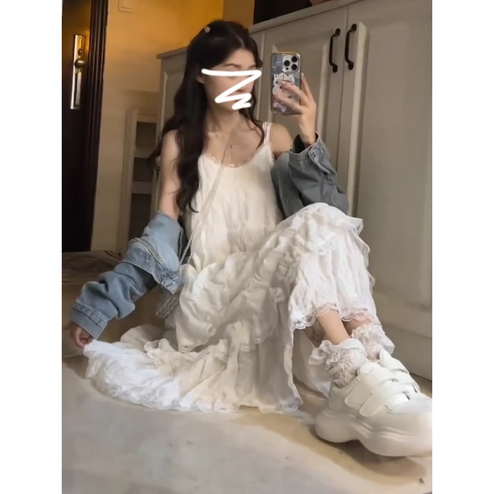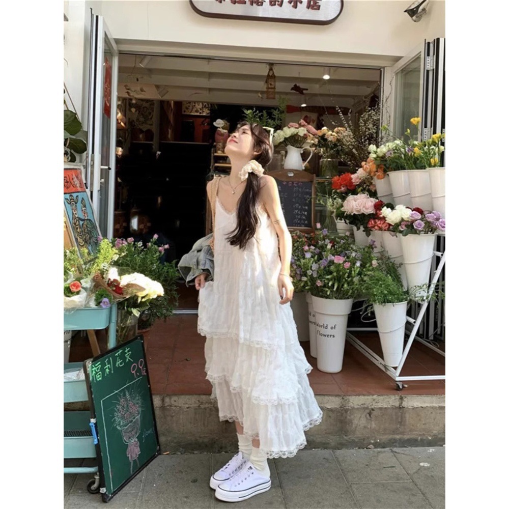 프랑스 스타일 가리 우아한 레이스 슬링 원피스 여성 여름 휴가 여성 스티칭 케이크 A 라인 스커트스토어 가기