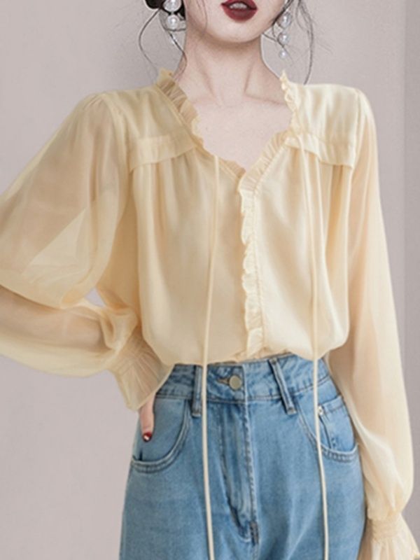 프랑스 스타일 부드러운 스타일 러플 긴 소매 쉬폰 셔츠 봄과 여름 새로운 도착 웨스턴 스타일 작은 셔츠 느슨한 뿔 슬리브 탑스토어 가기