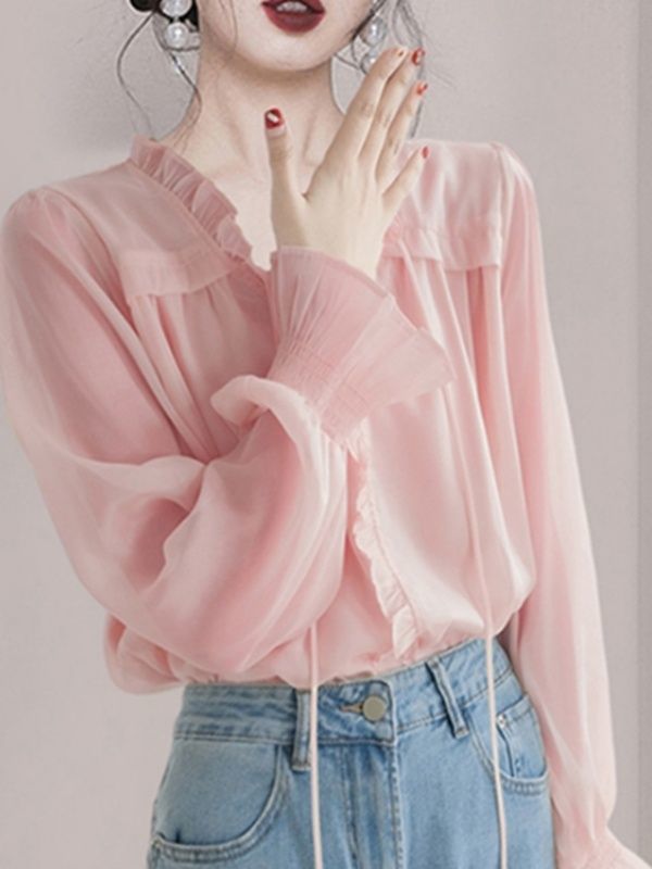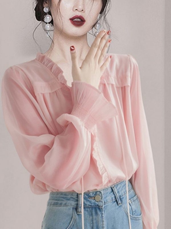 프랑스 스타일 부드러운 스타일 러플 긴 소매 쉬폰 셔츠 봄과 여름 새로운 도착 웨스턴 스타일 작은 셔츠 느슨한 뿔 슬리브 탑