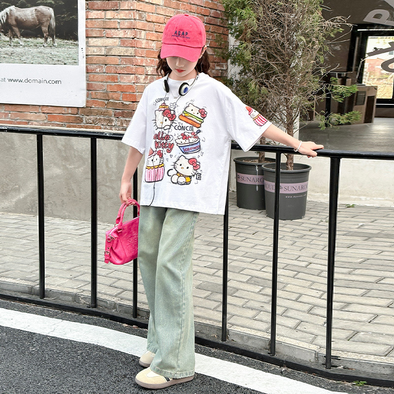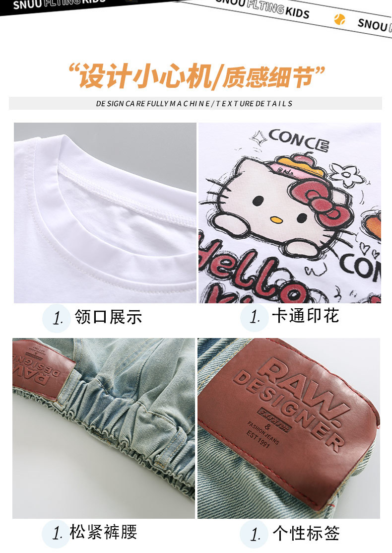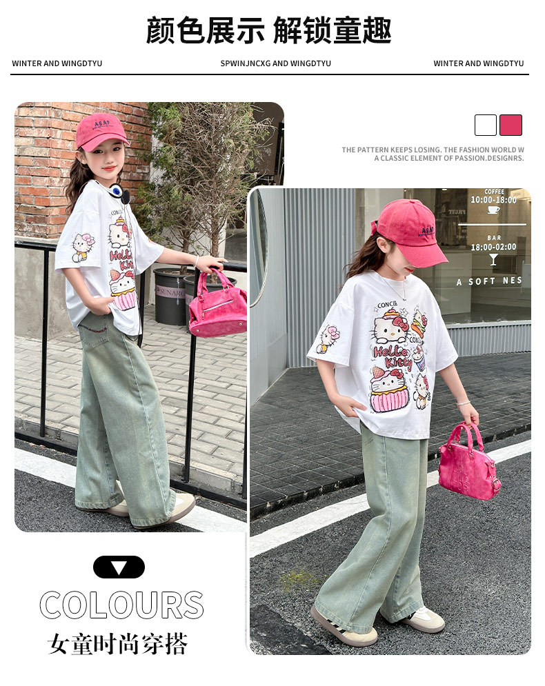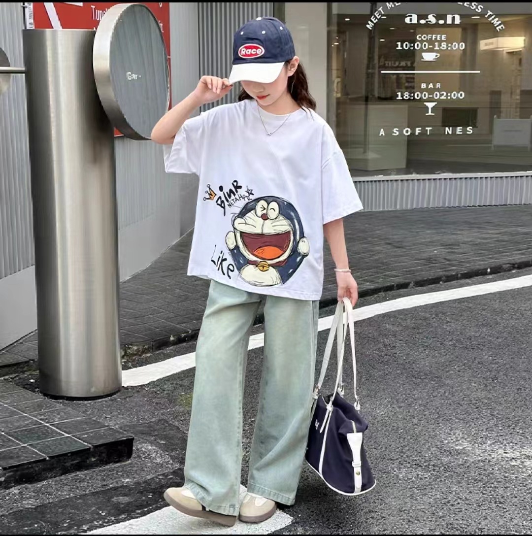 여자 정장 여름 옷 2025 새로운 어린이 스타일 반팔 티셔츠 여자 여름 얇은 청바지 투피스 세트스토어 가기