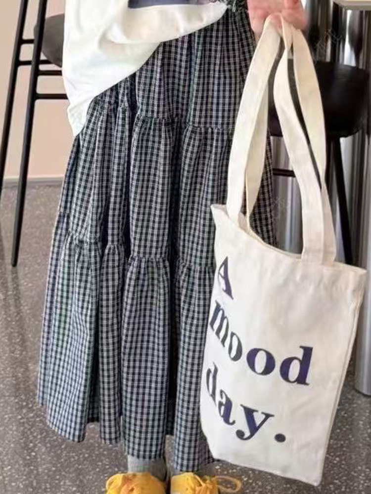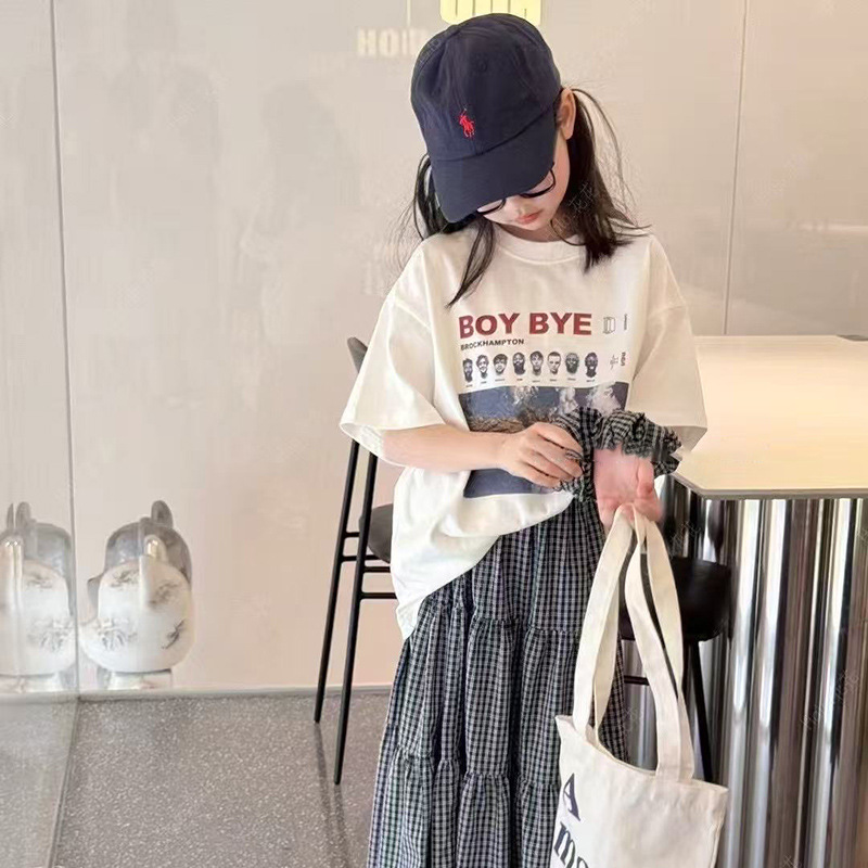 여자 한국 스타일 느슨한 유행 인쇄 된 편지 패턴 반팔 2025 올 매치 패치 워크 격자 스커트 투피스 세트
