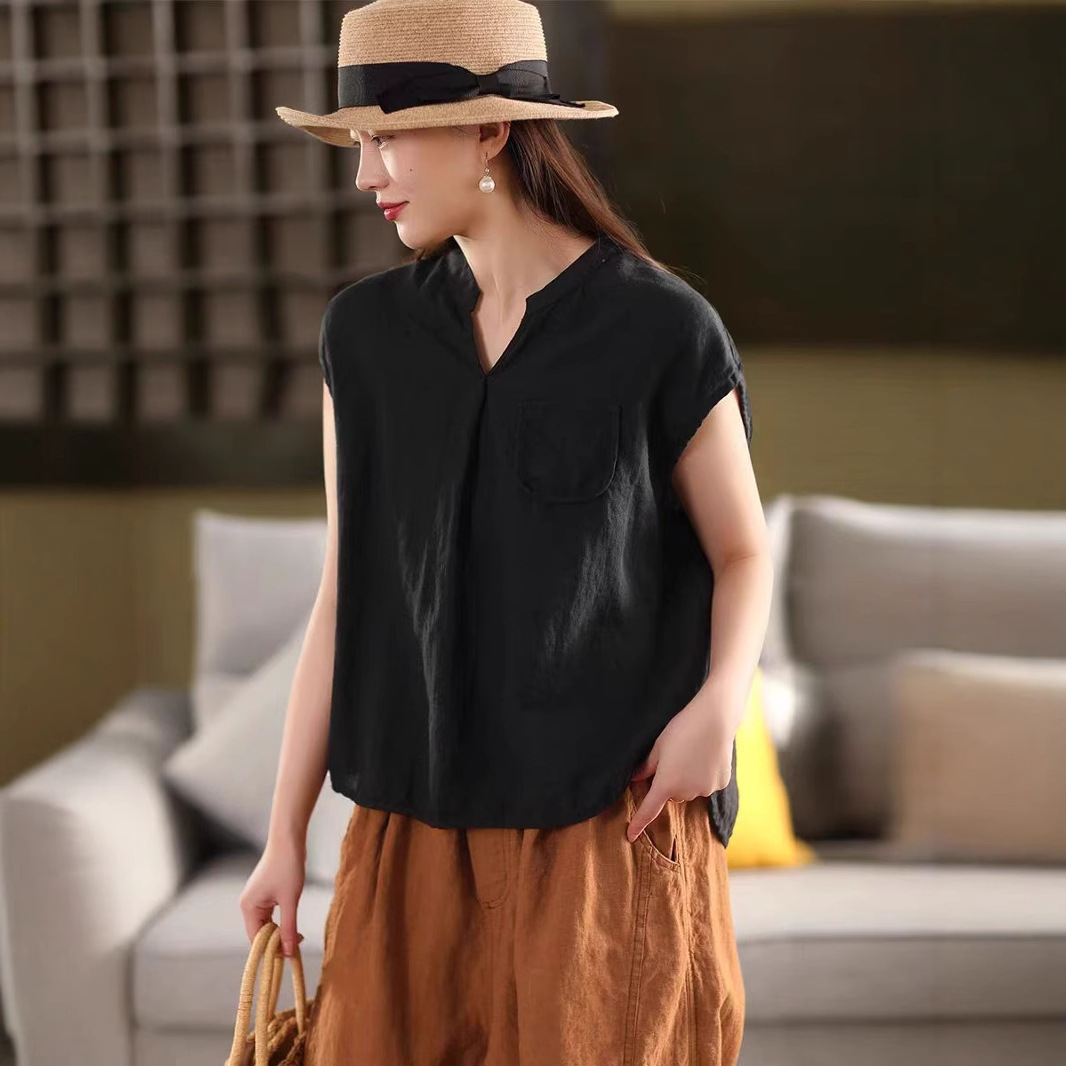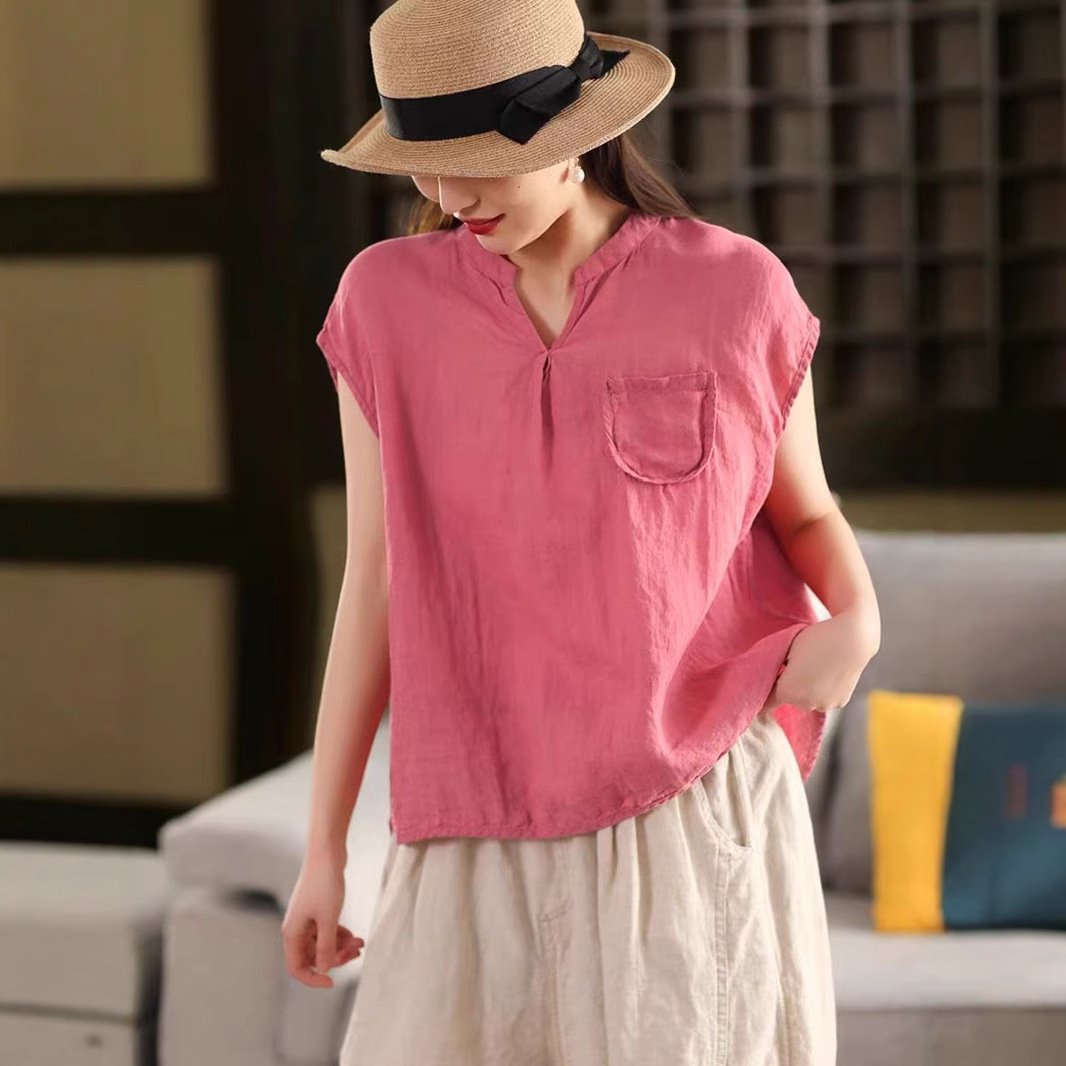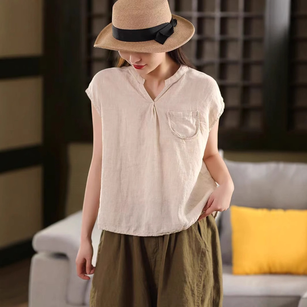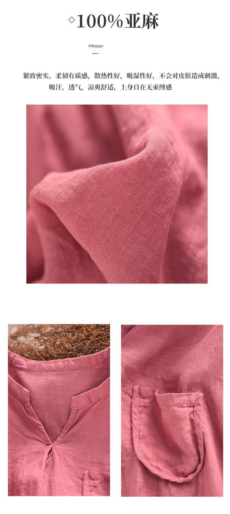 2025 봄 새로운 빈티지 샌드 워시 린넨 셔츠 여성의 여름 짧은 소매 탑 예술적 단색 풀오버 셔츠