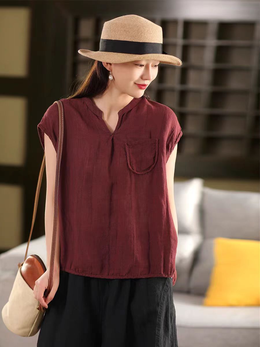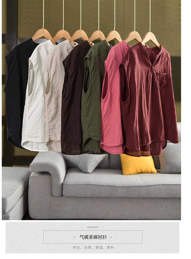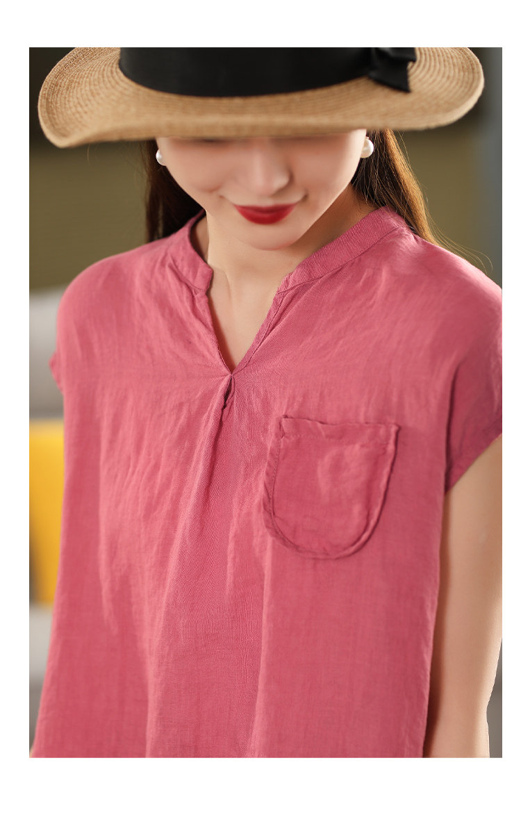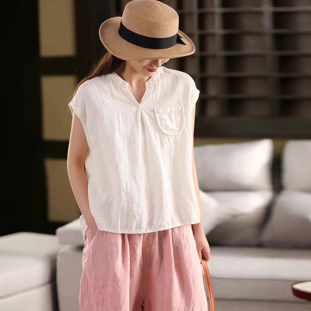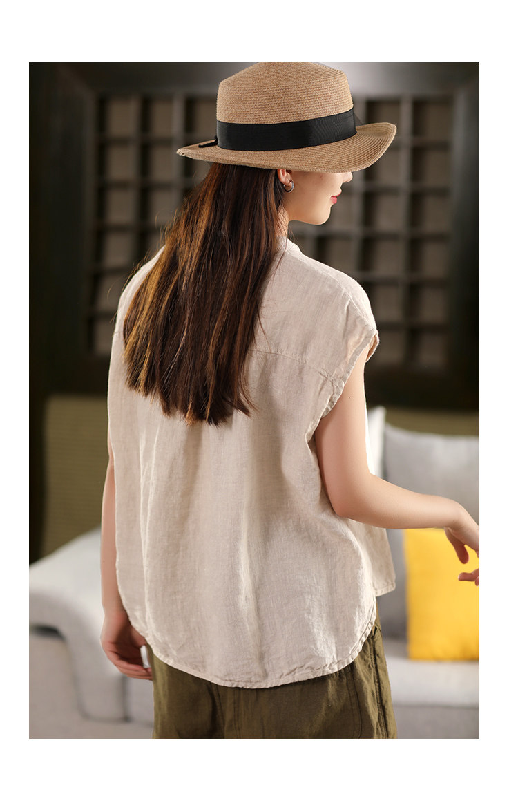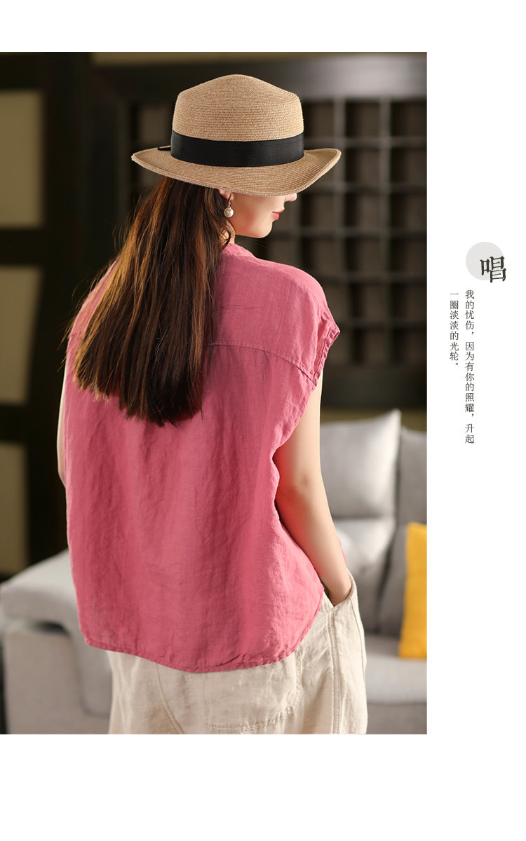 2025 봄 새로운 빈티지 샌드 워시 린넨 셔츠 여성의 여름 짧은 소매 탑 예술적 단색 풀오버 셔츠