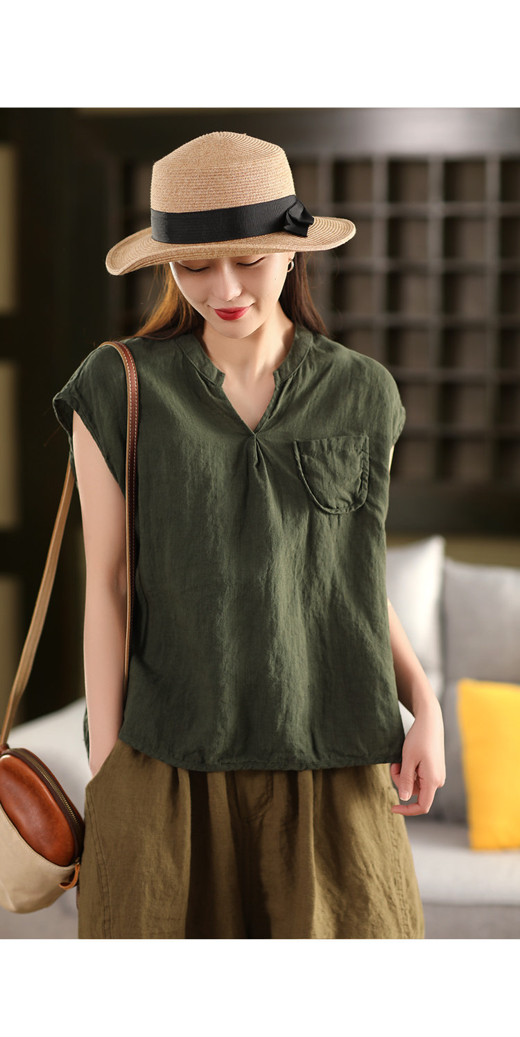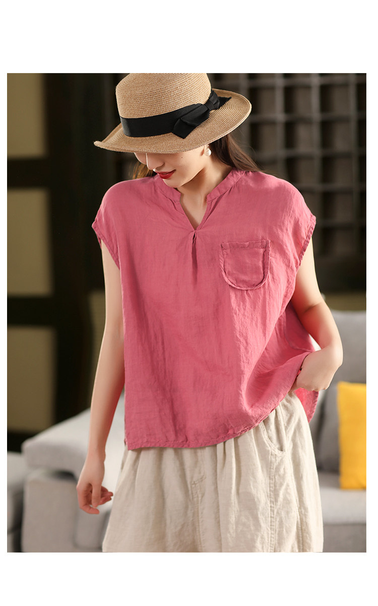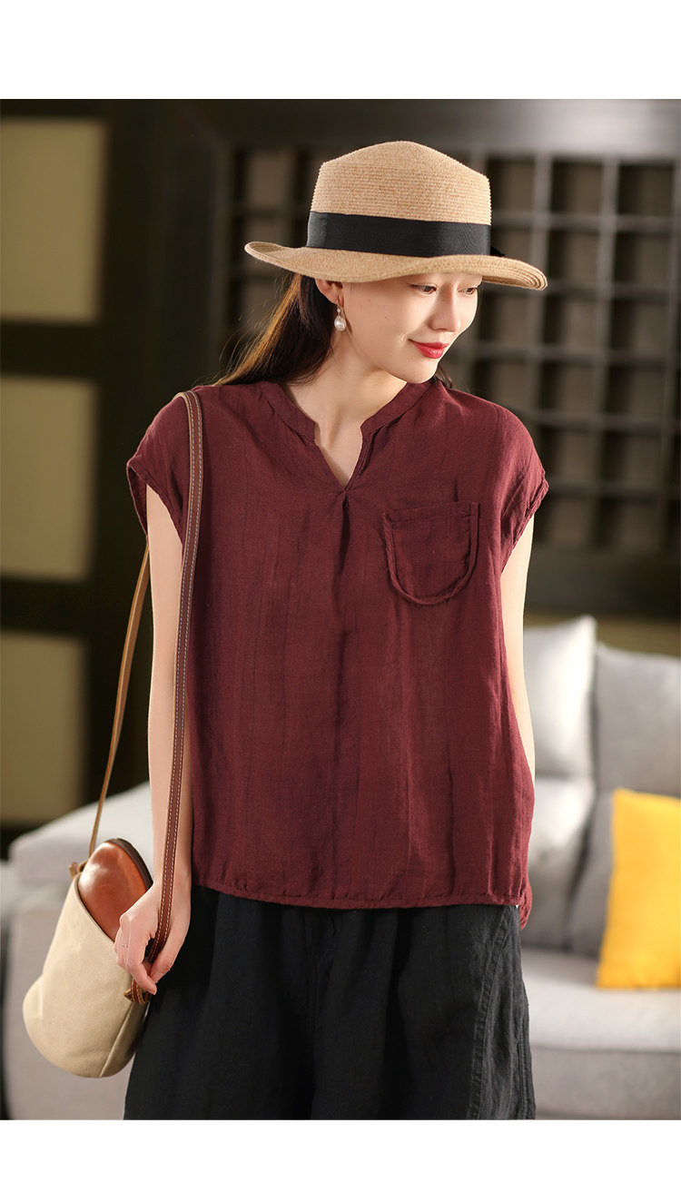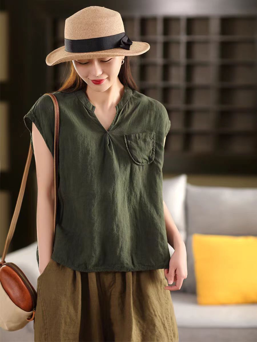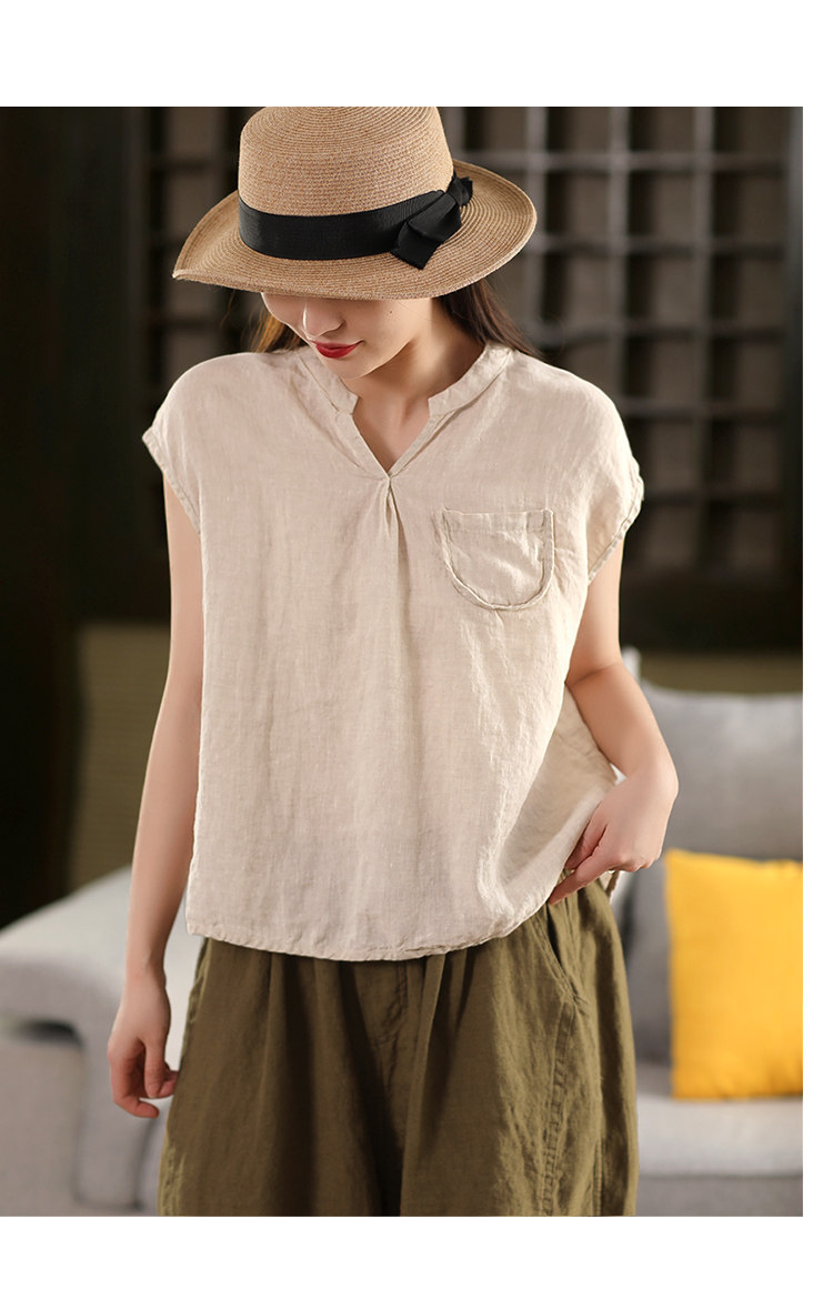 2025 봄 새로운 빈티지 샌드 워시 린넨 셔츠 여성의 여름 짧은 소매 탑 예술적 단색 풀오버 셔츠