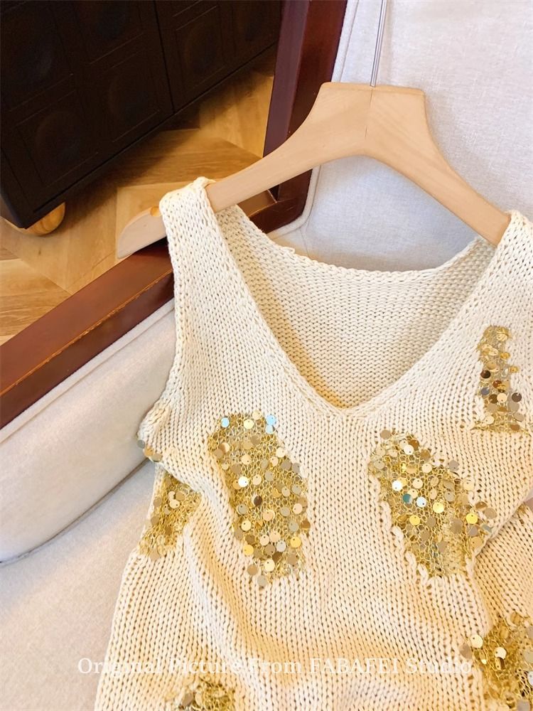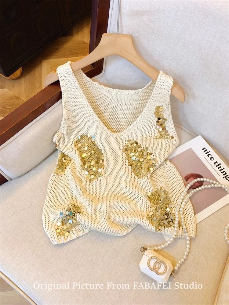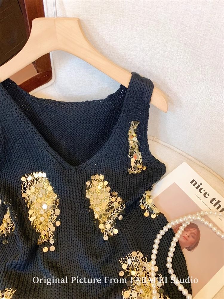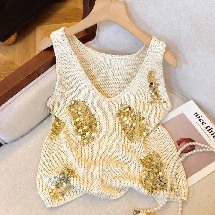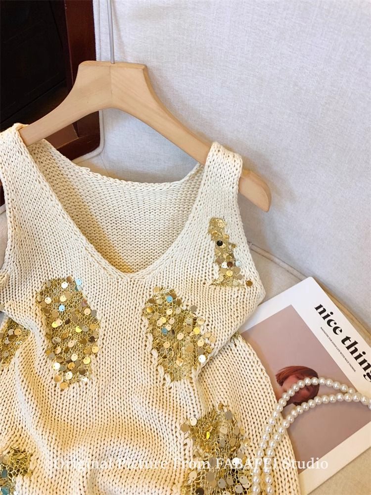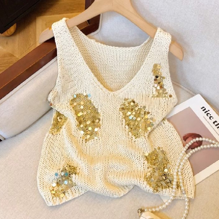 여름 아우터용 여성용 프렌치 헤비웨이트 스팽글 브이넥 니트 조끼, 민소매 조끼 블라우스, 레이지 하이엔드 탑스토어 가기
