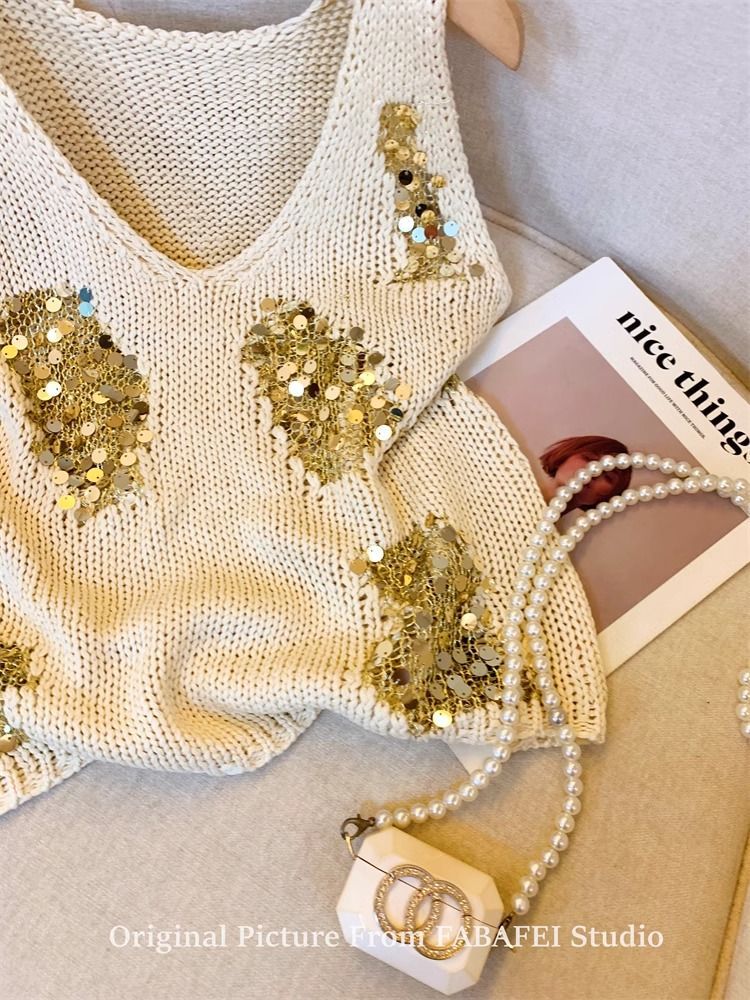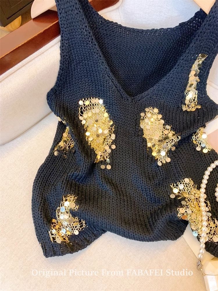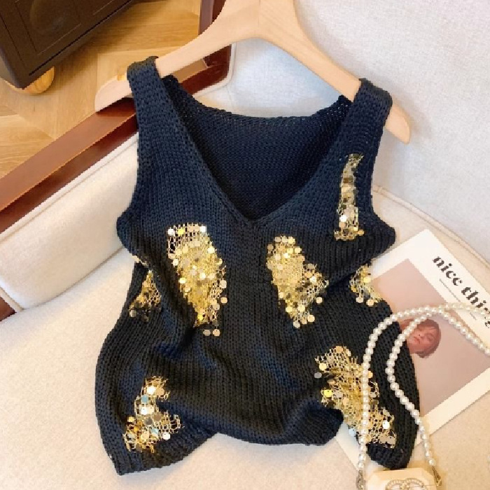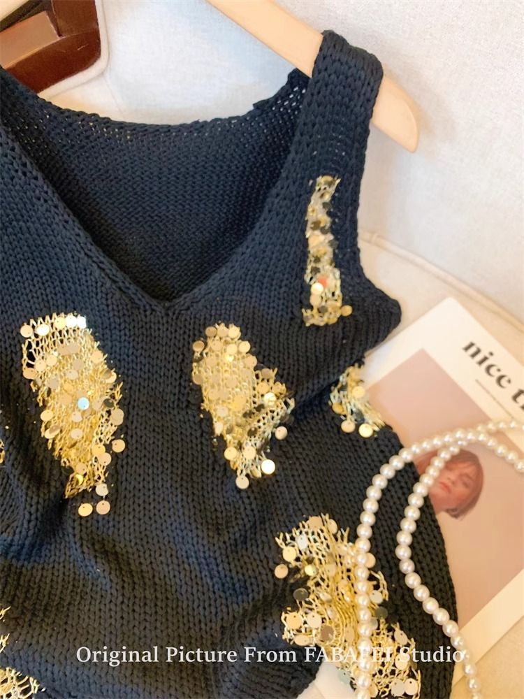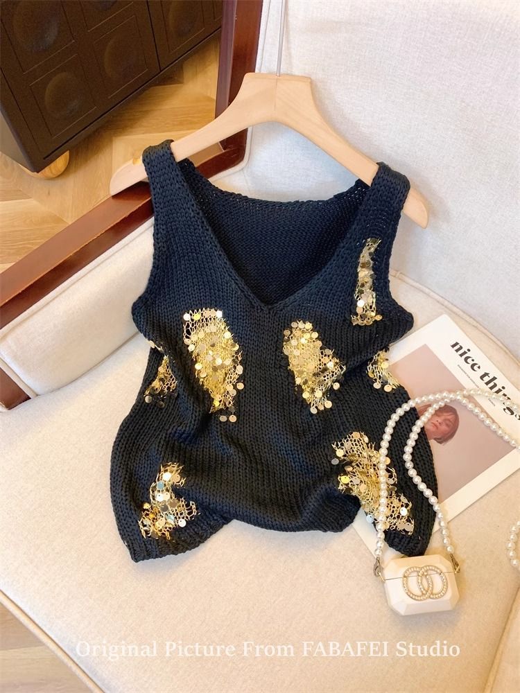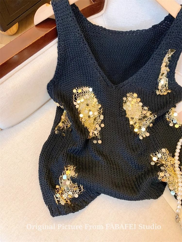 여름 아우터용 여성용 프렌치 헤비웨이트 스팽글 브이넥 니트 조끼, 민소매 조끼 블라우스, 레이지 하이엔드 탑스토어 가기