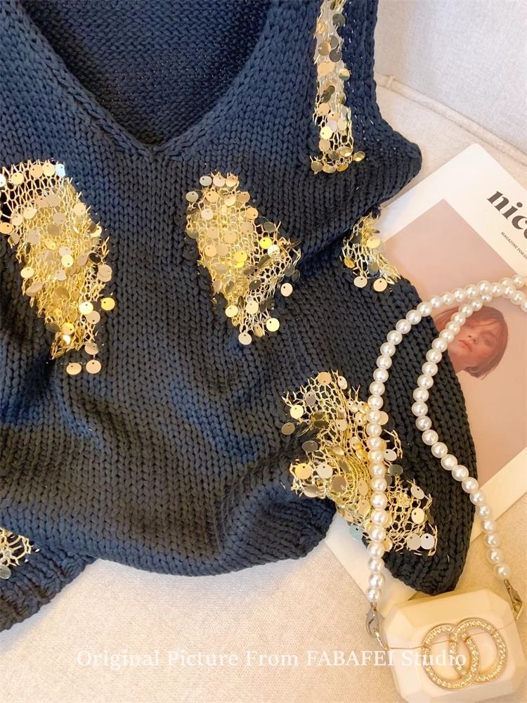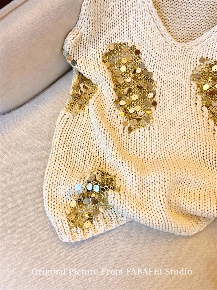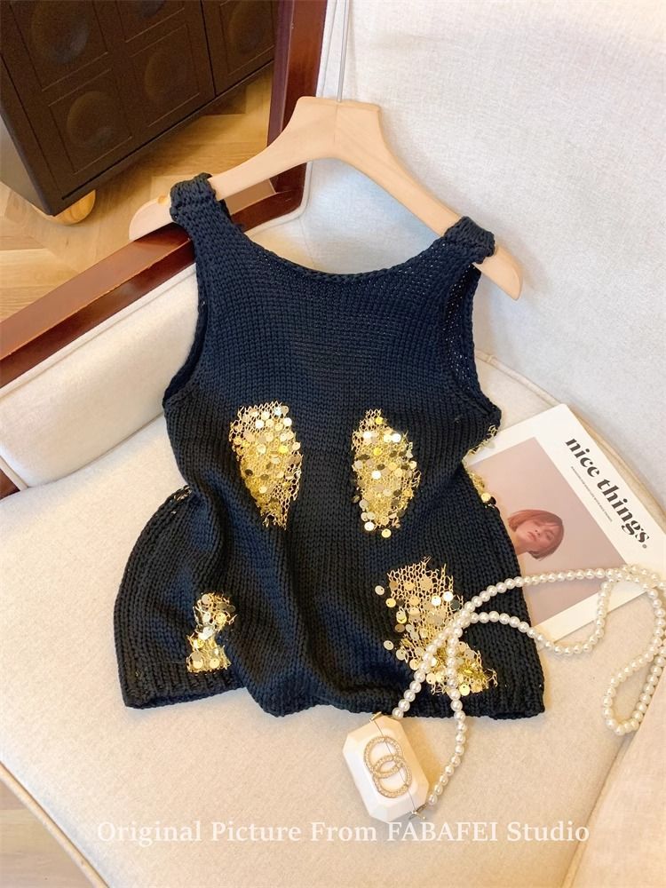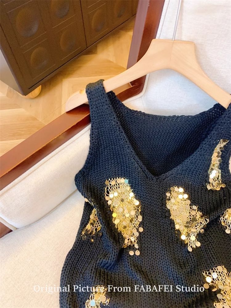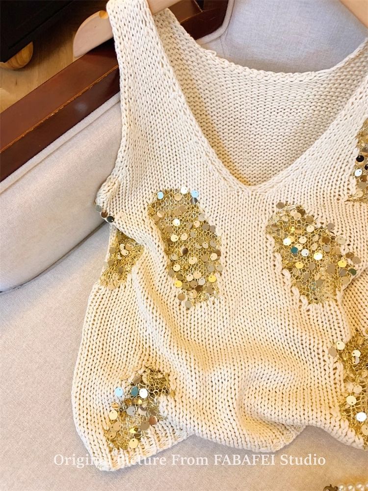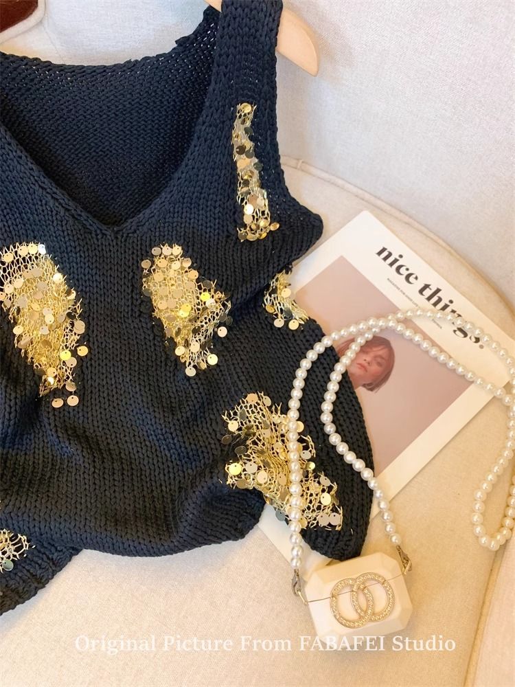 여름 아우터용 여성용 프렌치 헤비웨이트 스팽글 브이넥 니트 조끼, 민소매 조끼 블라우스, 레이지 하이엔드 탑스토어 가기