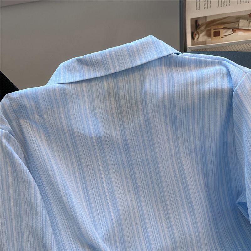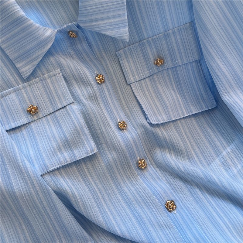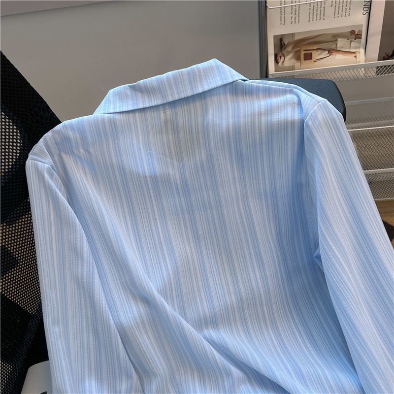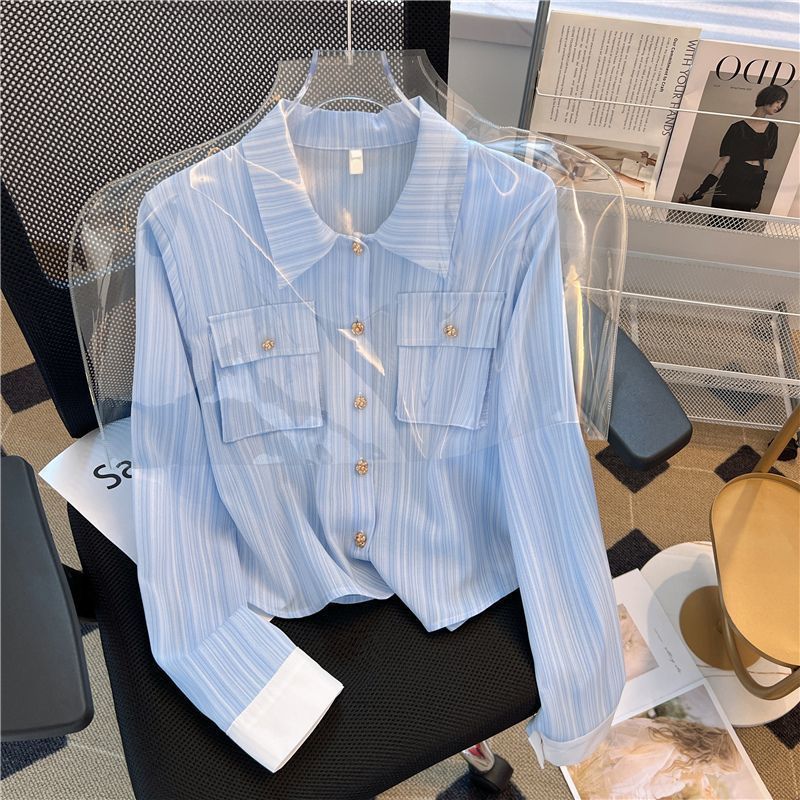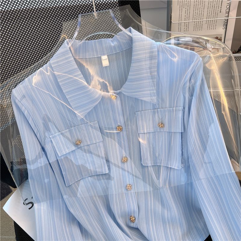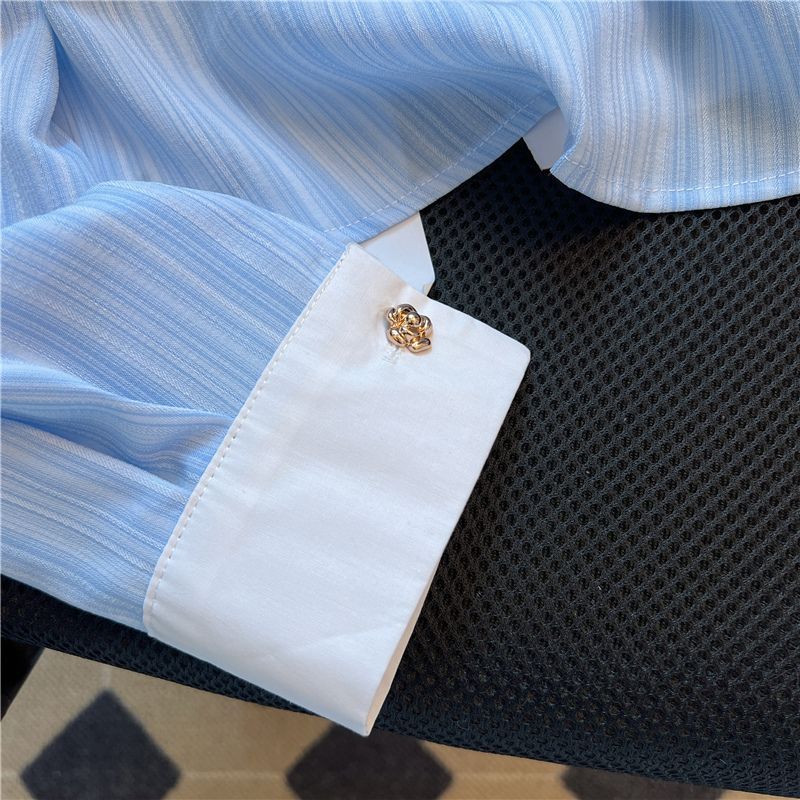 샤넬 스타일 블루 스트라이프 긴 소매 셔츠 여성의 여름 짧은 세련된 셔츠 프랑스 스타일 폴로 칼라 탑
