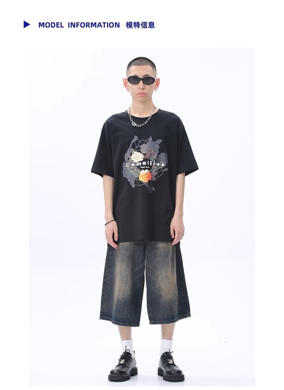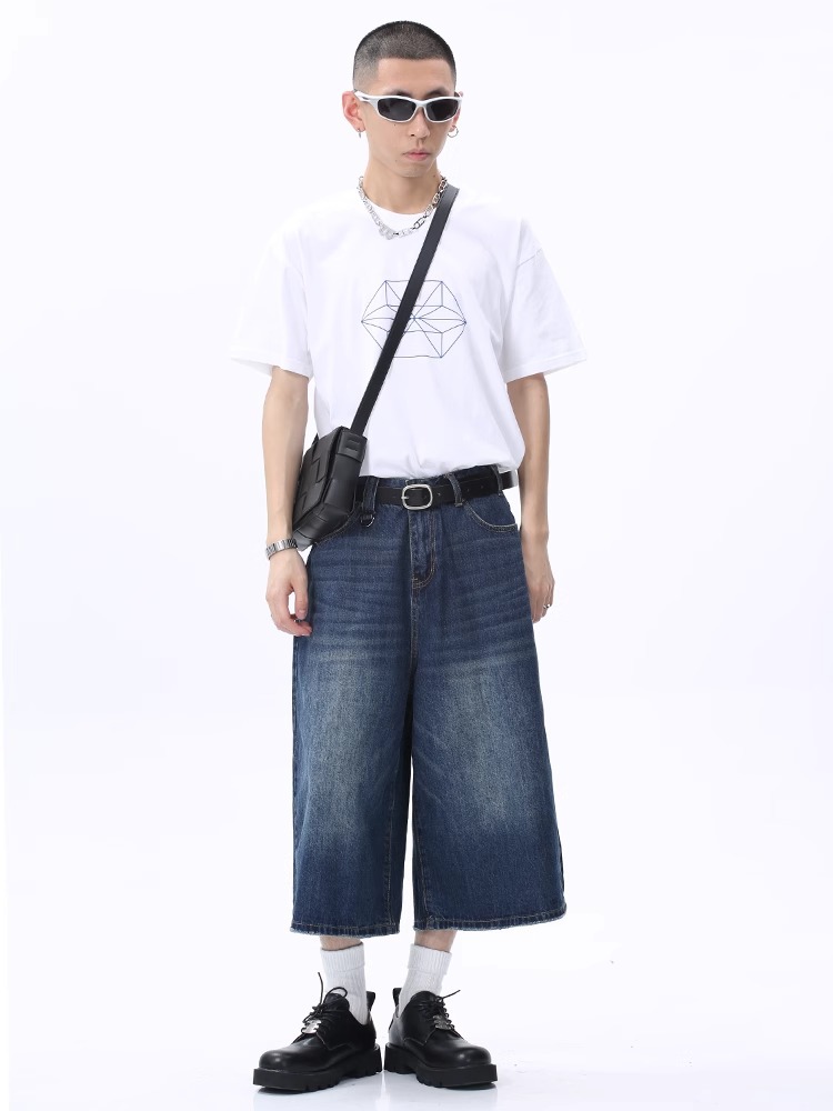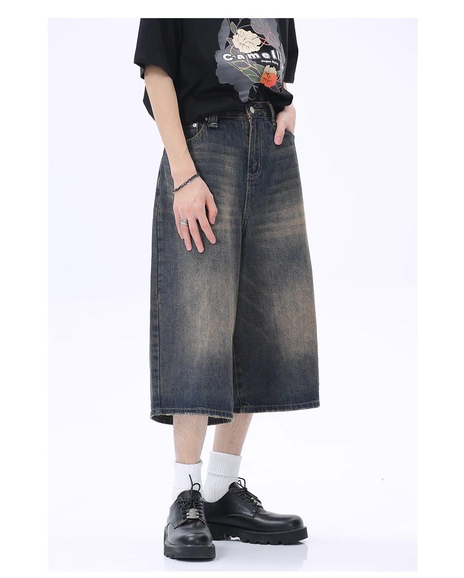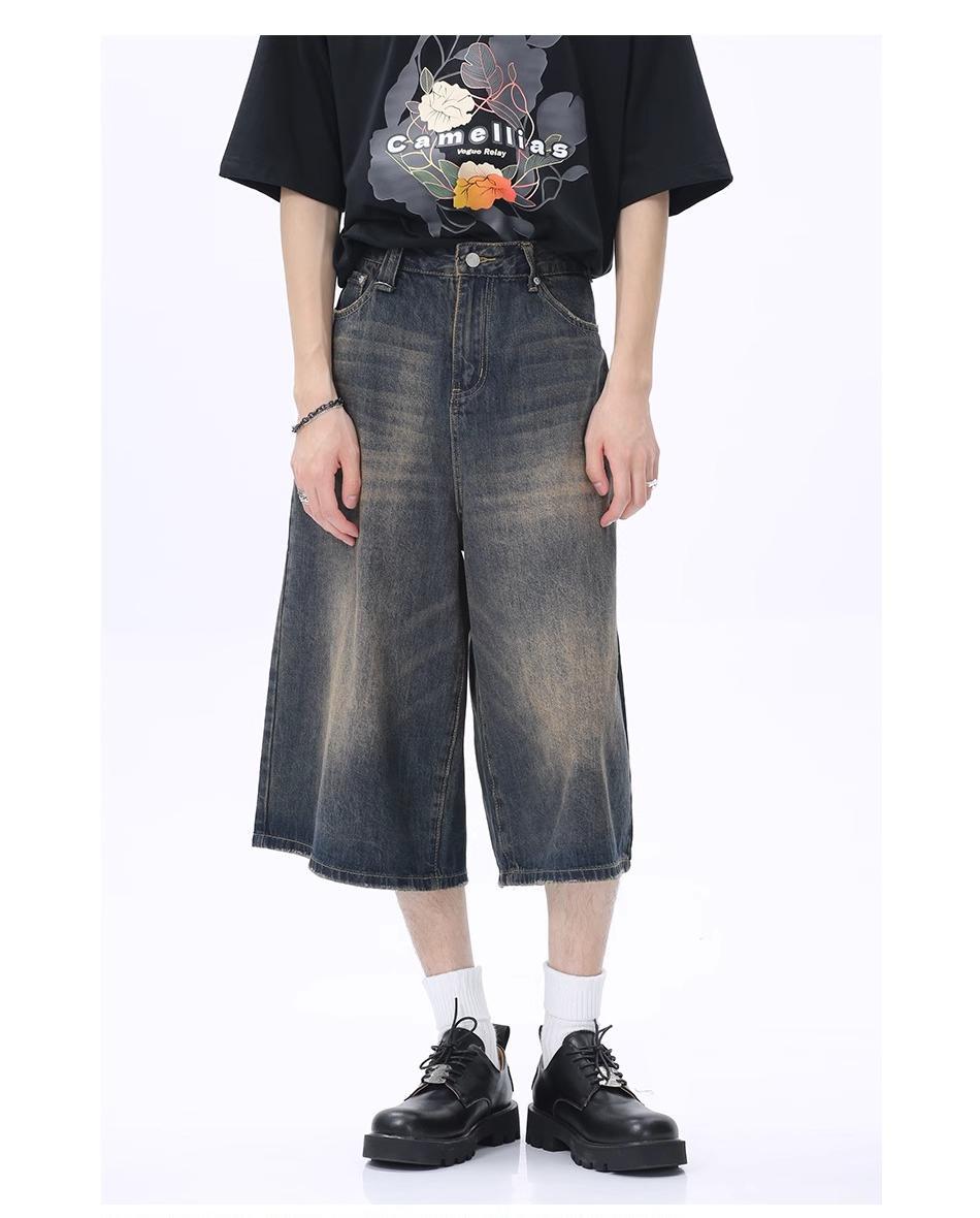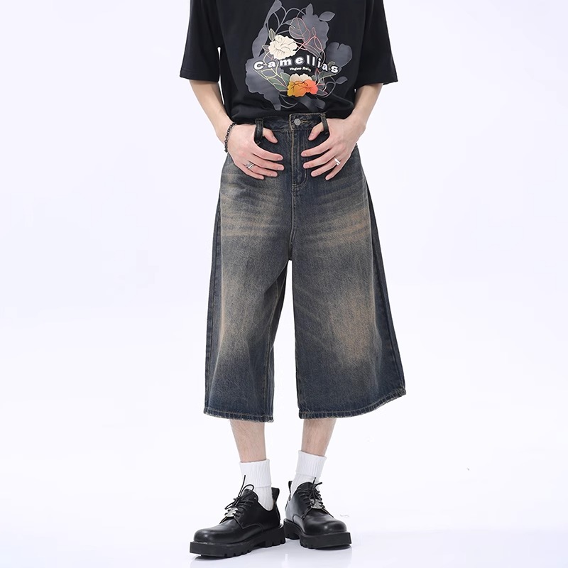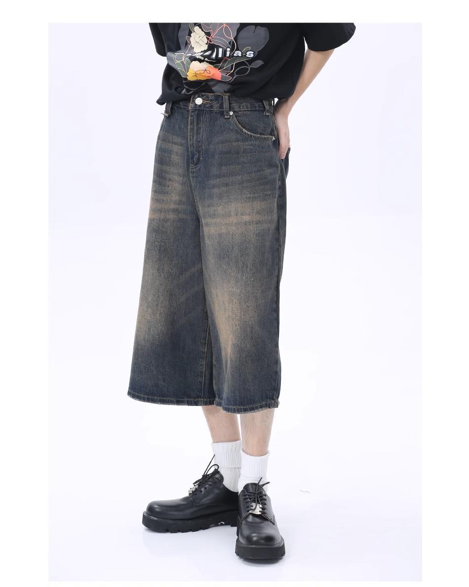 워싱 레트로 데님 반바지 남성 여름 얇은 루즈 스트레이트 아메리칸 하이 스트리트 팬츠 트렌디 브랜드 핸섬 크롭 팬츠