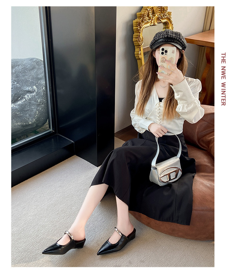 프랑스 스타일 Baotou 금속 작은 쐐기 뒤꿈치 반 슬리퍼 여성의 2025 새로운 도착 단층화 스커트 높이 뾰족한 샌들과 슬리퍼