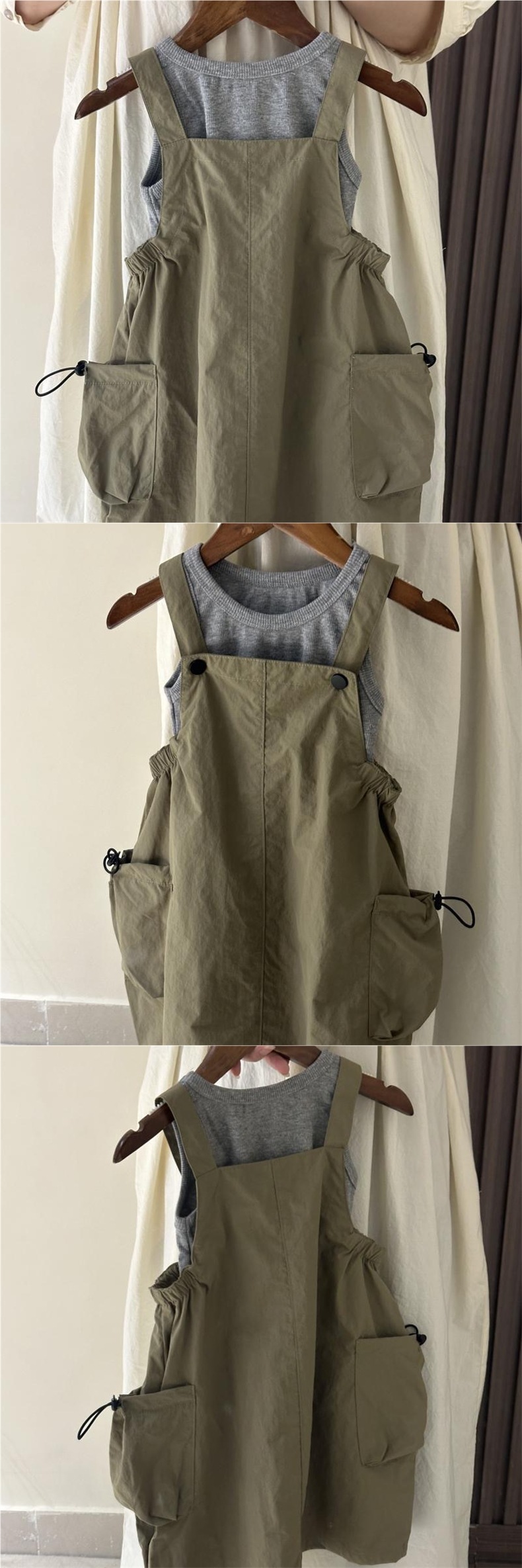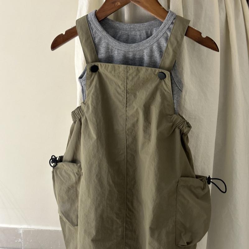 • 내구성이 뛰어난 밀리터리 그린 서스펜더 스커트 + 그레이 조끼 트렌드
