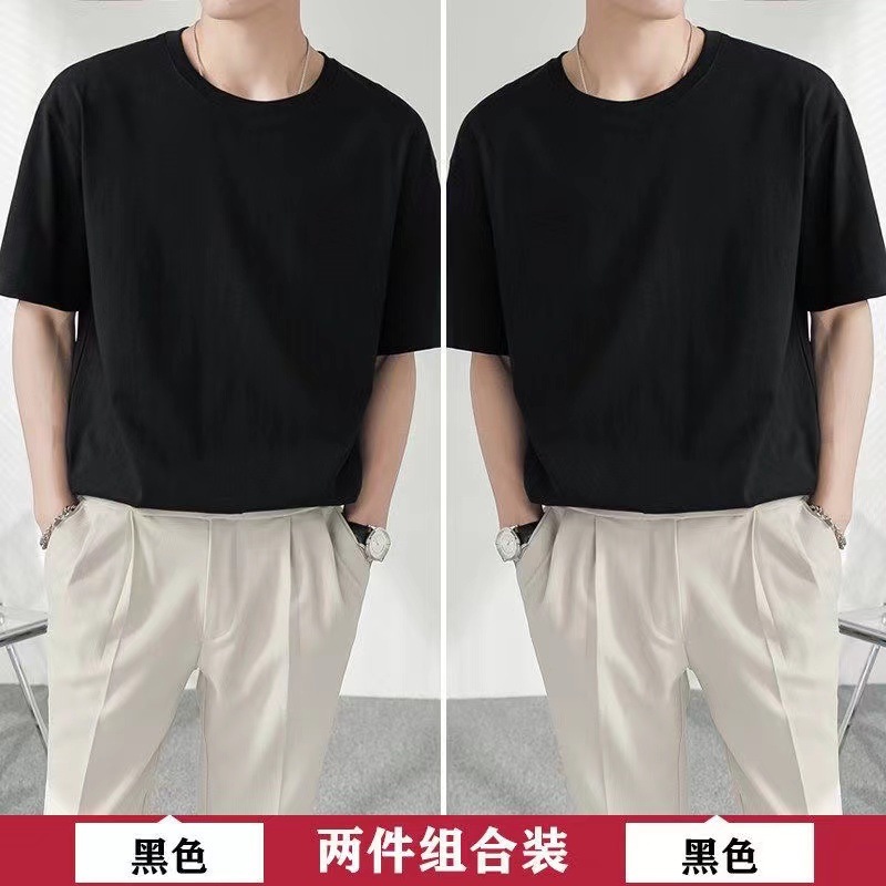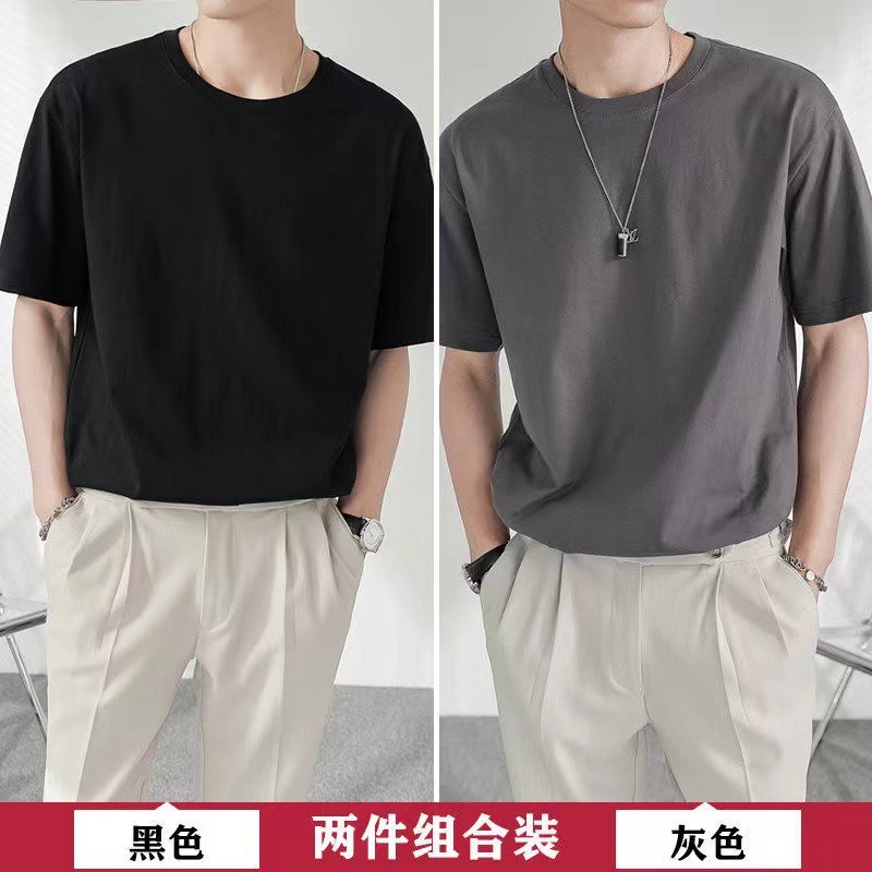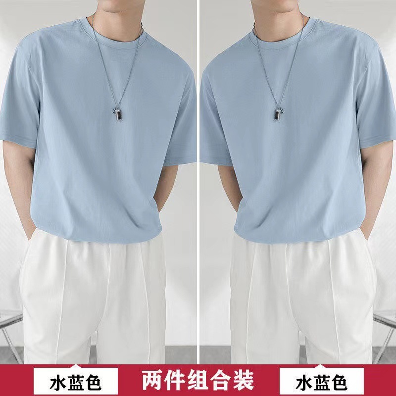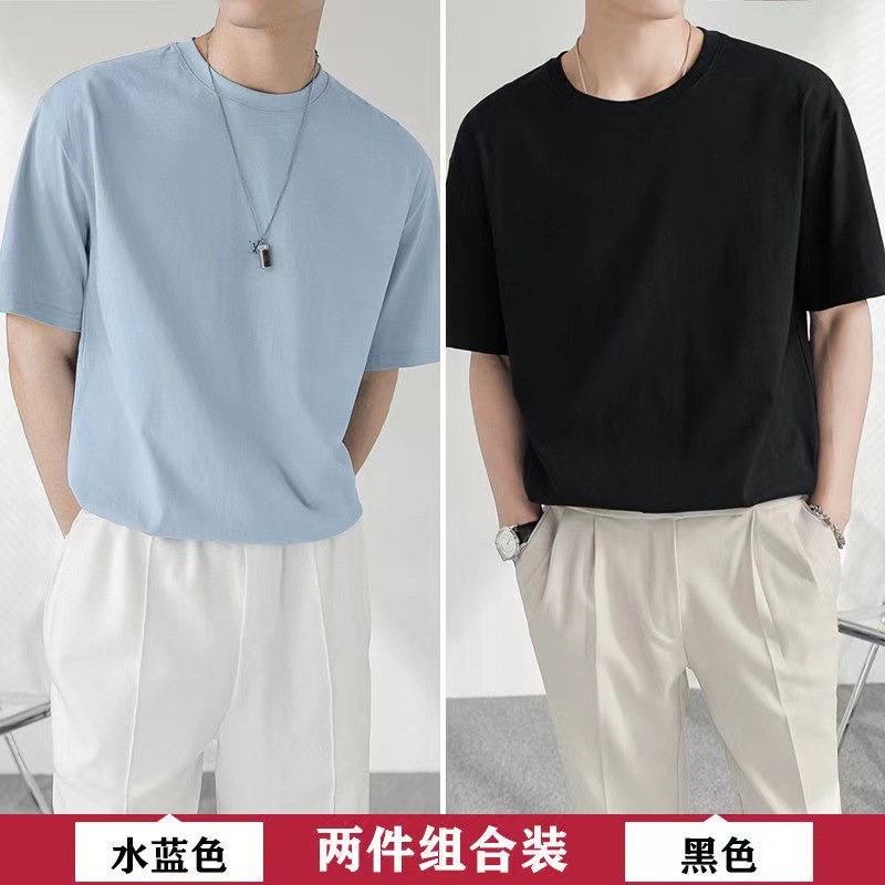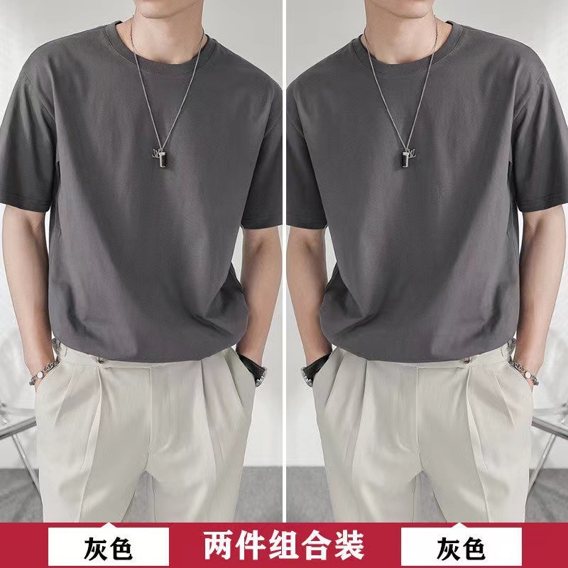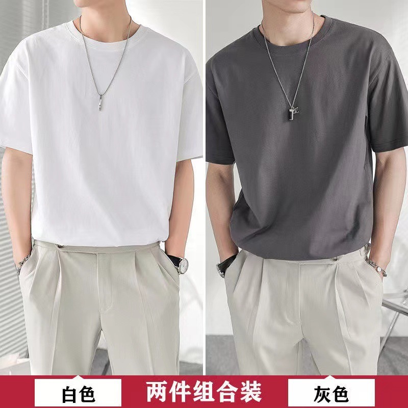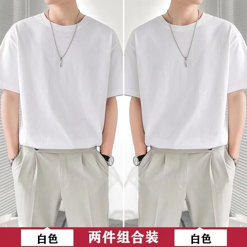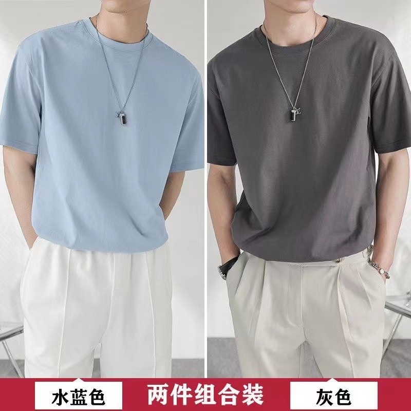 2 피스 라운드 넥 반팔 티셔츠 남성용 여름 솔리드 컬러 퓨어 코트베이스 셔츠 간단한 루즈 하이 엔드 센스 탑