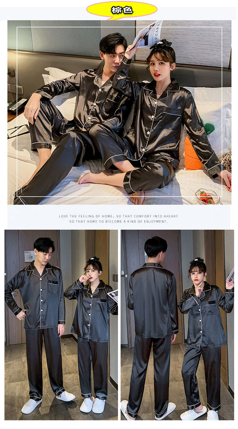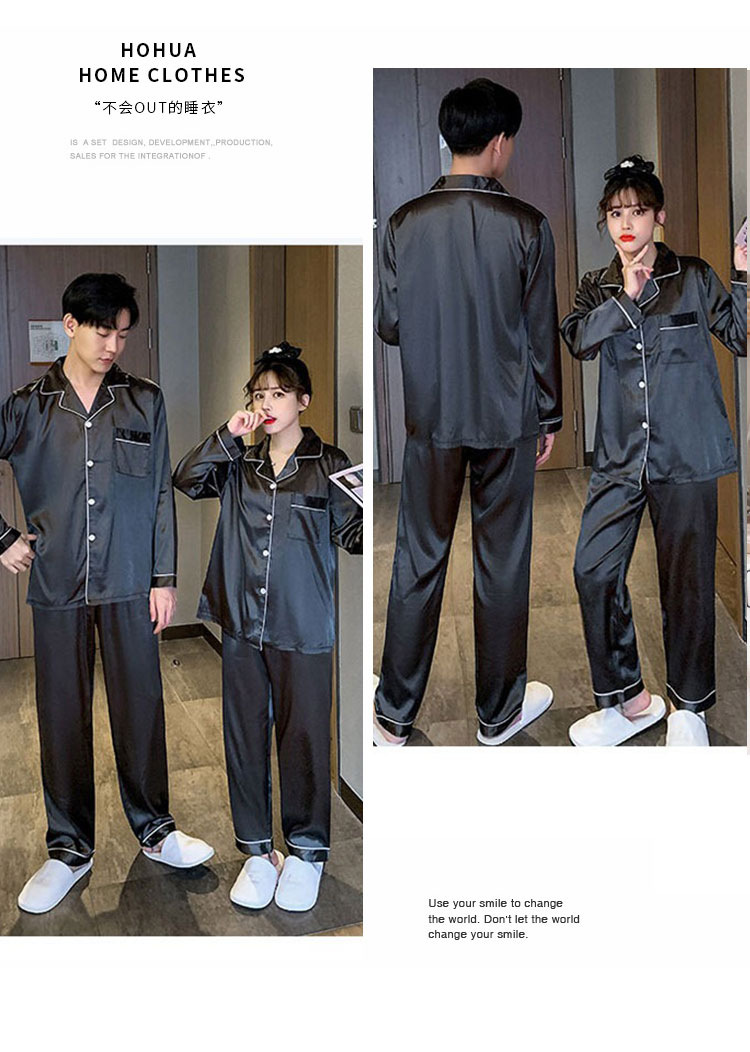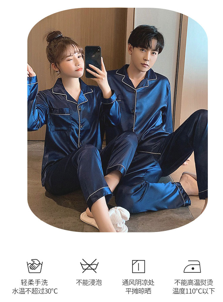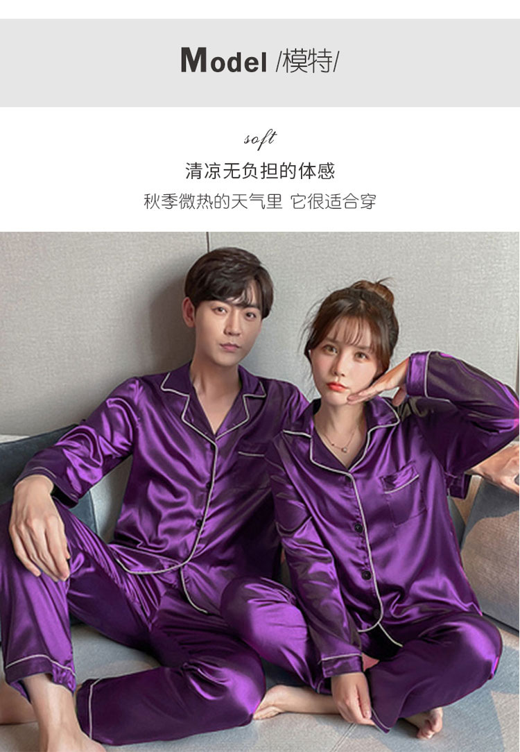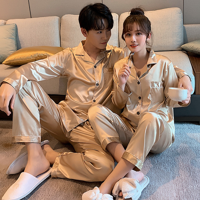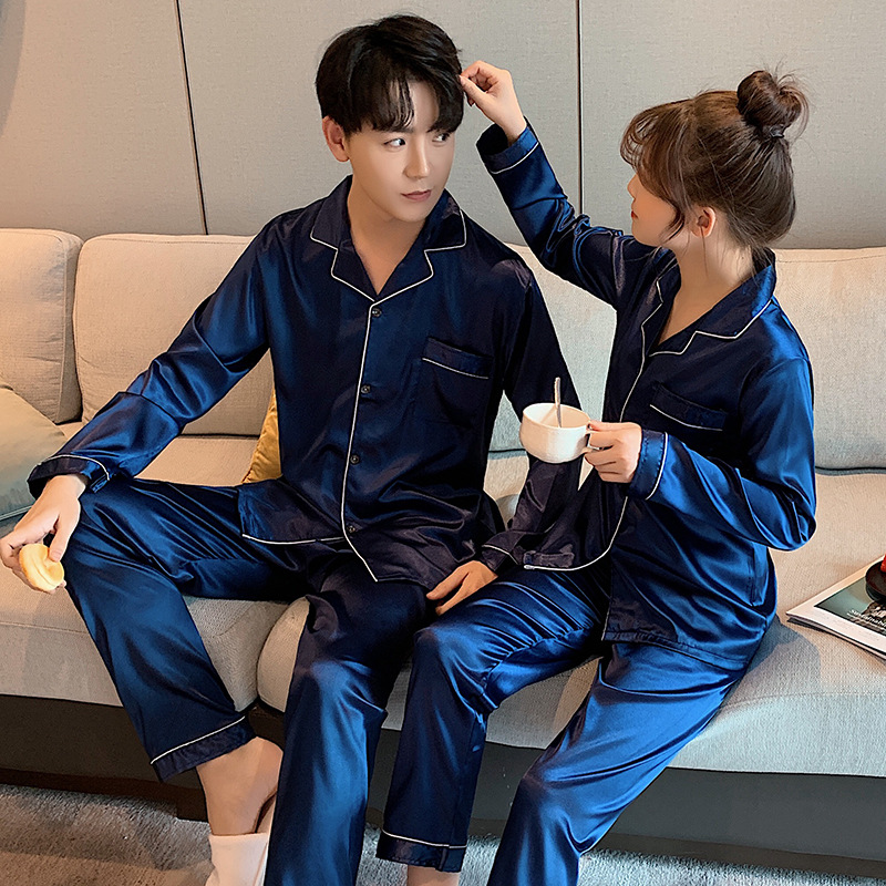 커플 잠옷 얼음 실크 긴팔 바지 봄, 가을 얇은 느슨한 대형 단색 간단한 시뮬레이션 실크 가정 의류 세트