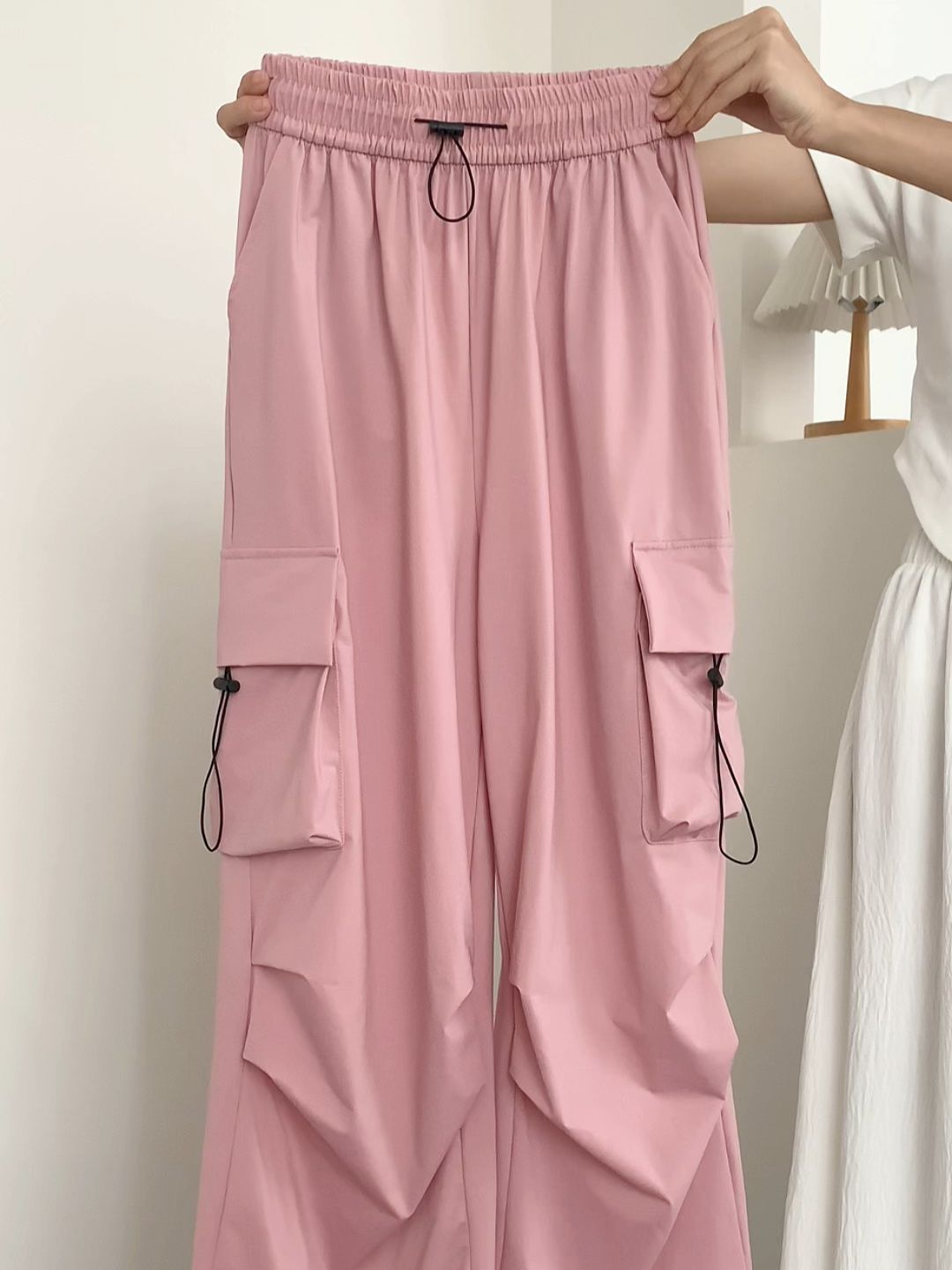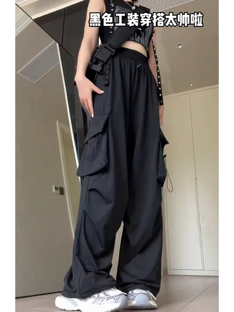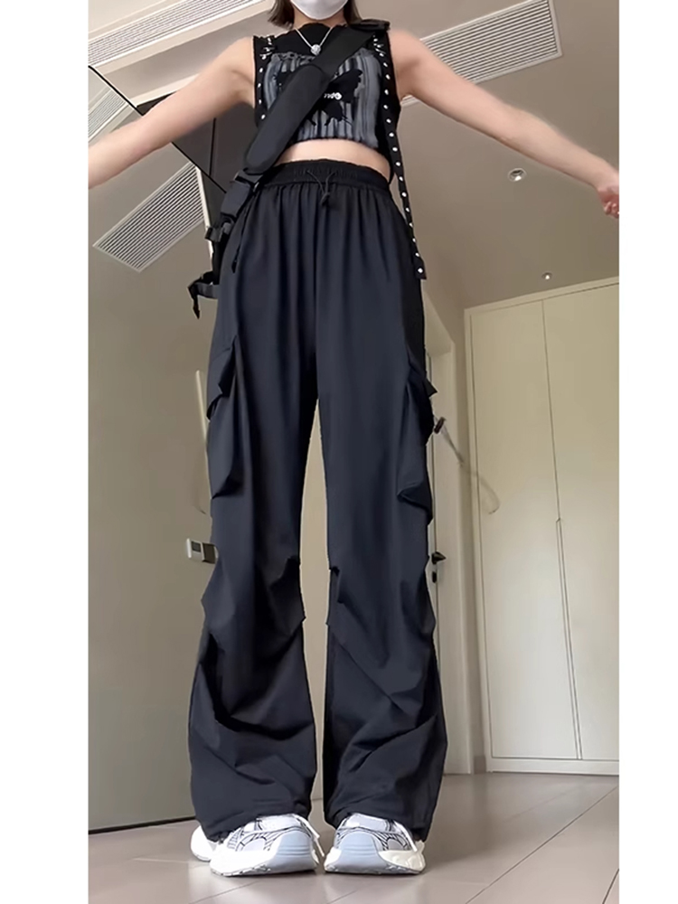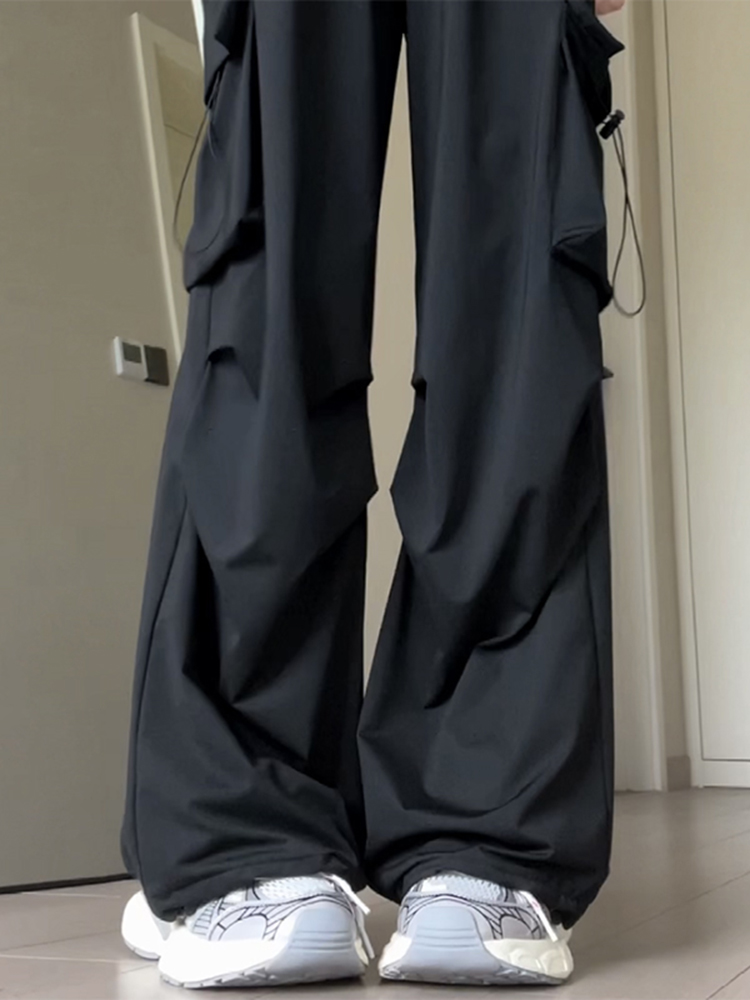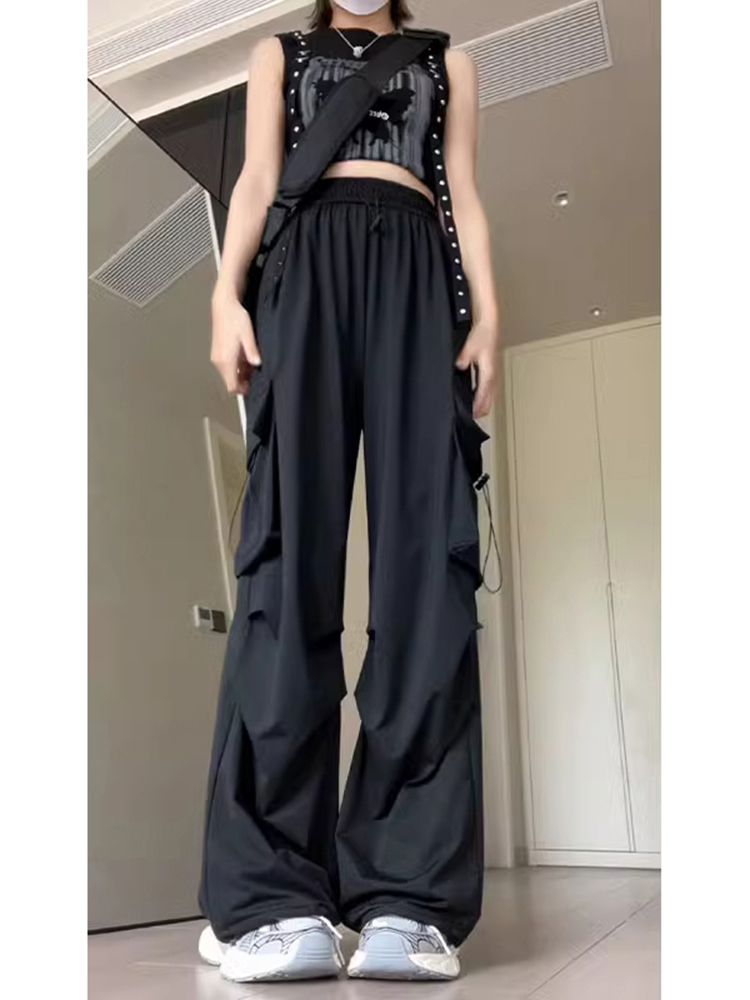 검은 바지 여성 중학생 2025 년 봄 새로운 짧은 시원한 수시 스타일 넓은 다리 빠른 건조 미국 스포츠 바지