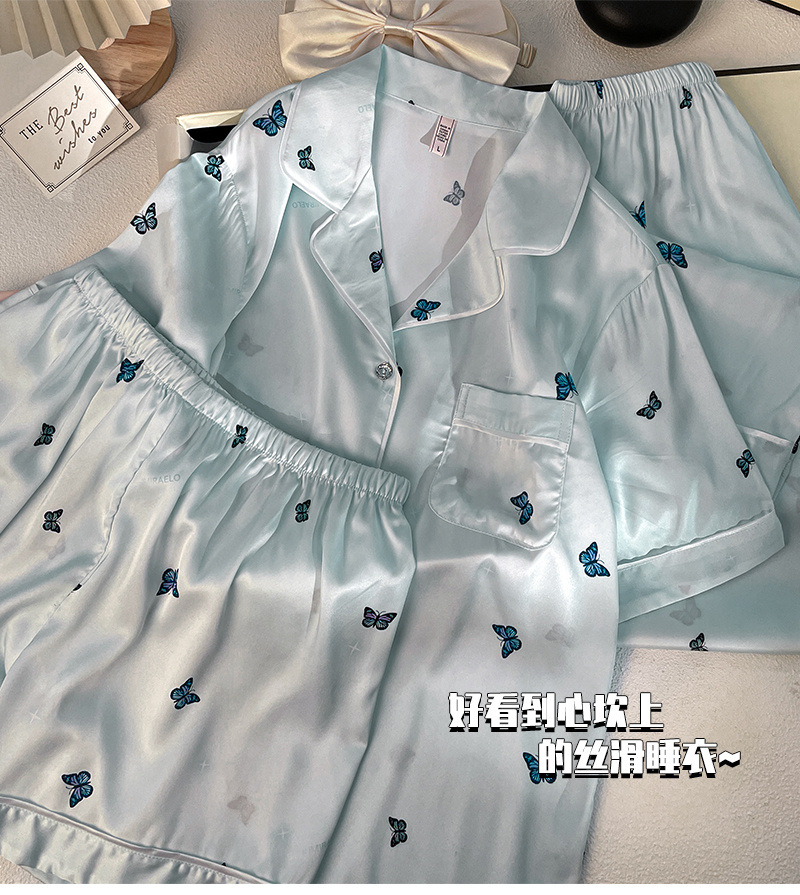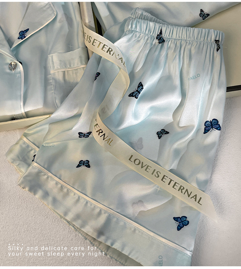 나비 3 조각 여름 잠옷 여성용 아이스 실크 고급 반팔 바지 여름 얇은 홈 의류 세트