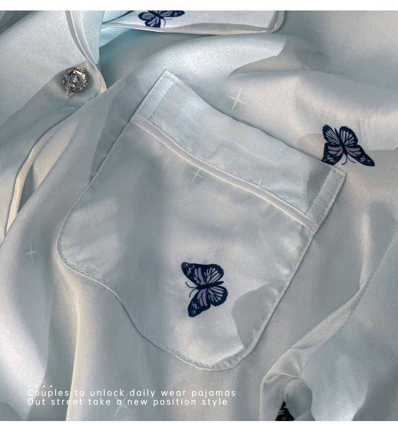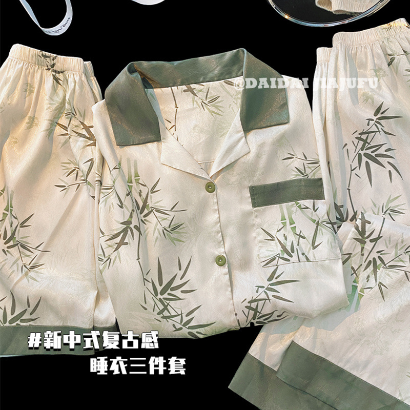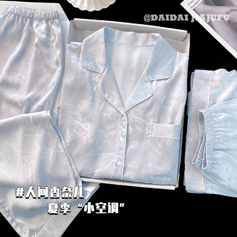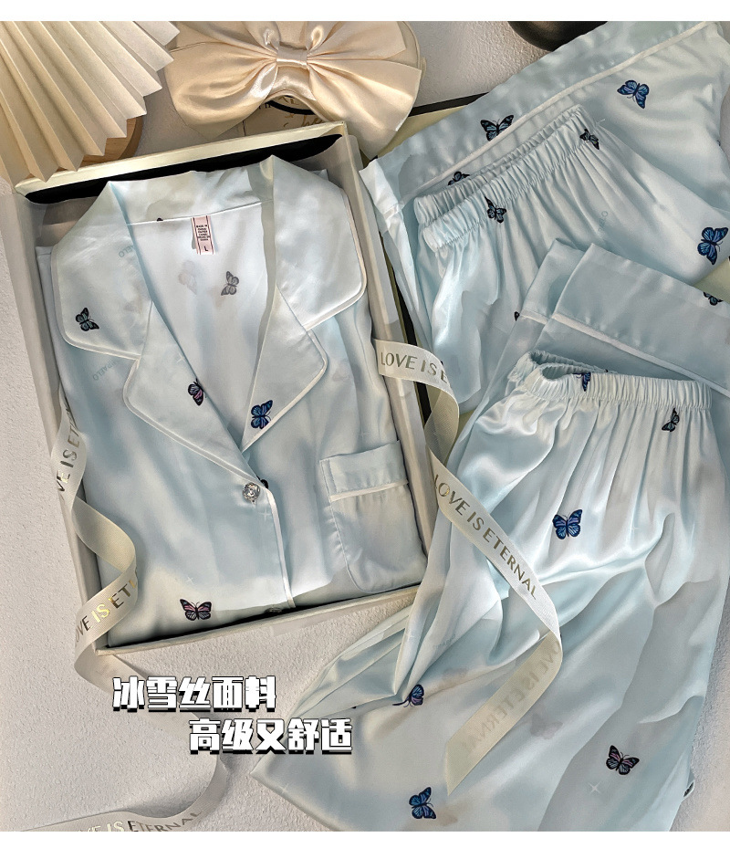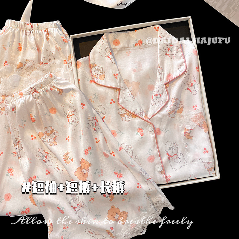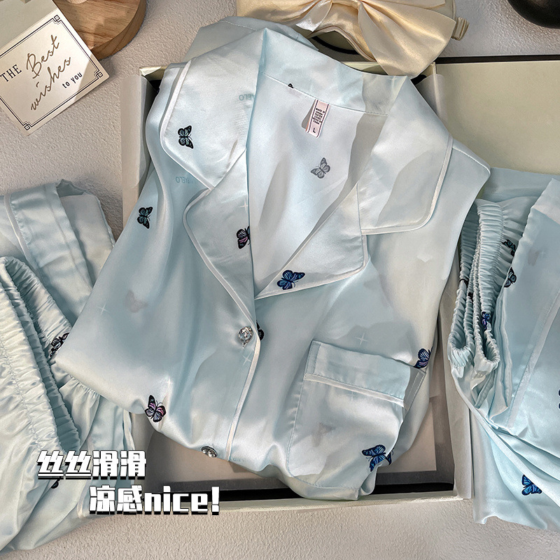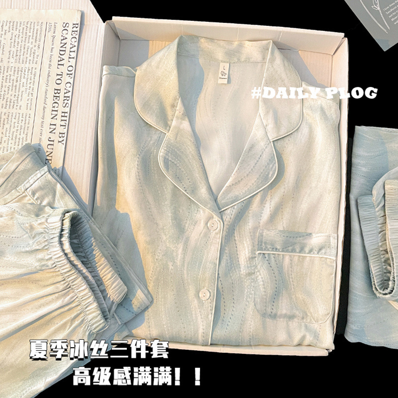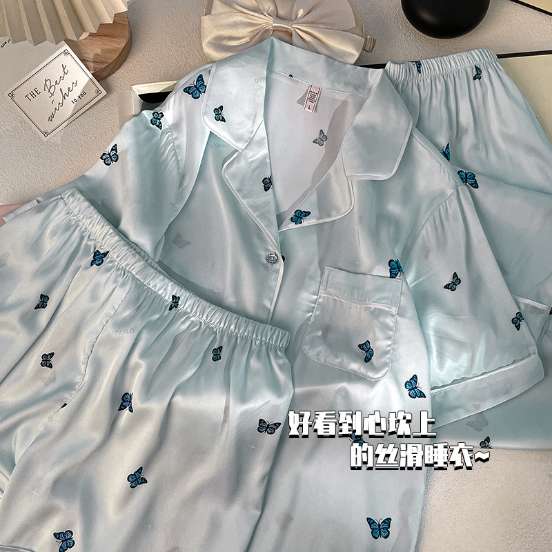 나비 3 조각 여름 잠옷 여성용 아이스 실크 고급 반팔 바지 여름 얇은 홈 의류 세트스토어 가기