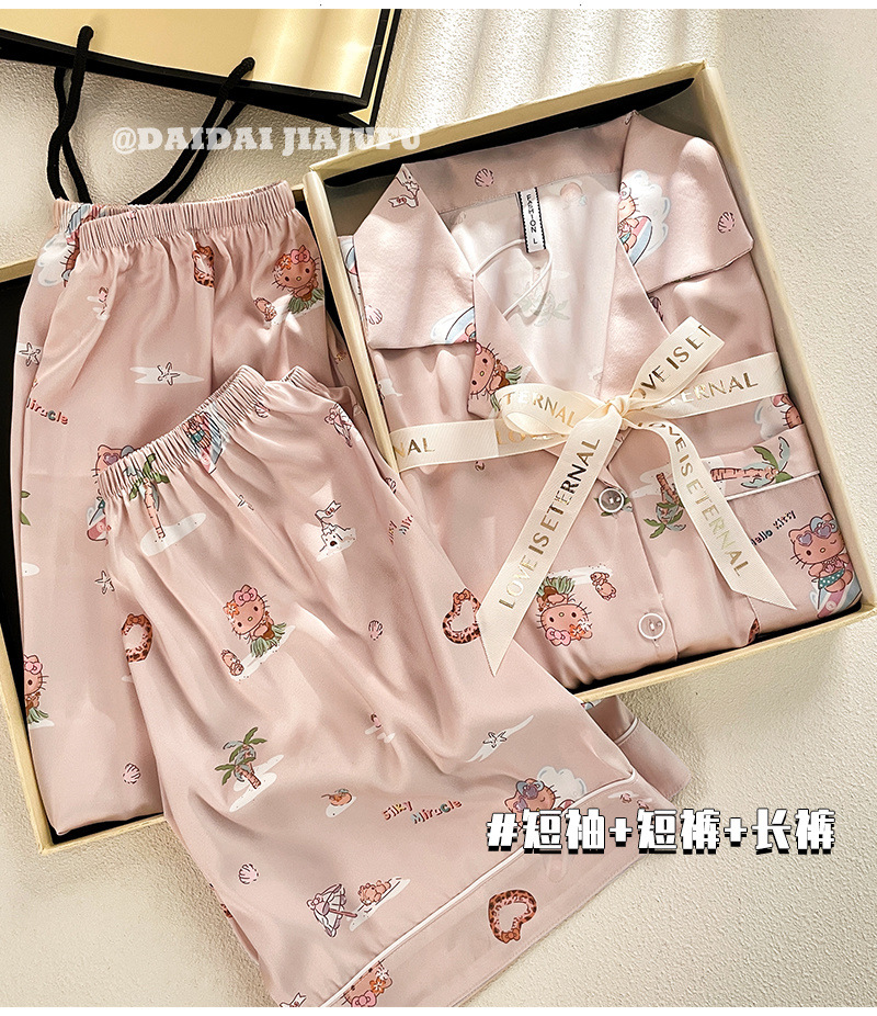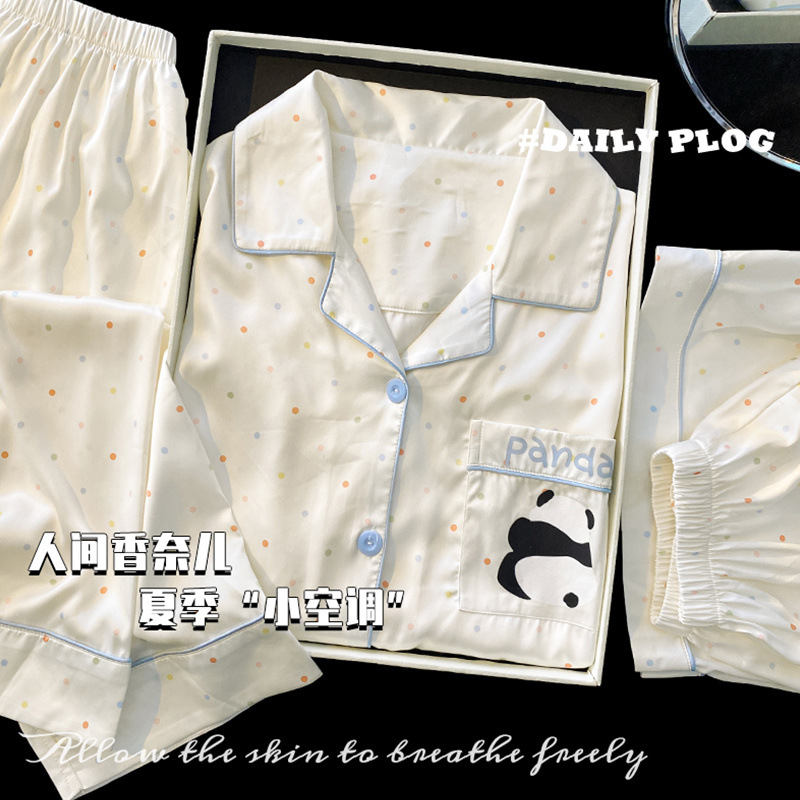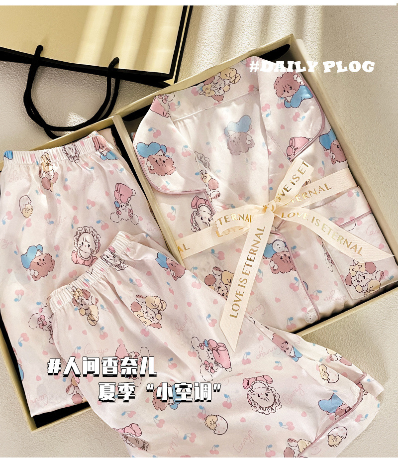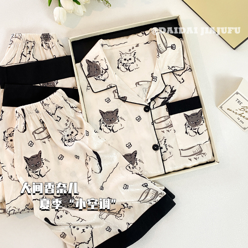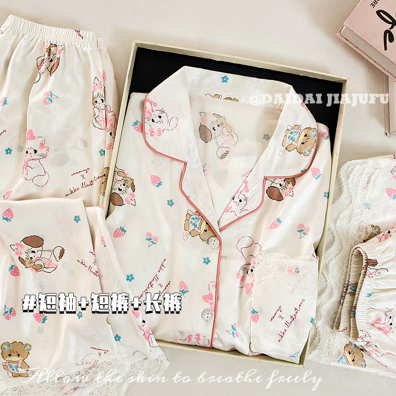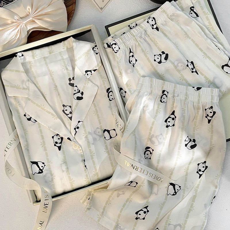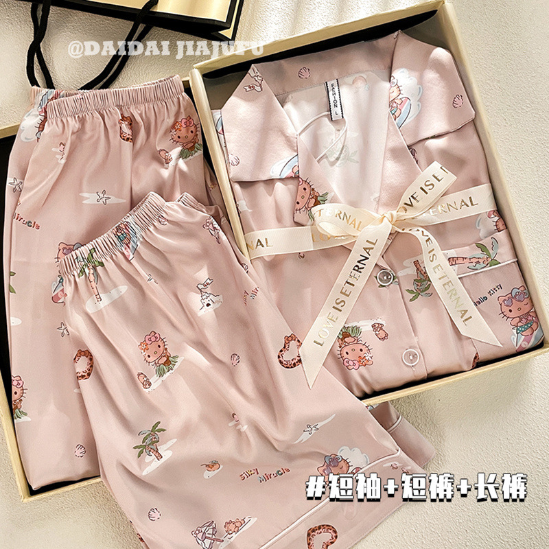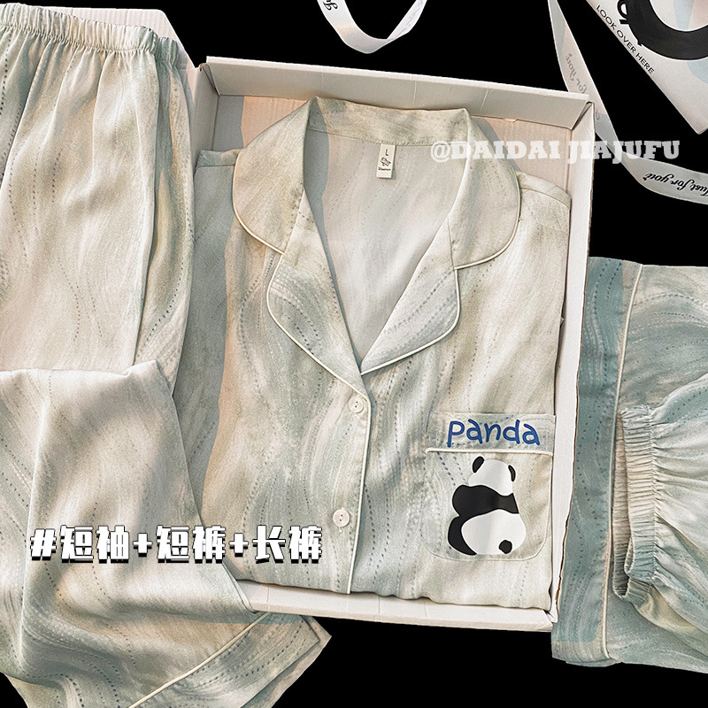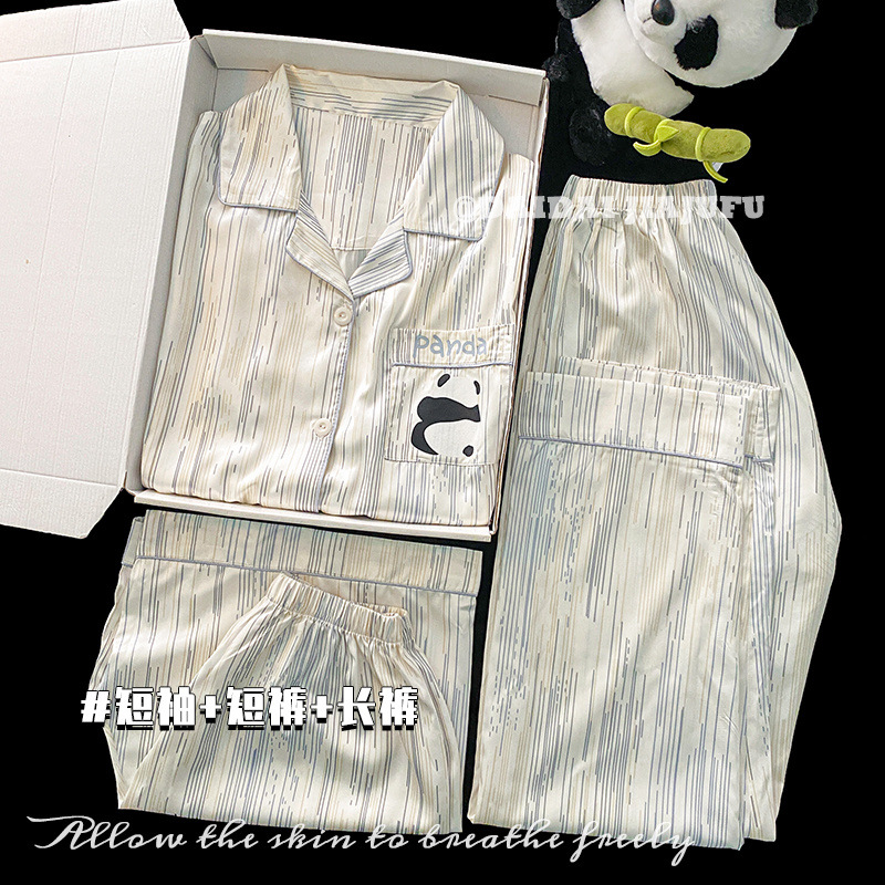 나비 3 조각 여름 잠옷 여성용 아이스 실크 고급 반팔 바지 여름 얇은 홈 의류 세트스토어 가기