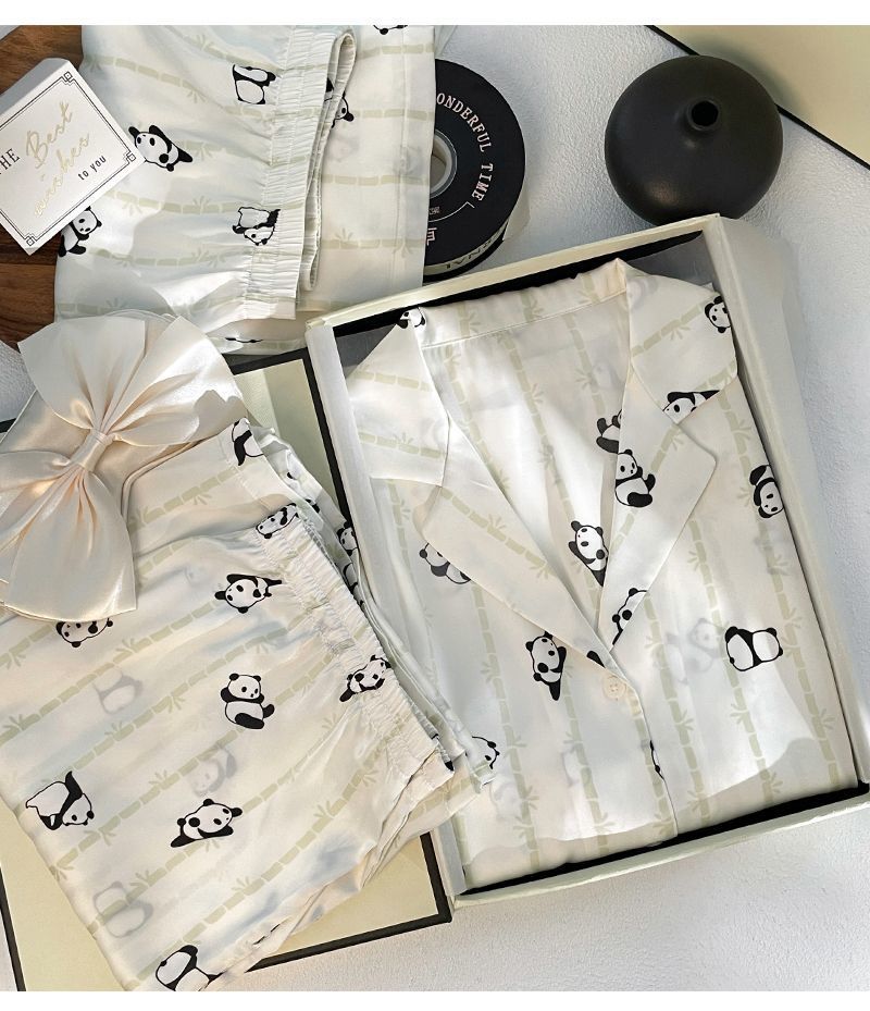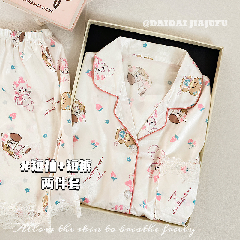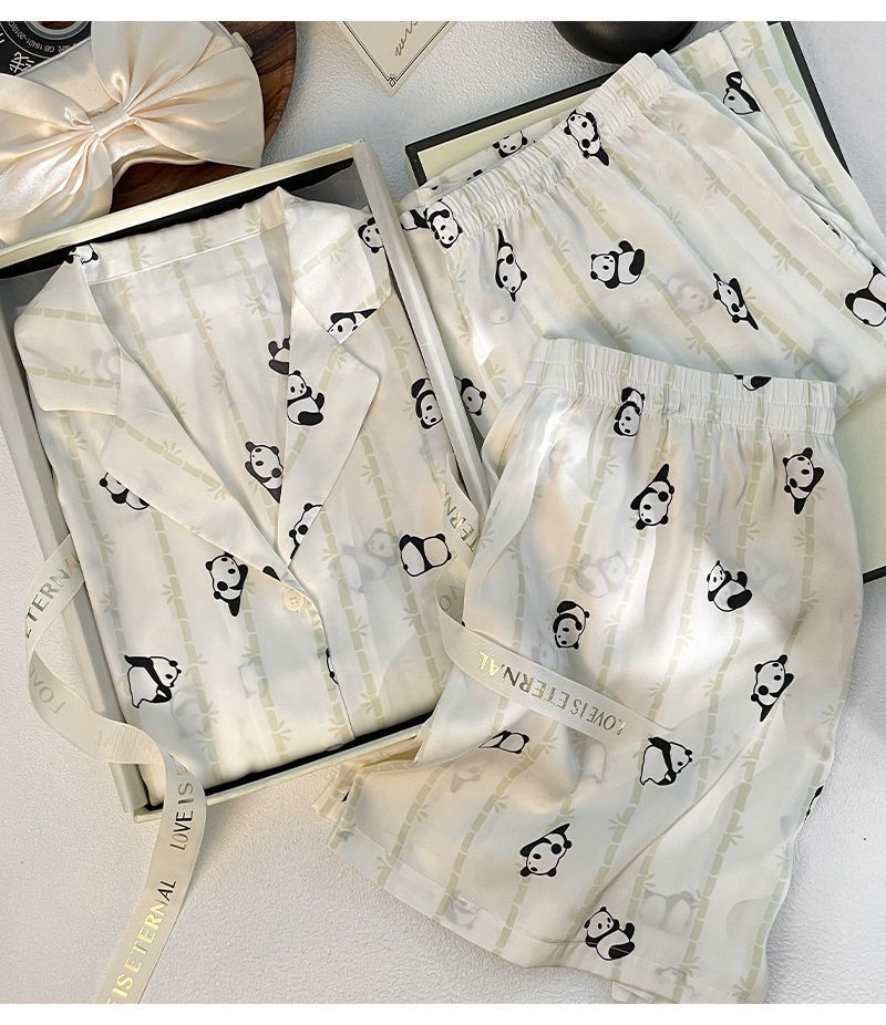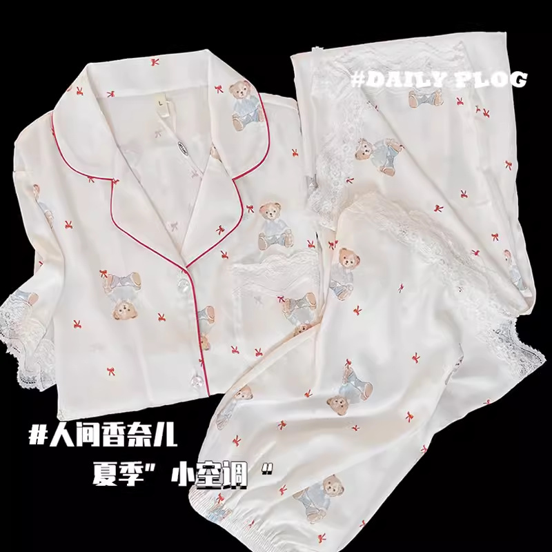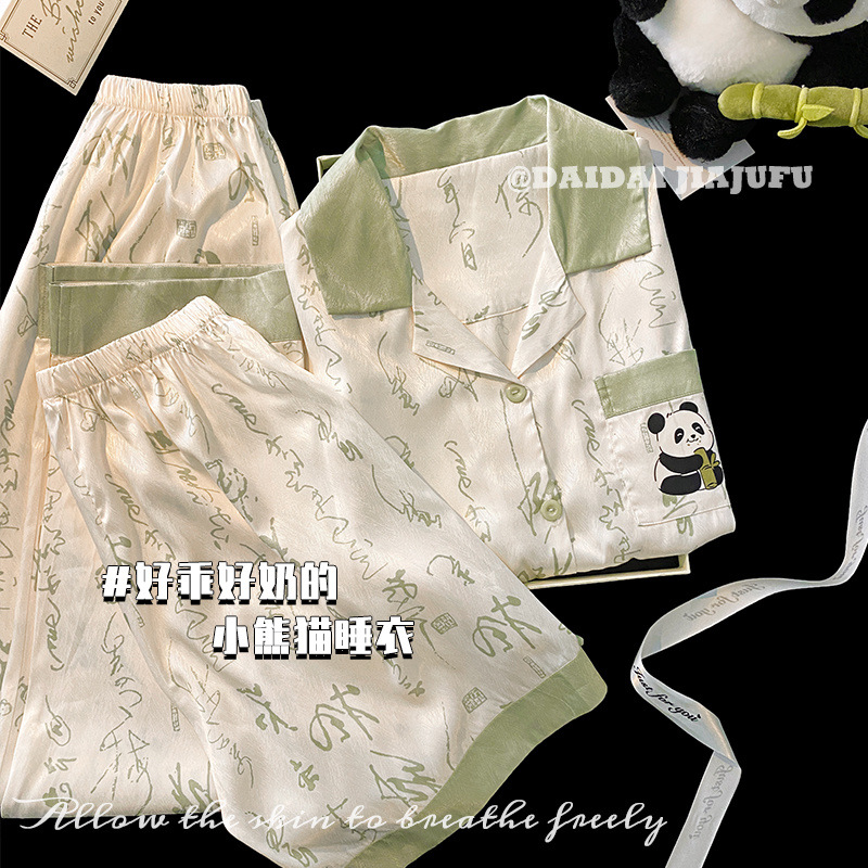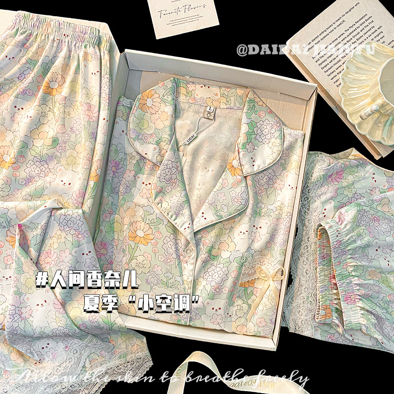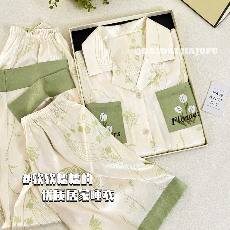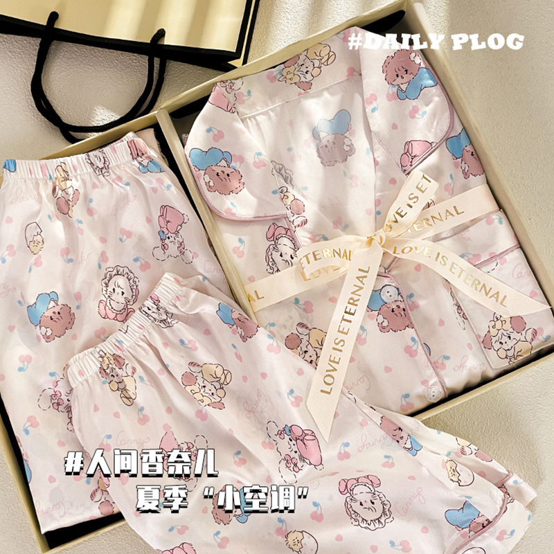 나비 3 조각 여름 잠옷 여성용 아이스 실크 고급 반팔 바지 여름 얇은 홈 의류 세트스토어 가기
