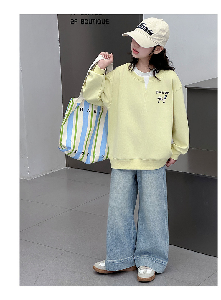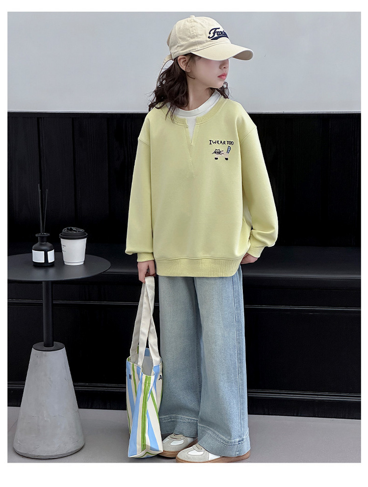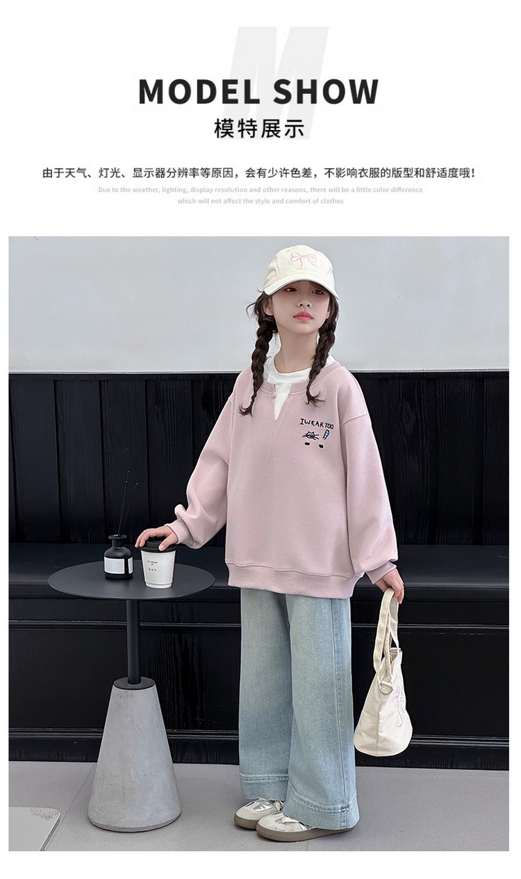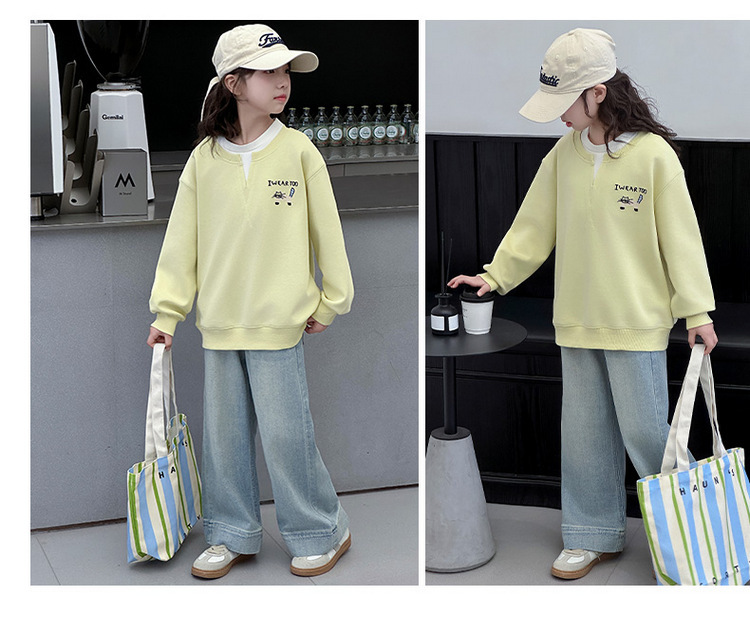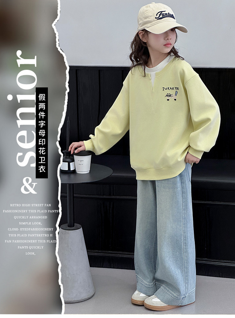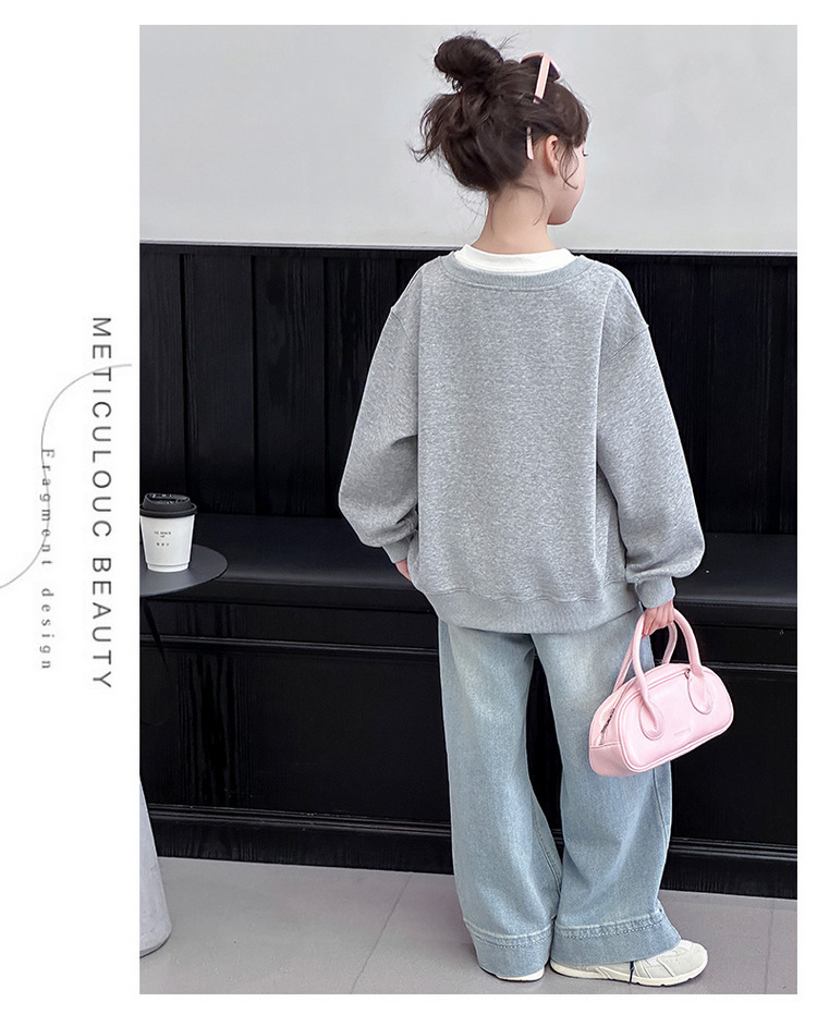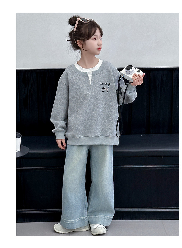여아용 봄 정장, 페이크 투피스 스웨트셔츠, 한국 스타일 의상, 중대형 아동용, 패셔너블하고 귀여운 캐주얼 청바지 투피스 세트스토어 가기