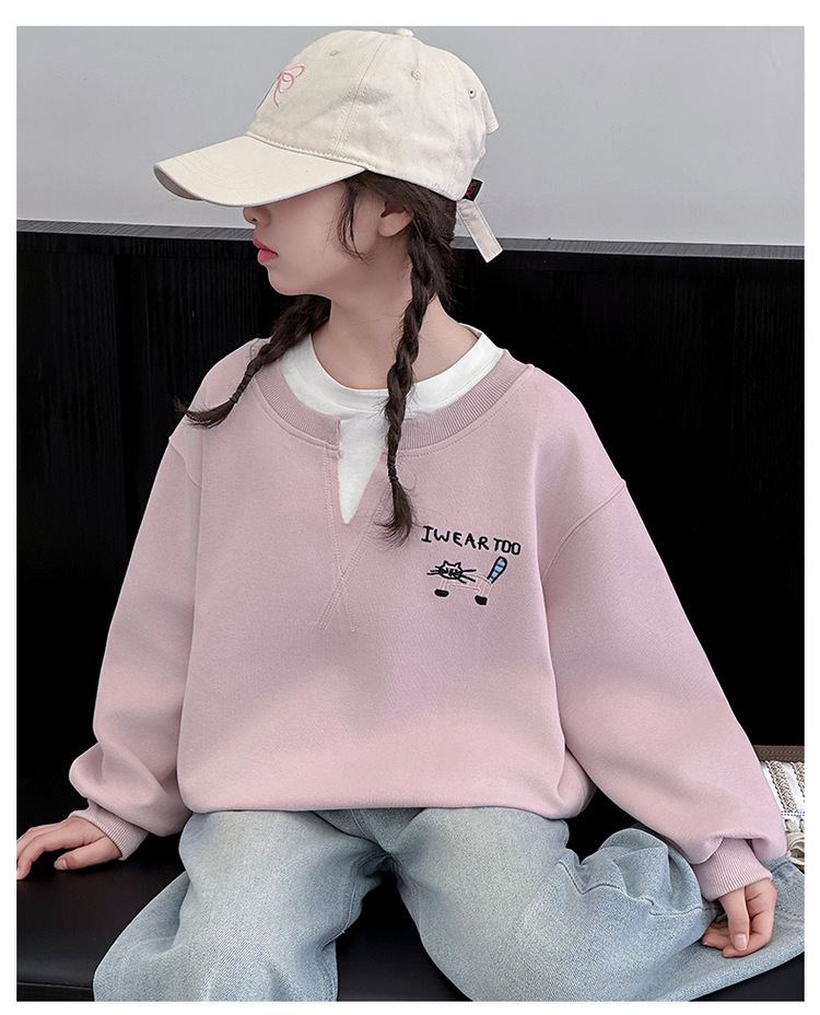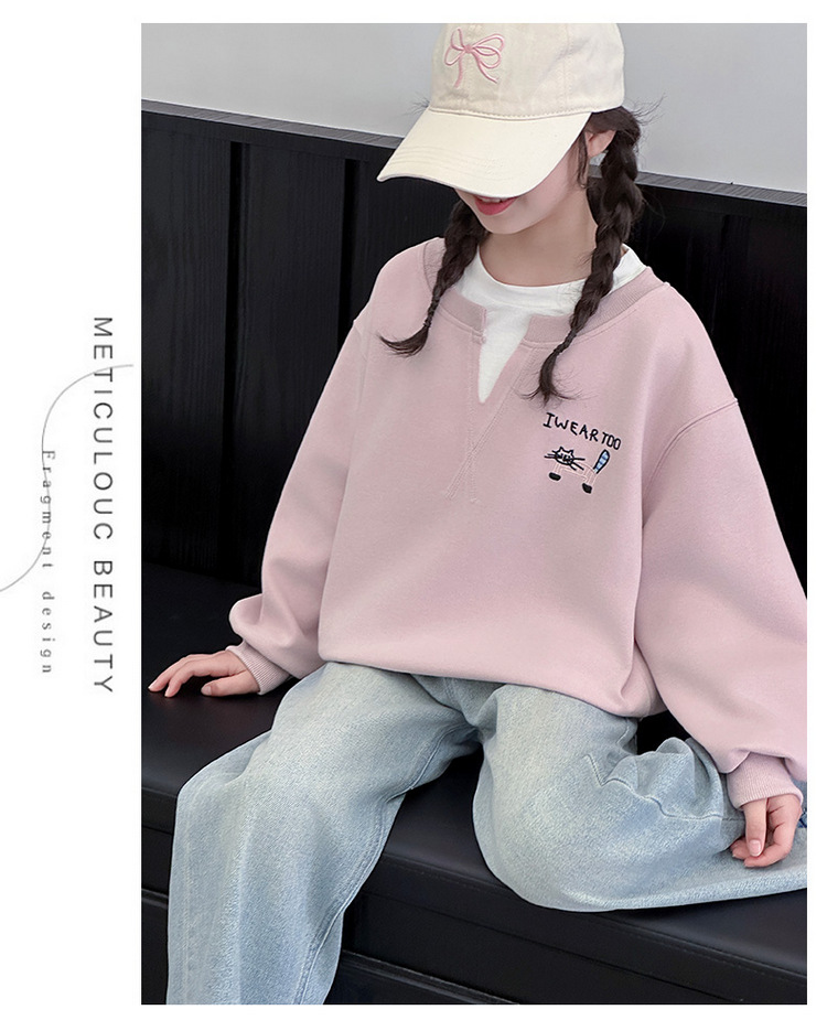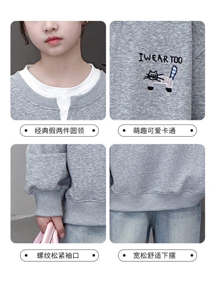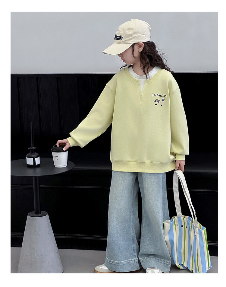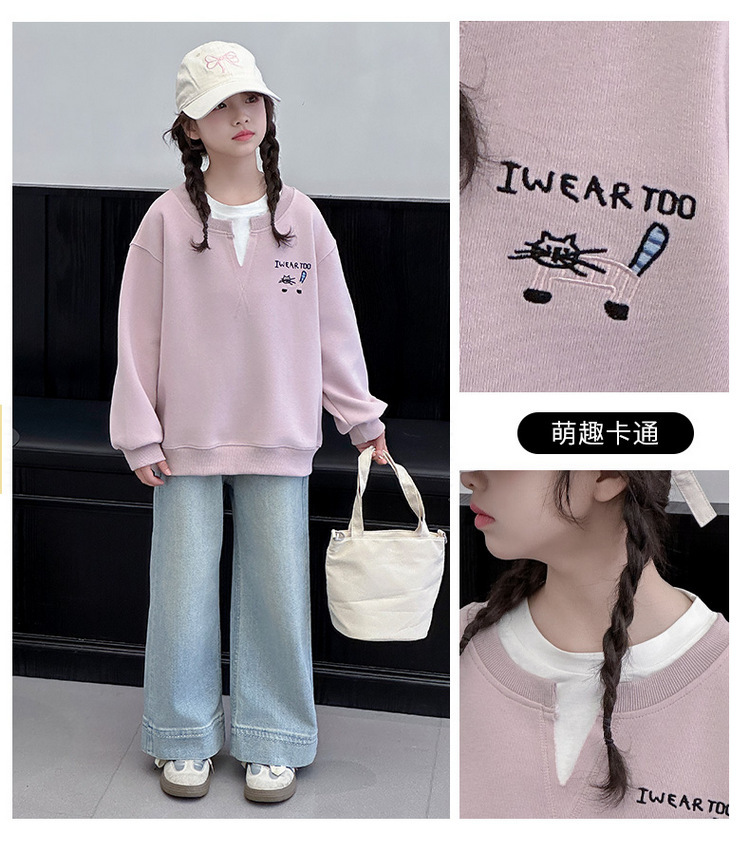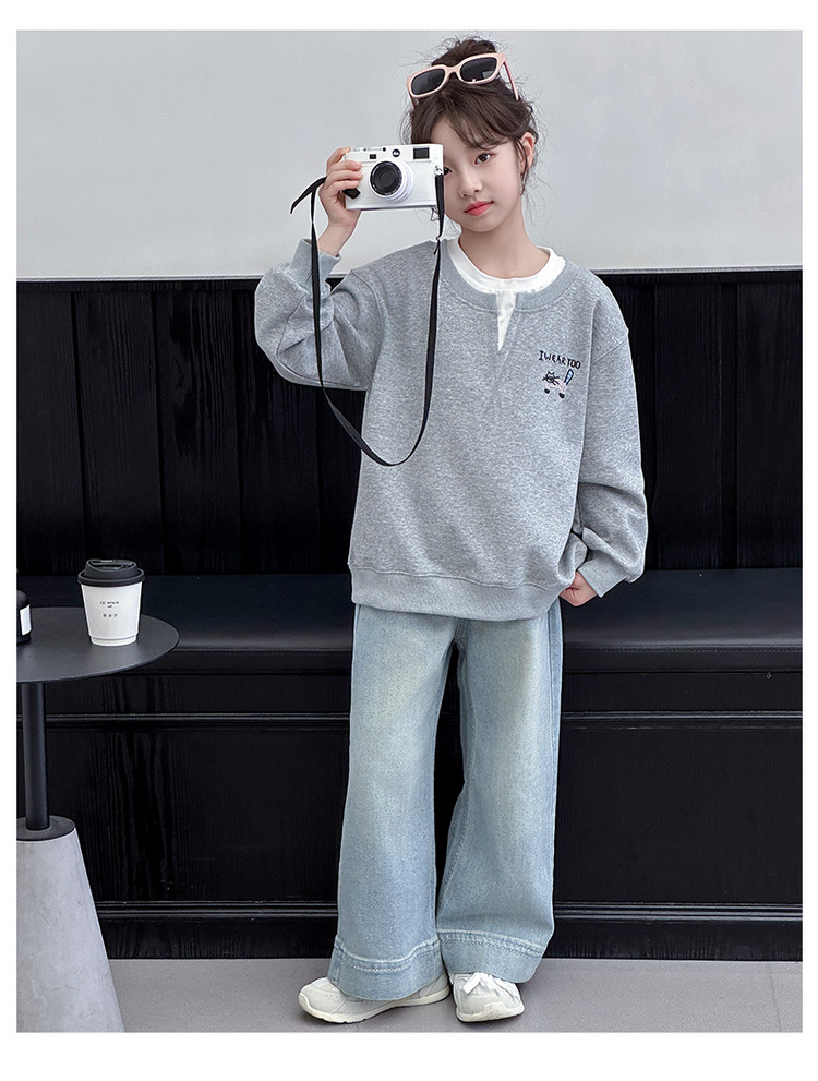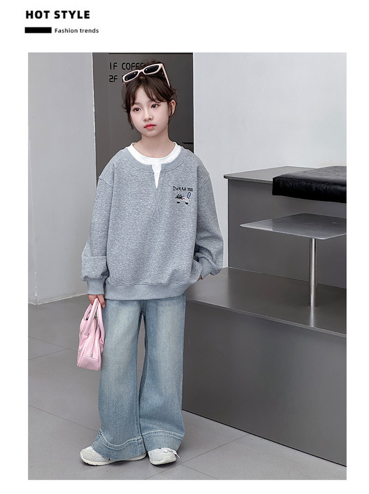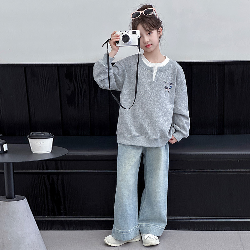 여아용 봄 정장, 페이크 투피스 스웨트셔츠, 한국 스타일 의상, 중대형 아동용, 패셔너블하고 귀여운 캐주얼 청바지 투피스 세트