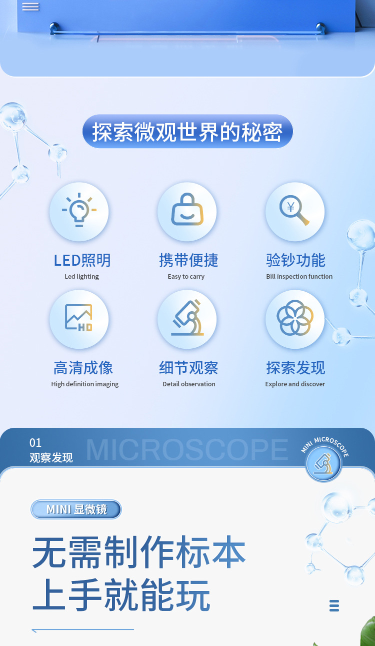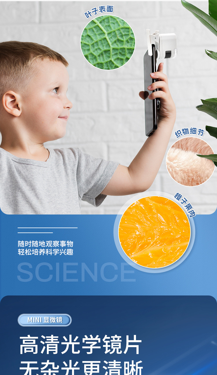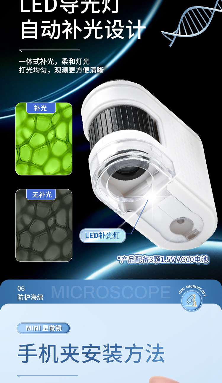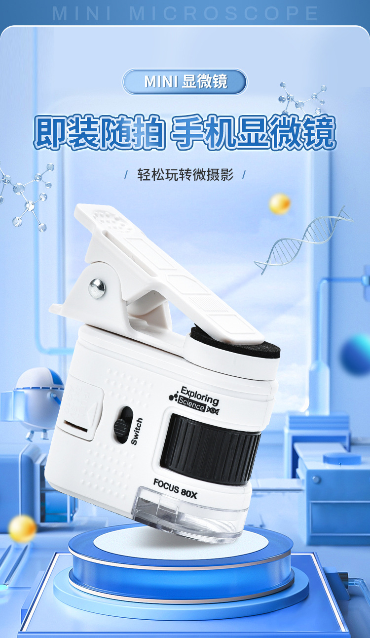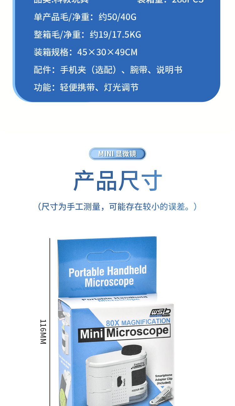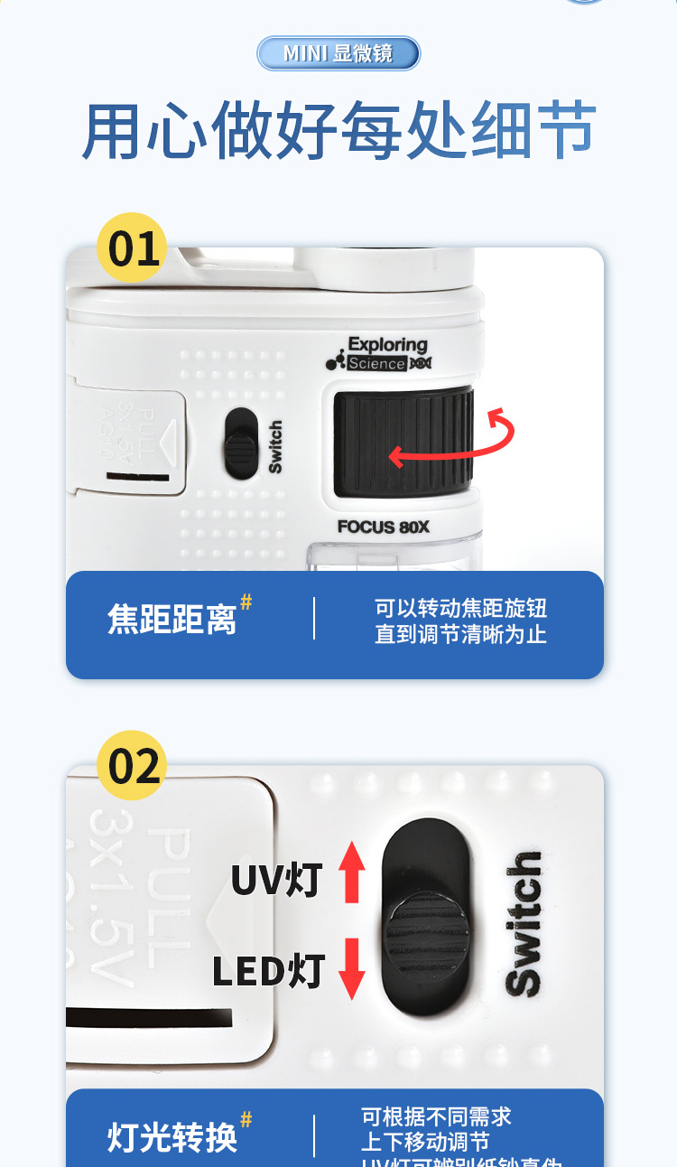 고화질 어린이용 포켓 현미경 미니 과학 80배율 휴대용 초등학교 교육용 장난감 (지폐 감별등 포함)