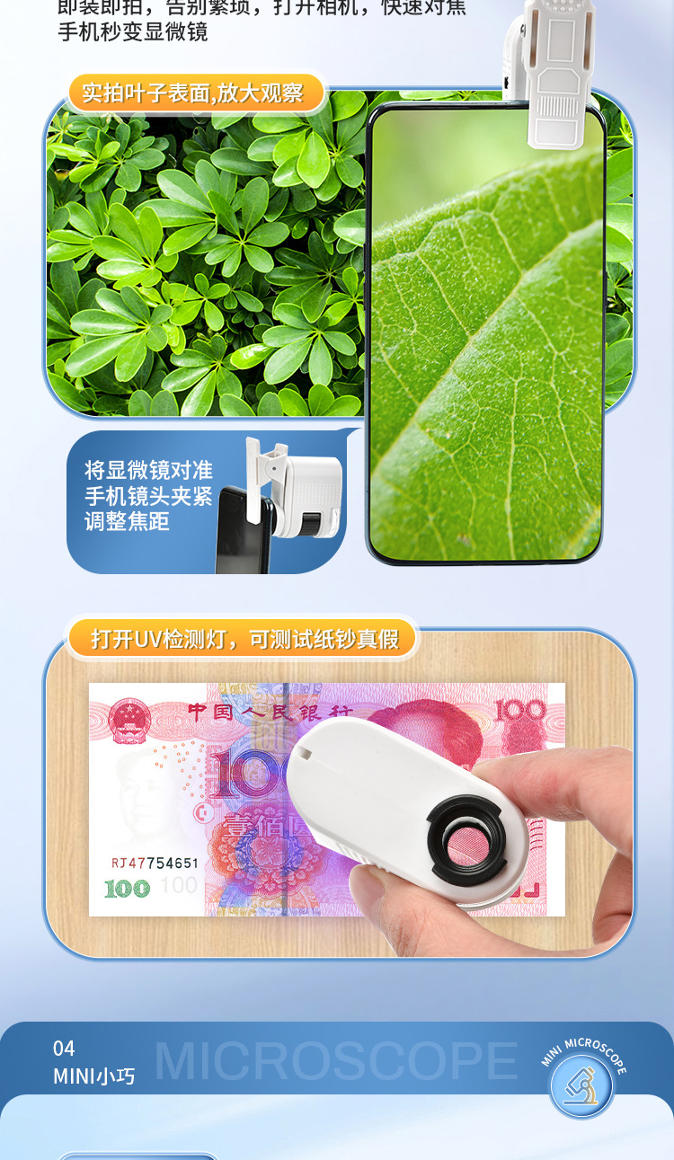 • 80배 휴대용 미니 현미경 화이트 + 스트랩 + 휴대폰 클립 (영문 블루 포장)