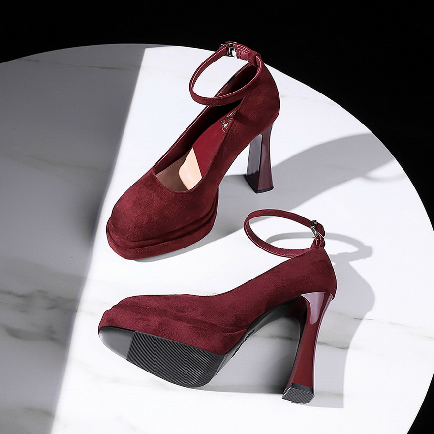 8382 달콤한 스타일 스타일 하이힐 플랫폼 버클 방수 플랫폼 여성 두꺼운 힐 얕은 스웨이드 싱글 레이어 신발 라운드 토 슈퍼 하이힐 여성 신발