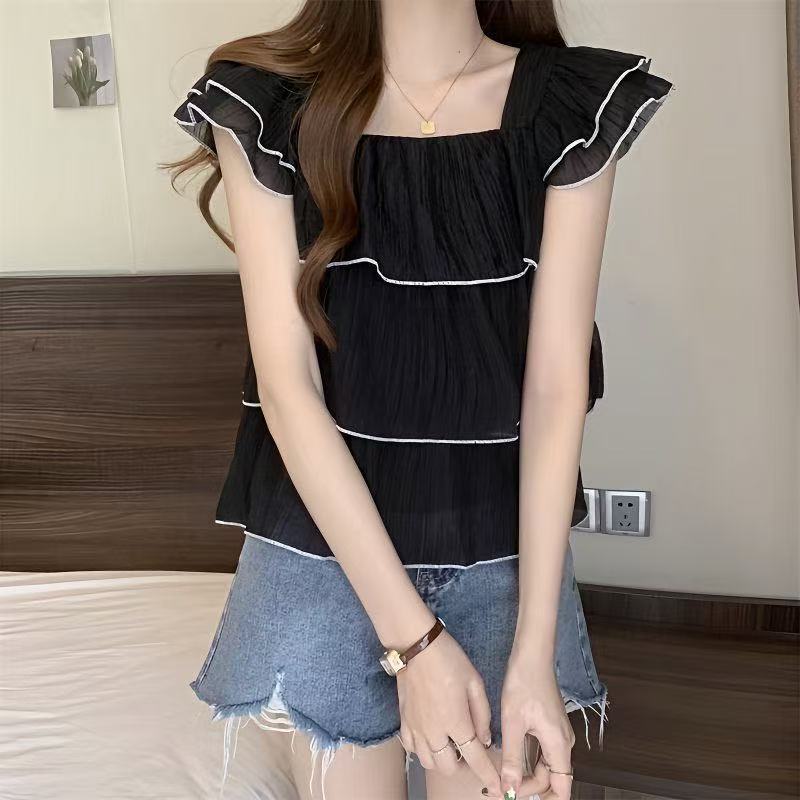 여성을 위한 작고 신선하고 달콤한 니트 스플리싱 쉬폰 셔츠, 여름 디자인, 틈새 프릴, 겉옷용 루즈한 배 커버 탑스토어 가기