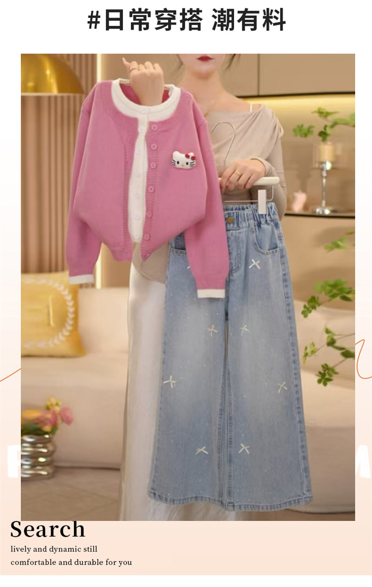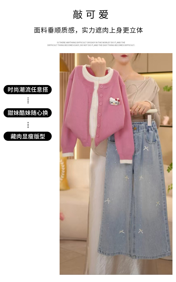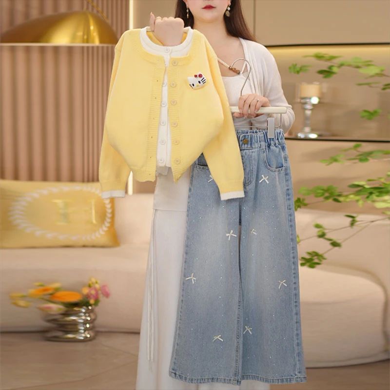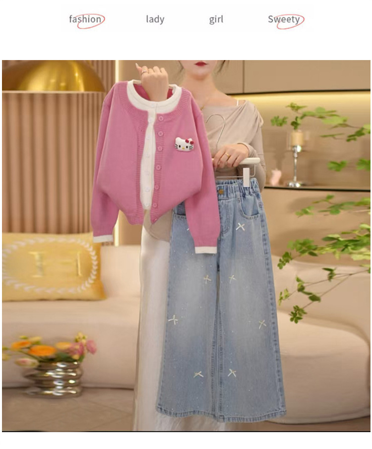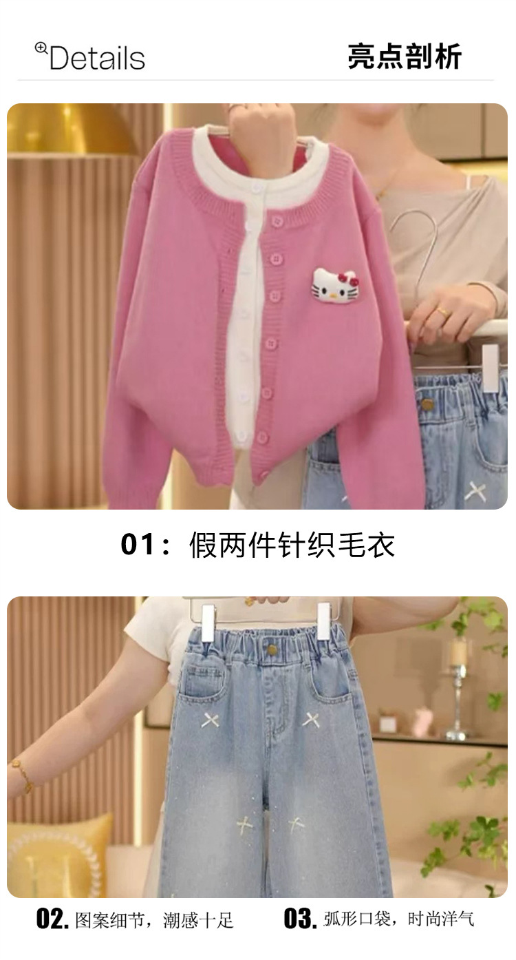여자 봄 정장 한국 스타일 2025 새로운 어린이 달콤한 가짜 투피스 스웨터 핫 다이아몬드 청바지 투피스 세트 유행
