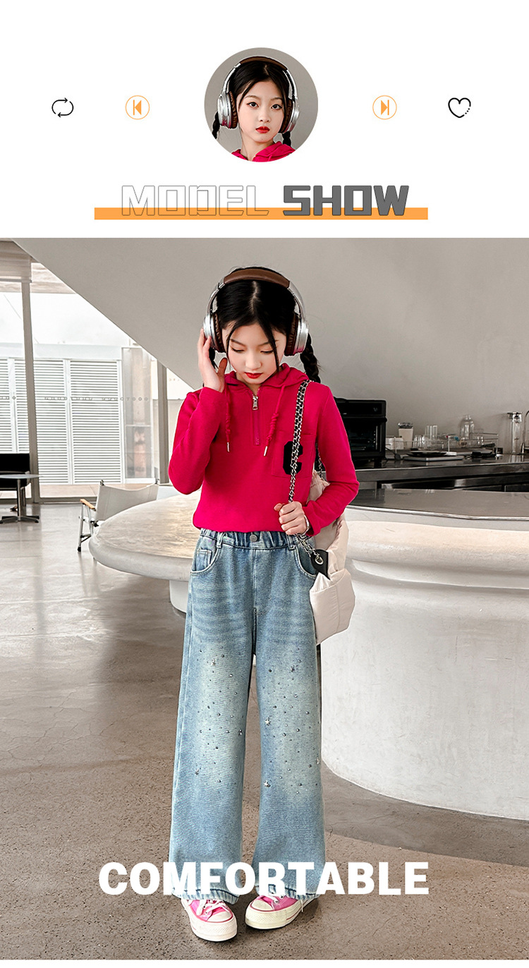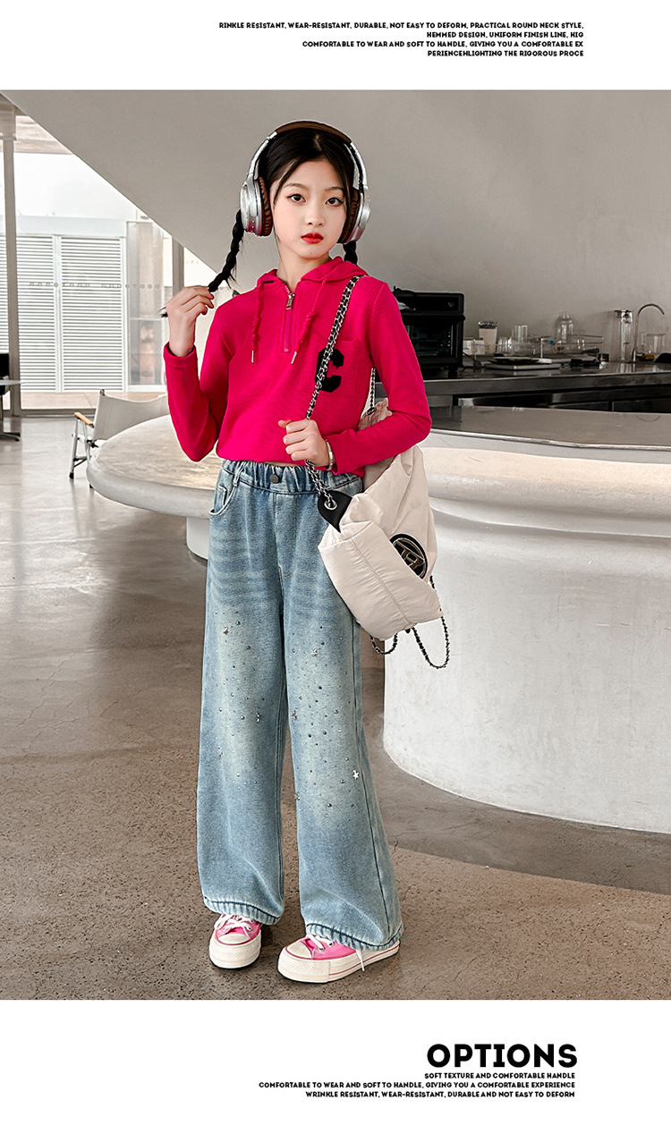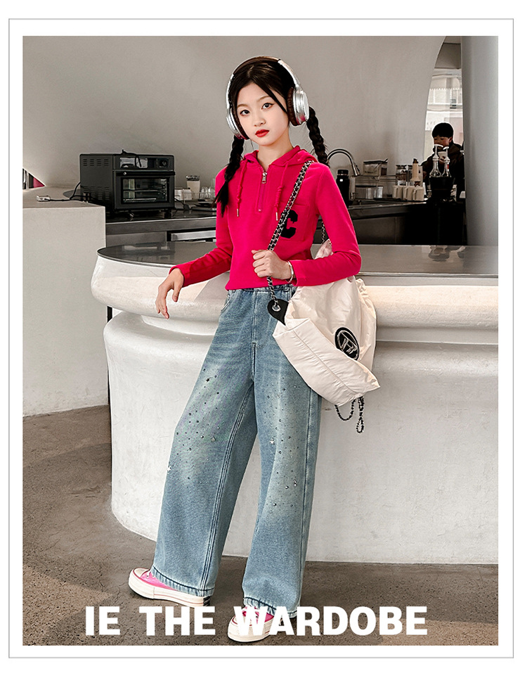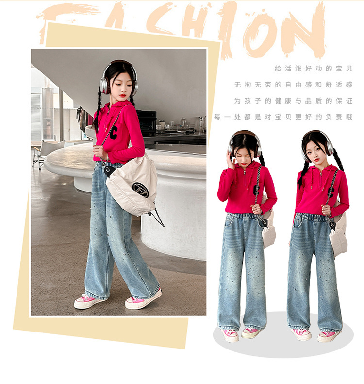 2025 봄과 가을 새로운 스타일 여아 루즈한 청바지 정장, 패셔너블하고 스타일리시한 여아 스웨트셔츠, 중대형 어린이를 위한 와이드 레그 투피스스토어 가기