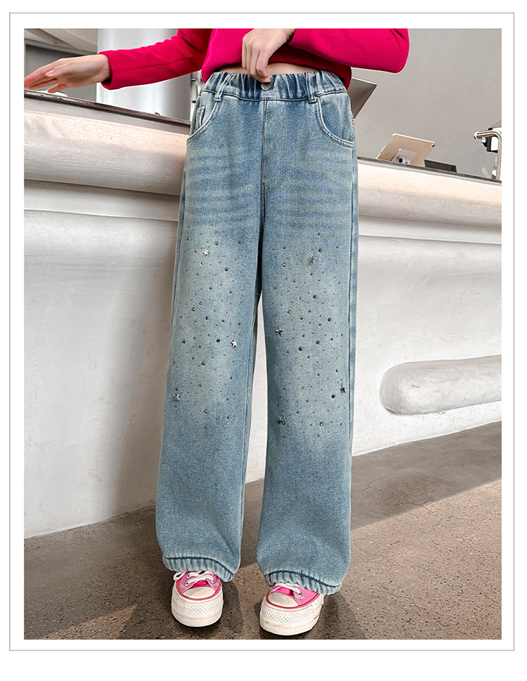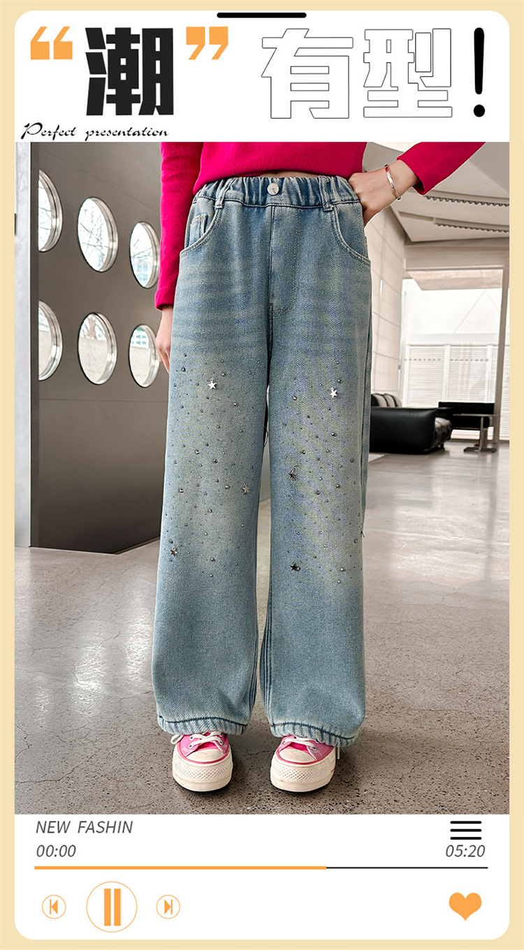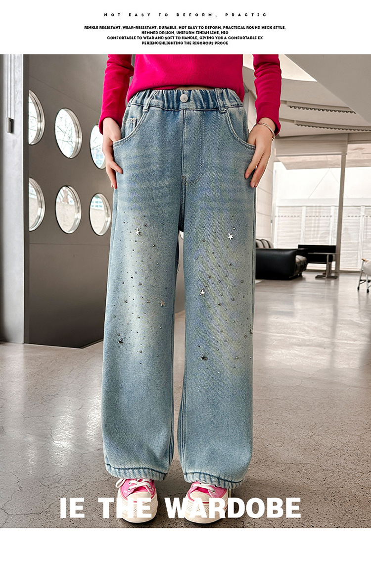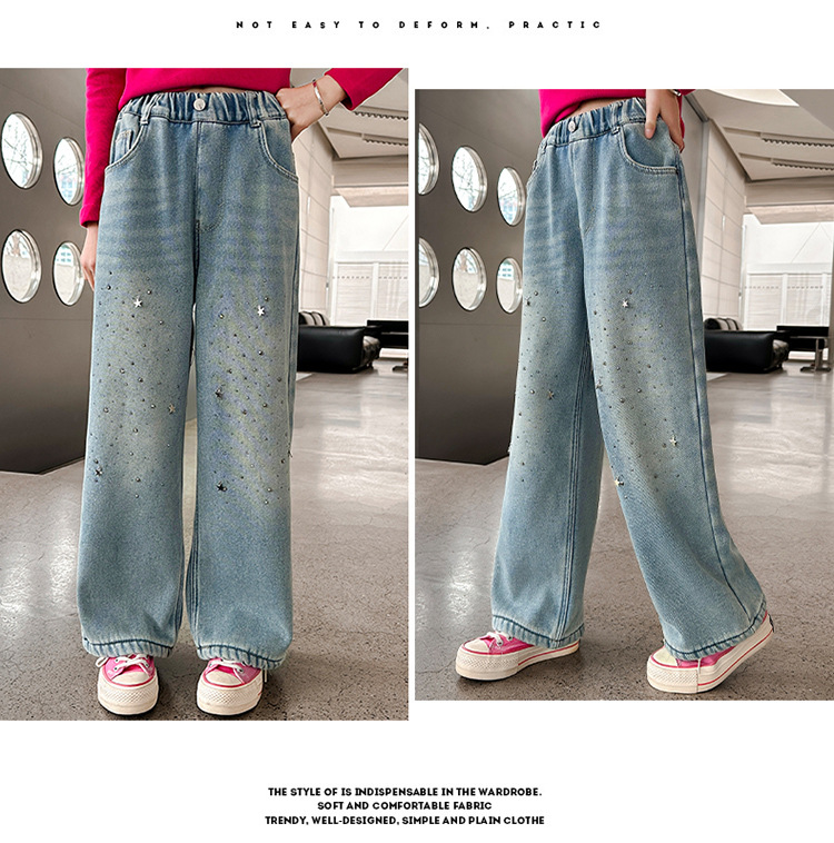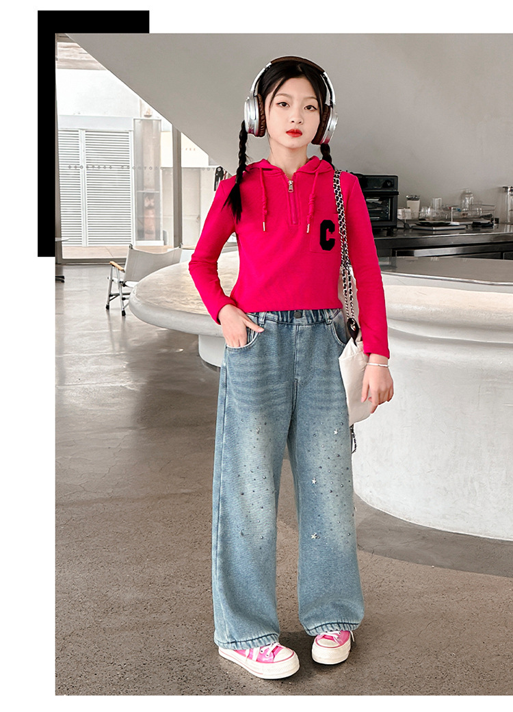 2025 봄과 가을 새로운 스타일 여아 루즈한 청바지 정장, 패셔너블하고 스타일리시한 여아 스웨트셔츠, 중대형 어린이를 위한 와이드 레그 투피스스토어 가기