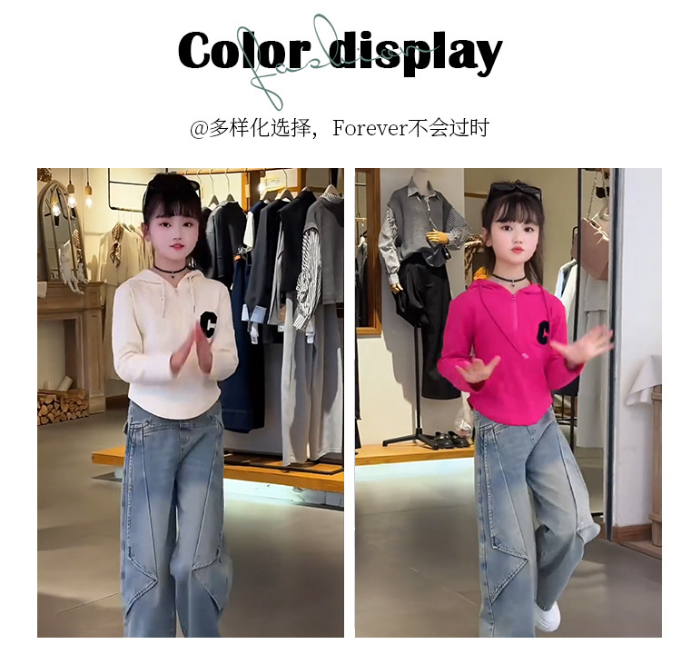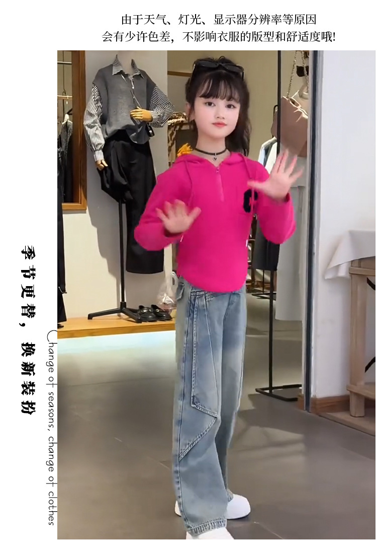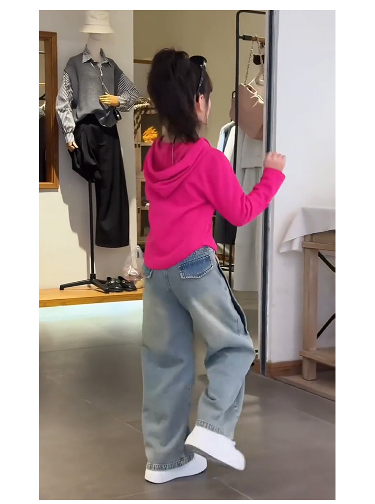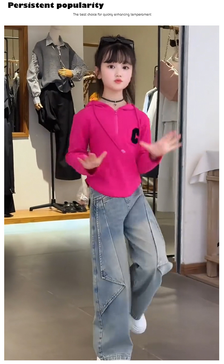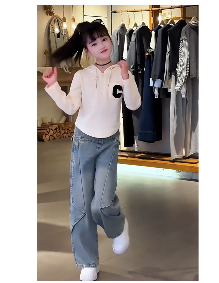 여아 봄 정장 한국 스타일 다목적 2025 새로운 스타일 중대형 아동용 후드 티셔츠 청바지 투피스 세트 유행스토어 가기