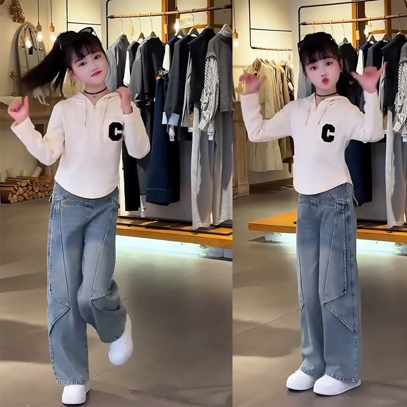 여아 봄 정장 한국 스타일 다목적 2025 새로운 스타일 중대형 아동용 후드 티셔츠 청바지 투피스 세트 유행