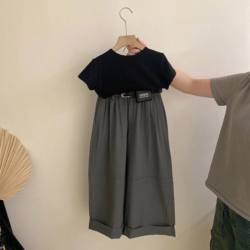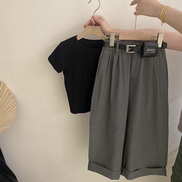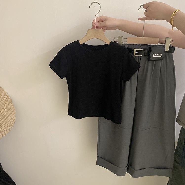 여자 여름 세트 2025 새로운 패션 걸스 여름 단색 반팔 캐주얼 루즈 바지 투피스 세트 트렌디