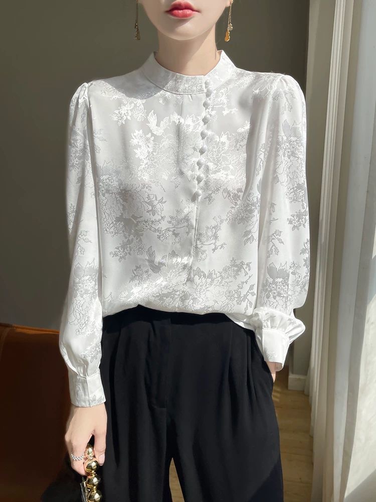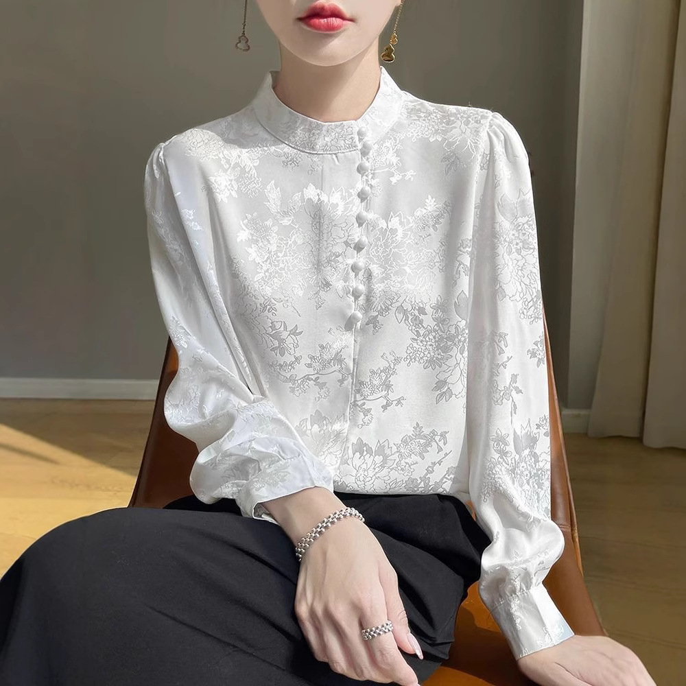가벼운 Guofeng 화이트 쉬폰 셔츠 여성용 작업복 봄 긴 소매 높은 칼라 셔츠 중국 인쇄 통근 탑
