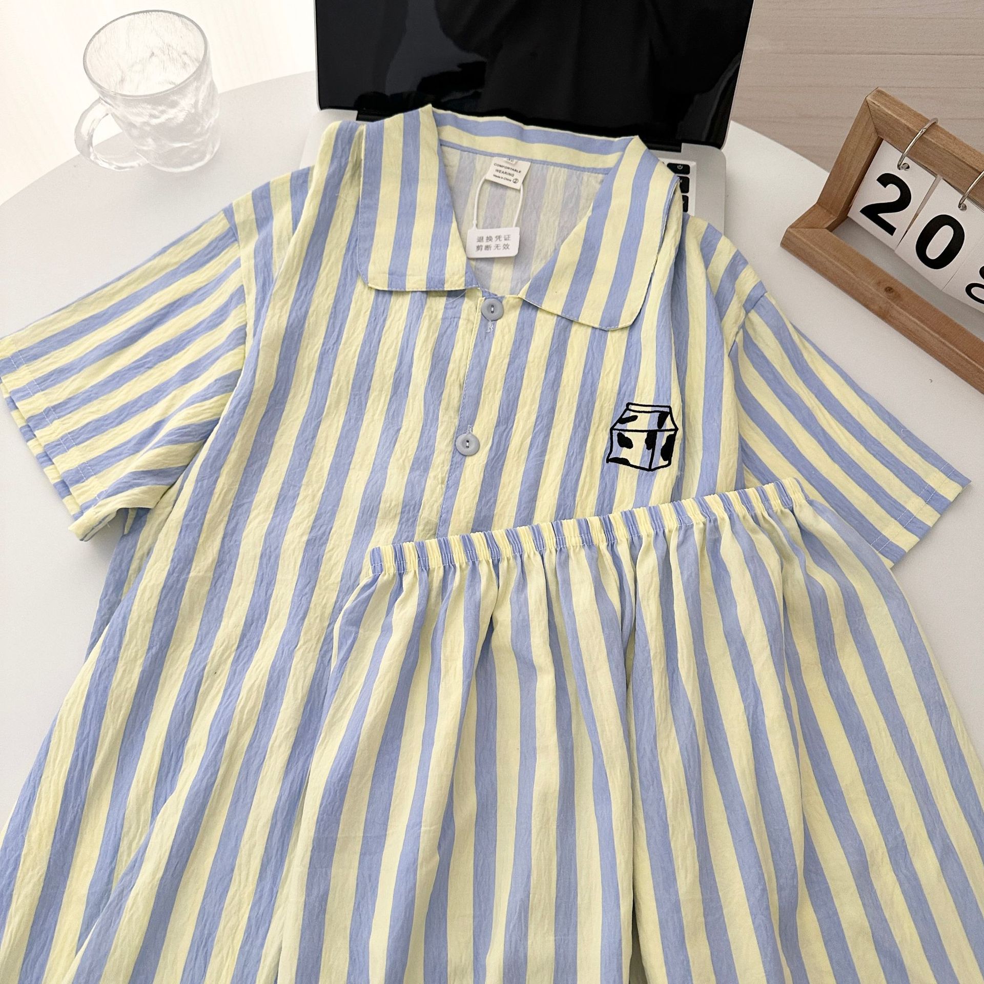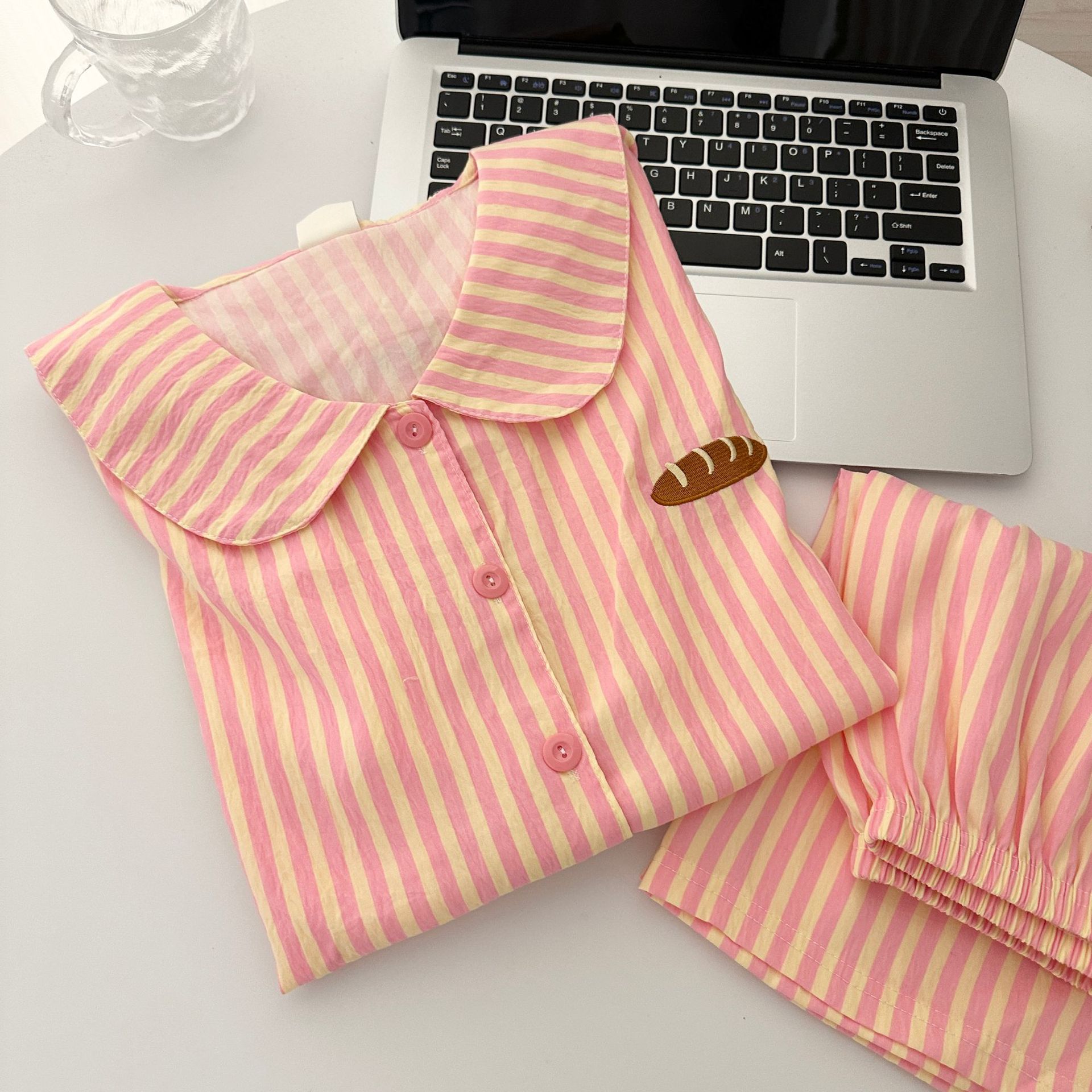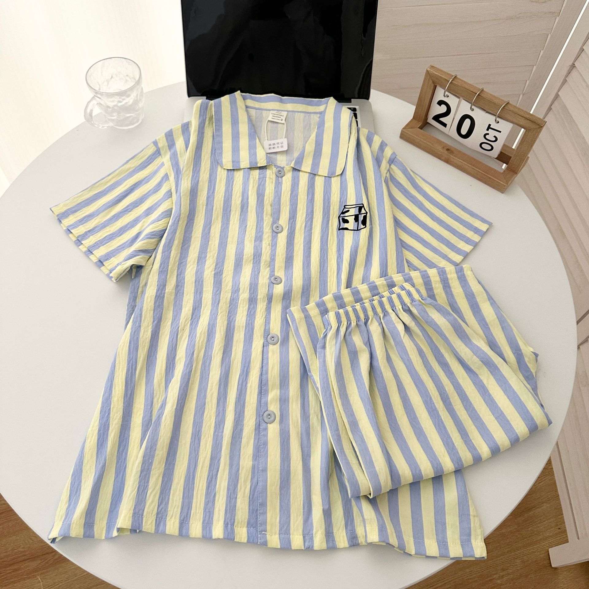 일본식 Ins 줄무늬 반팔 파자마 여성용 여름 구름 면화 반바지 남성용 빵 자수 커플 홈 의류 세트