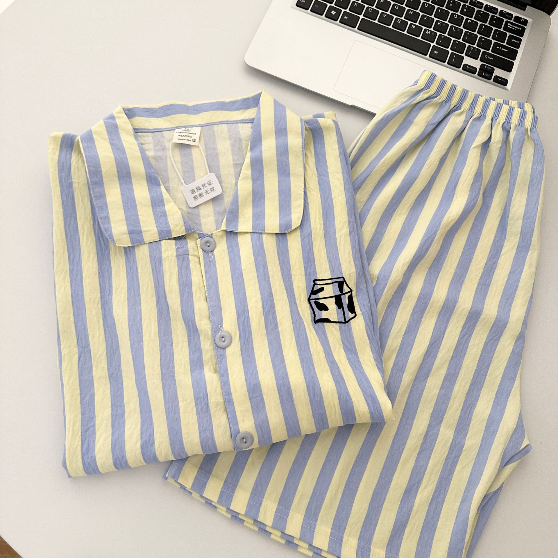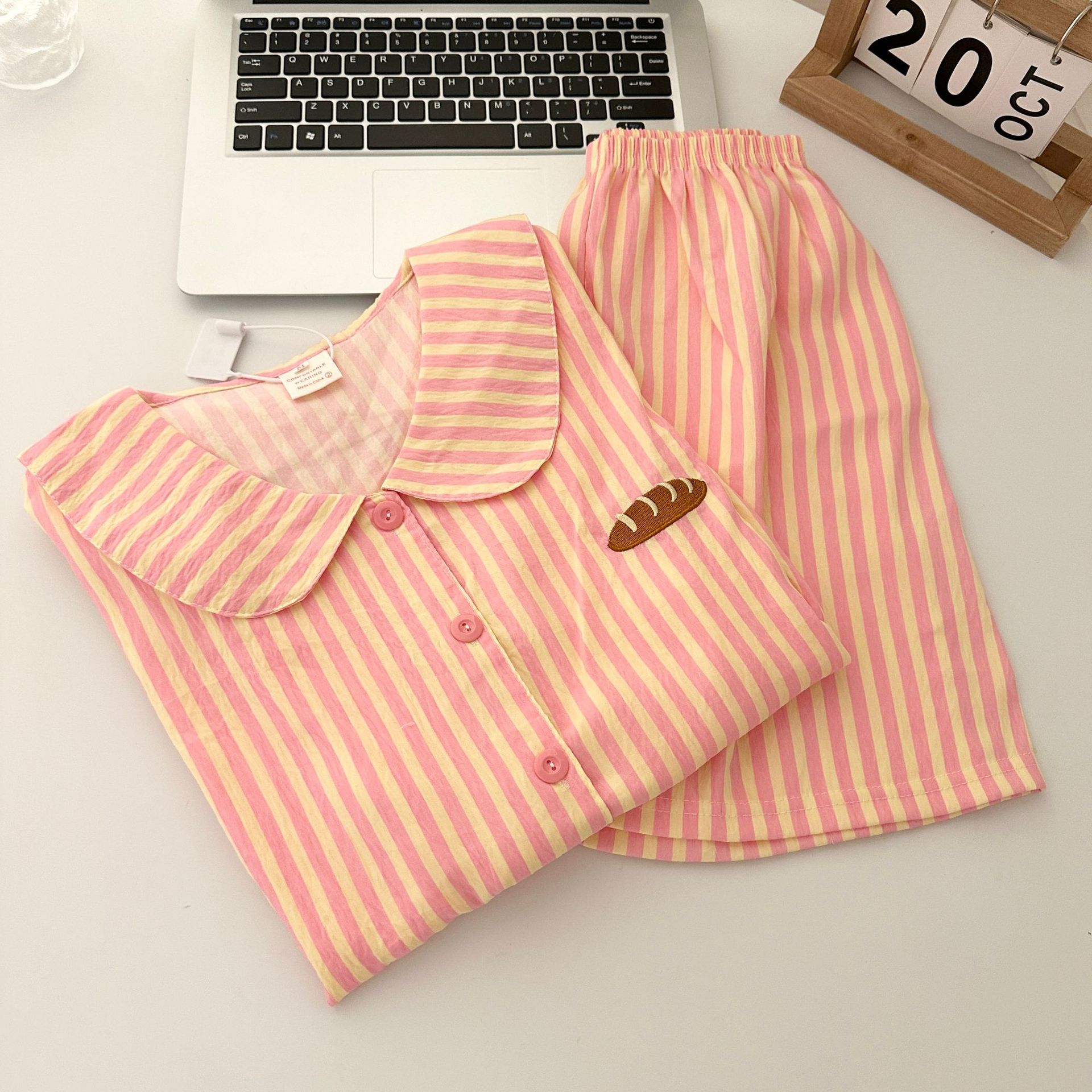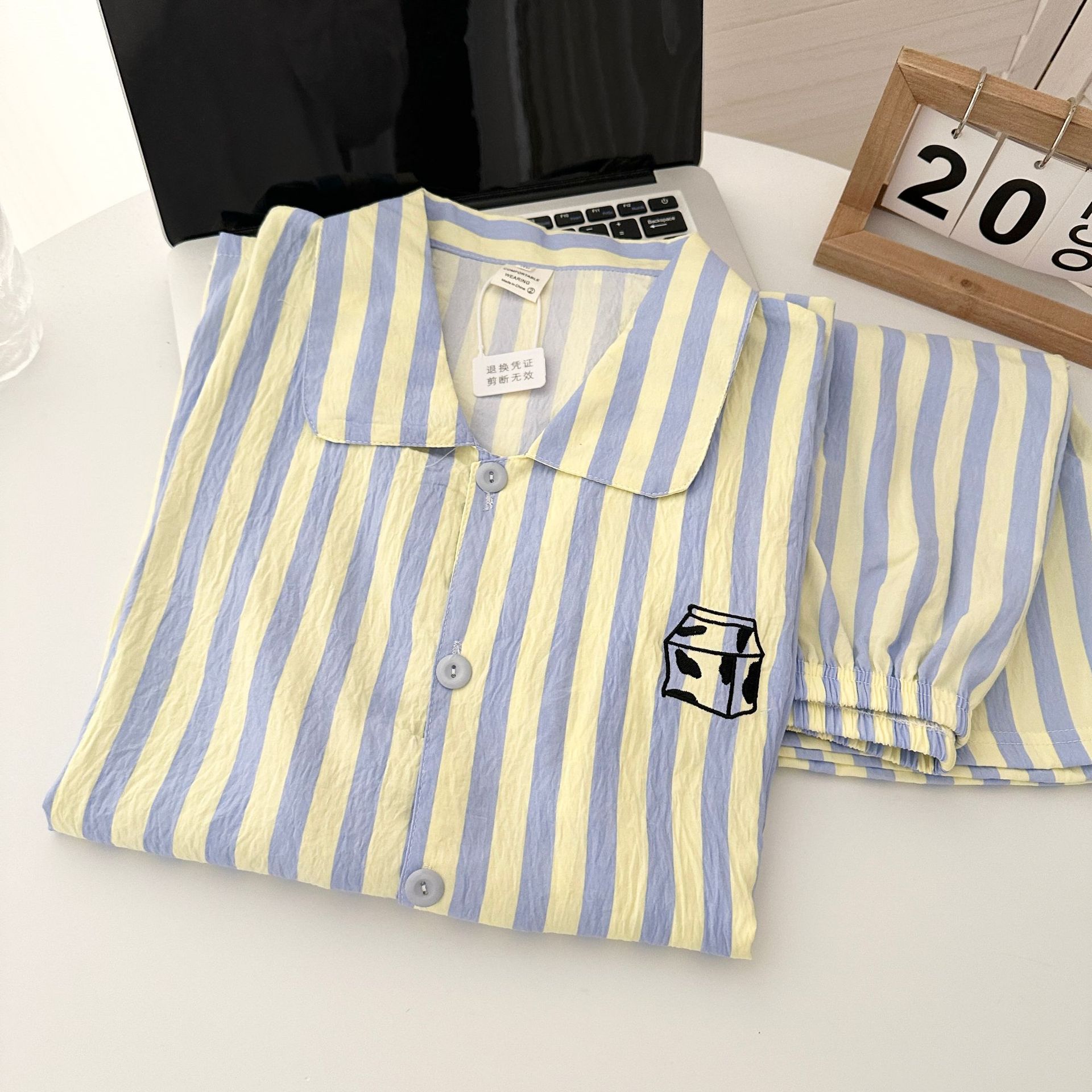 일본식 Ins 줄무늬 반팔 파자마 여성용 여름 구름 면화 반바지 남성용 빵 자수 커플 홈 의류 세트